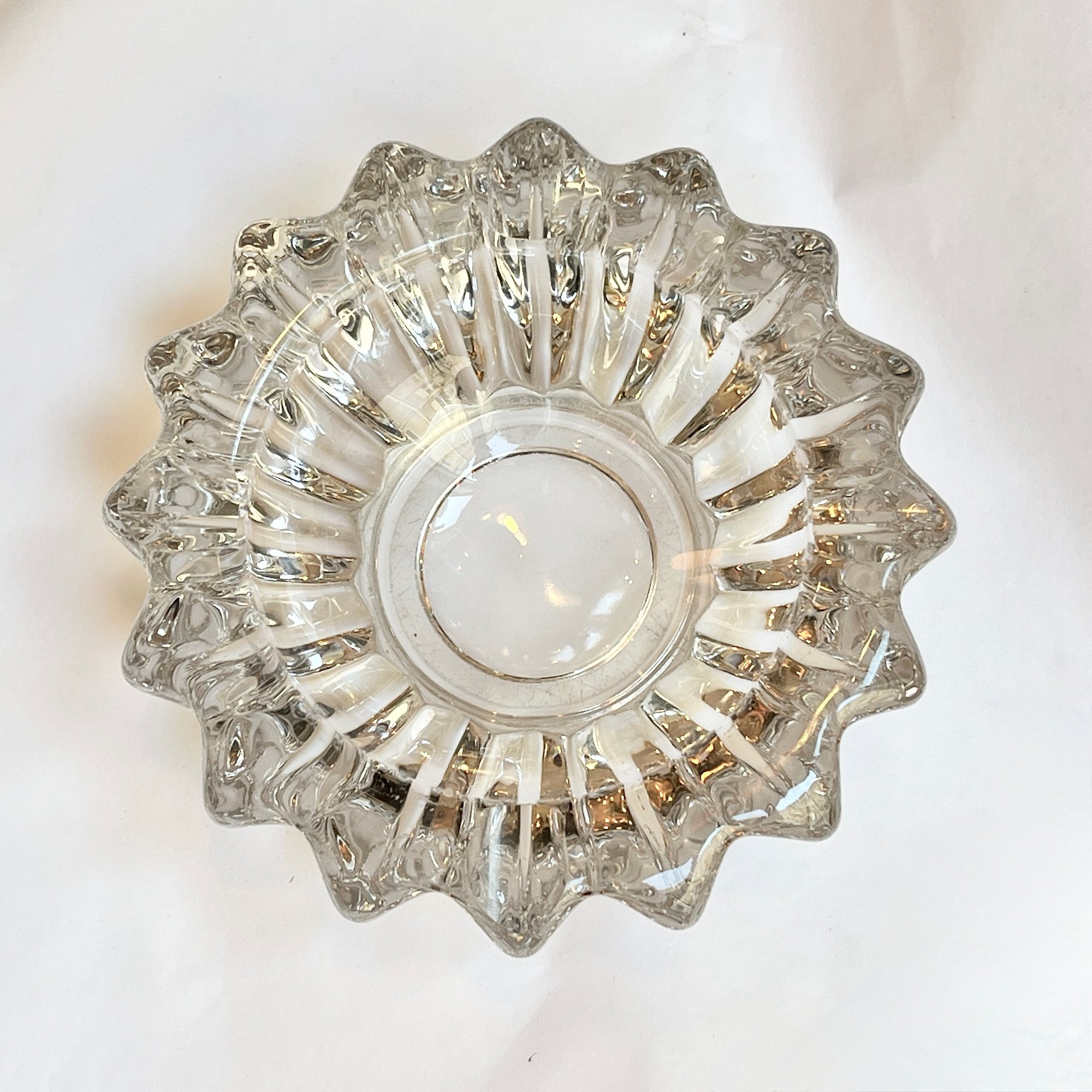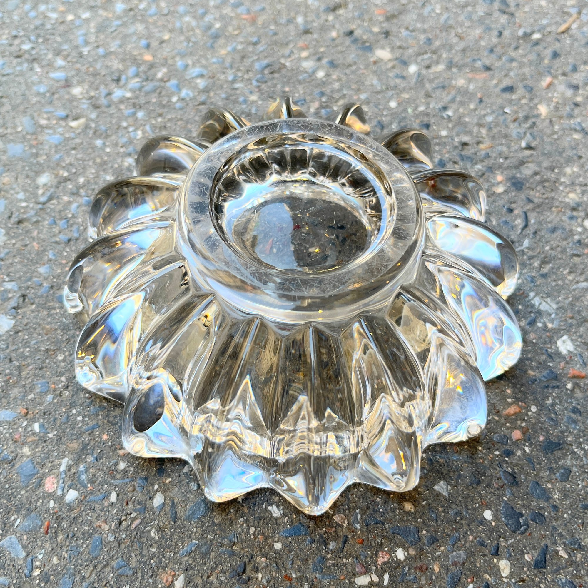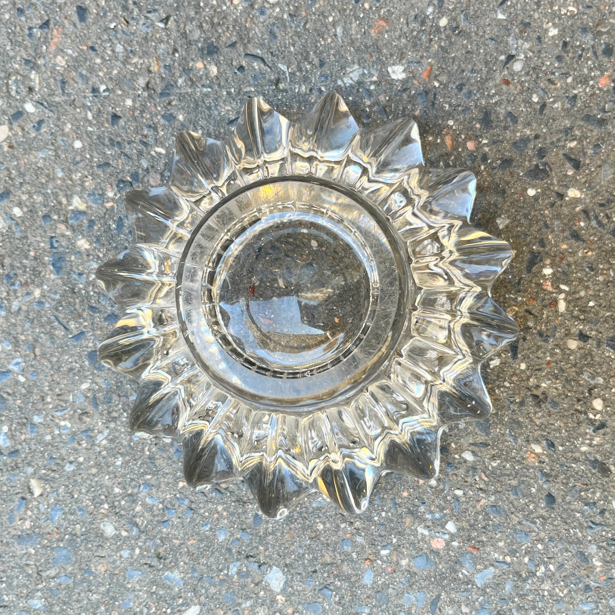 Très beau vide-poche ou cendrier Art Déco en verre pressé moulé de Pierre D'Avesn en forme de corolle ou de soleil.