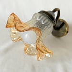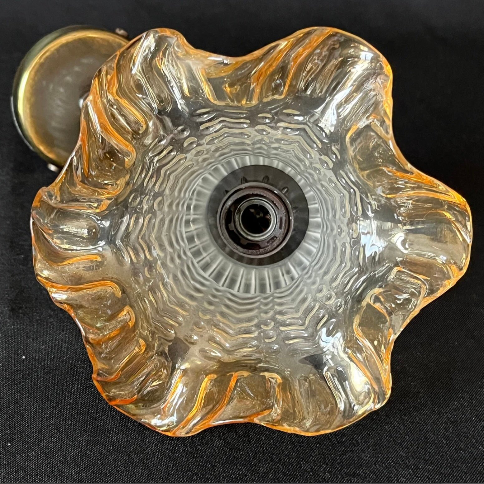 Modèle en métal patiné bronze et laiton, orné d’un diffuseur en opaline tulipe en pâte de verre. Le verre dépoli présente de subtils reflets irisés, avec une teinte jaune ambré.