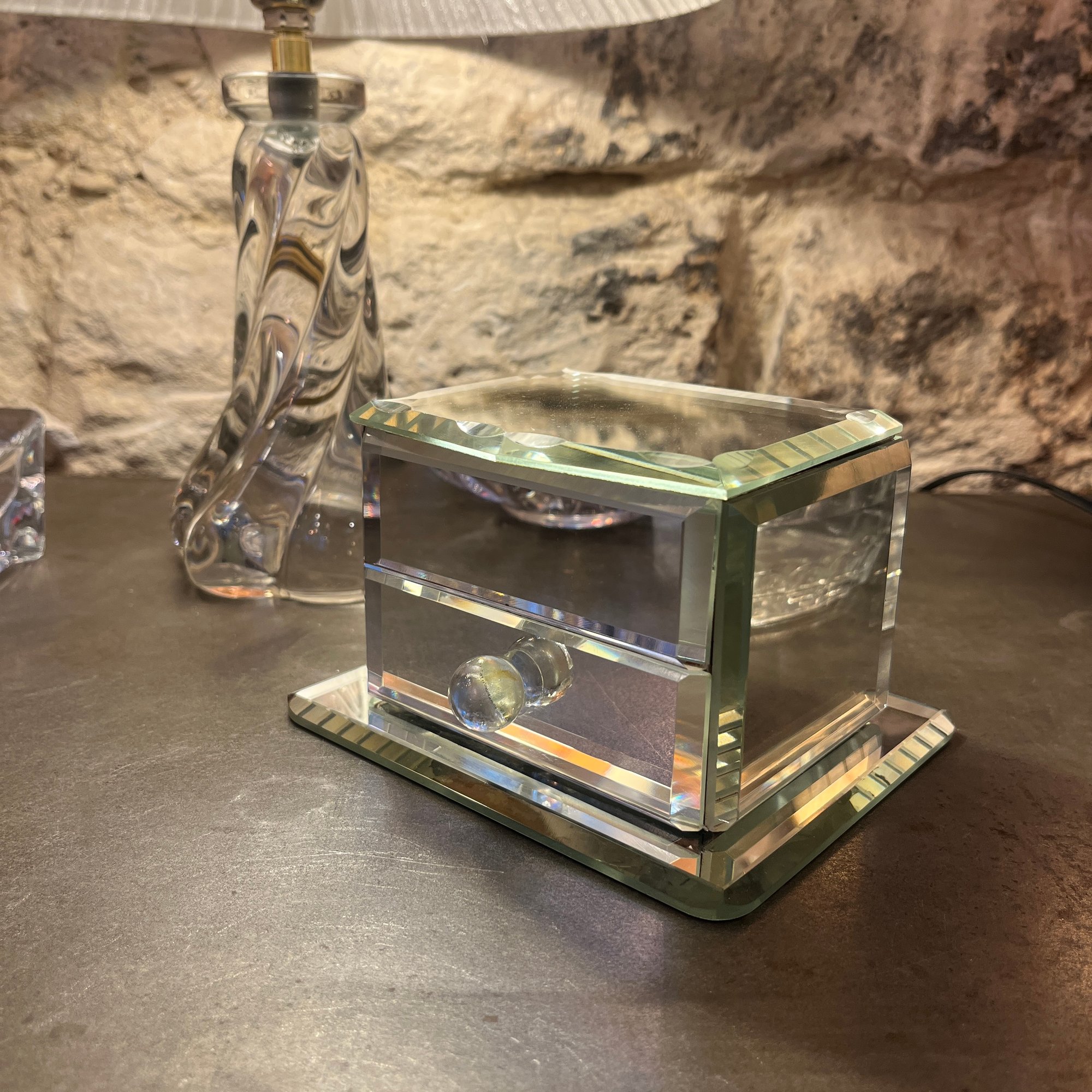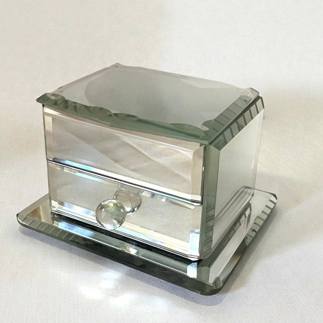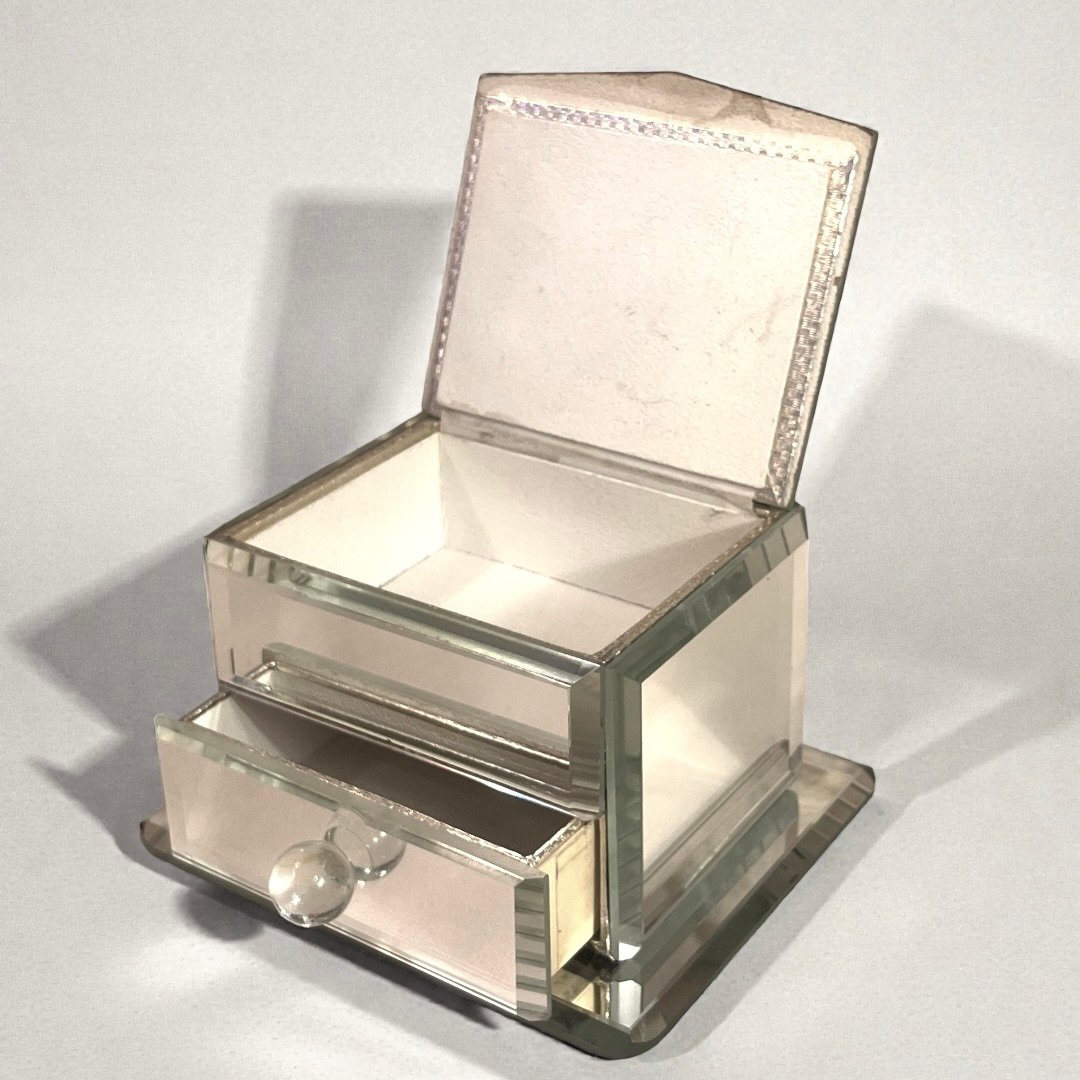 Boîte à bijoux en verre miroir Art Déco vintage avec tiroir des années 1940.