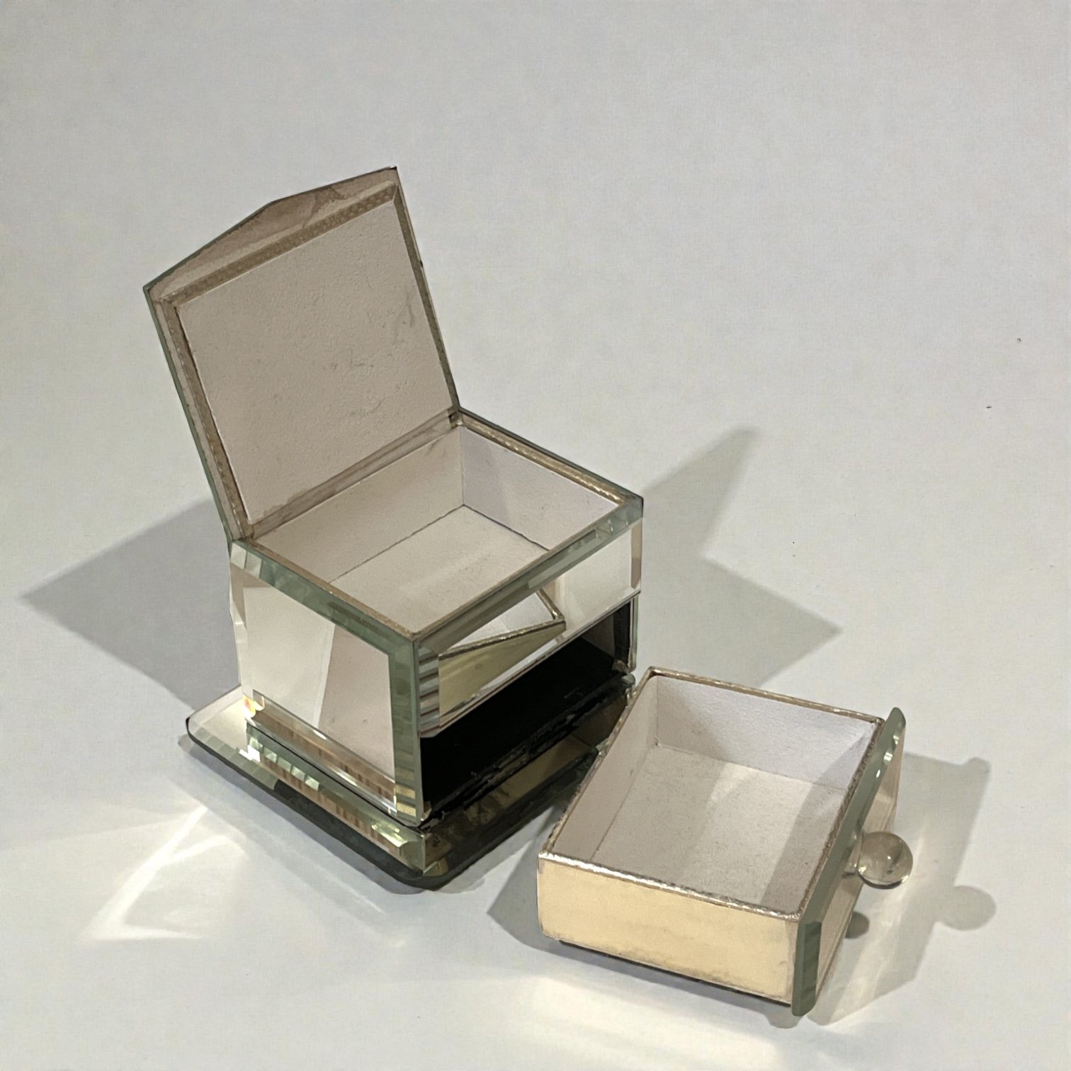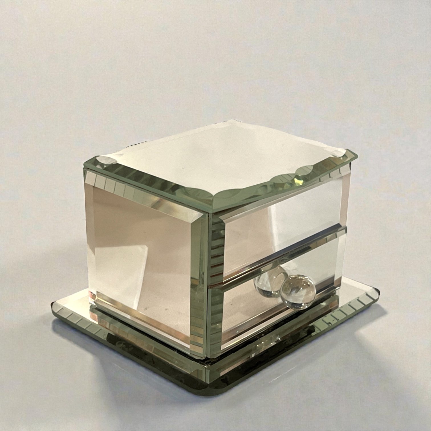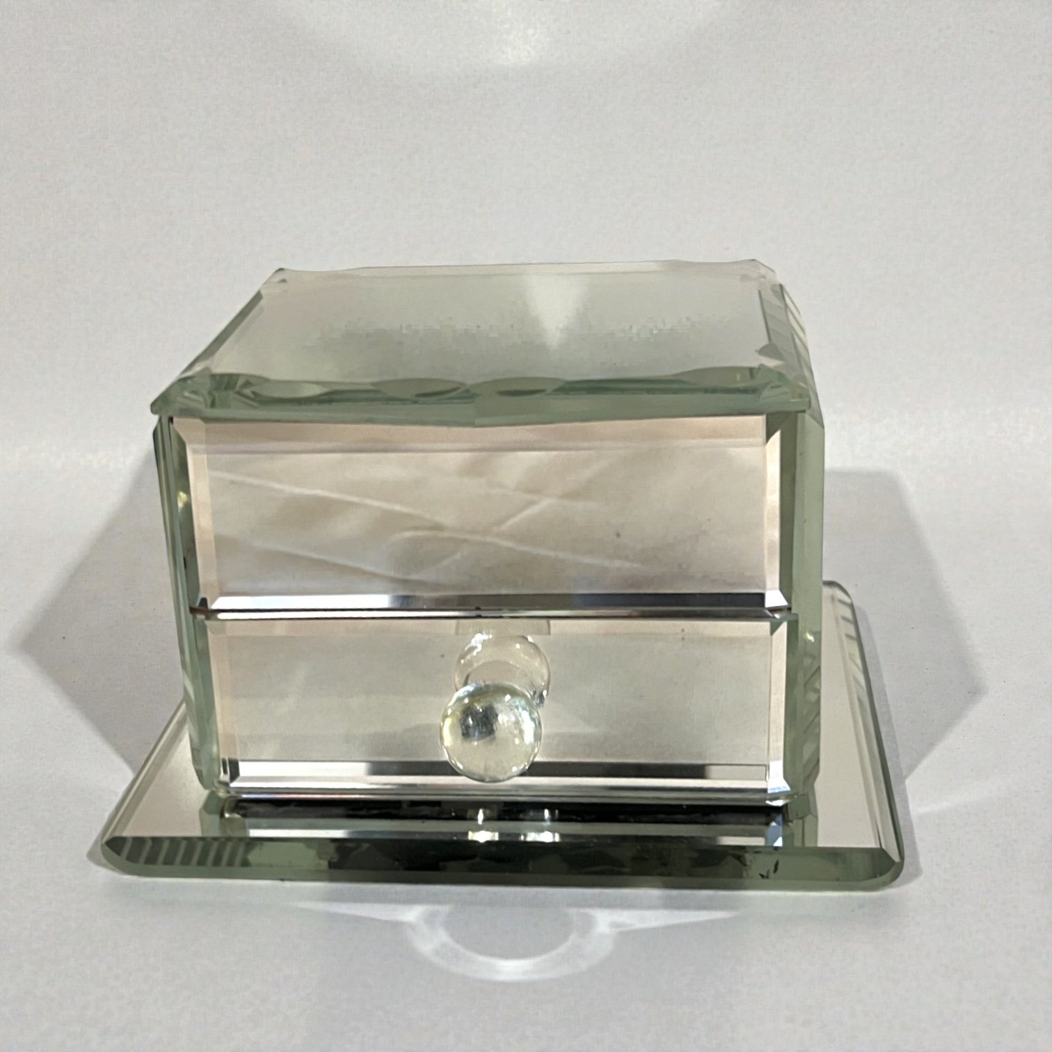 Boîte à bijoux en verre miroir Art Déco vintage avec tiroir des années 1940.