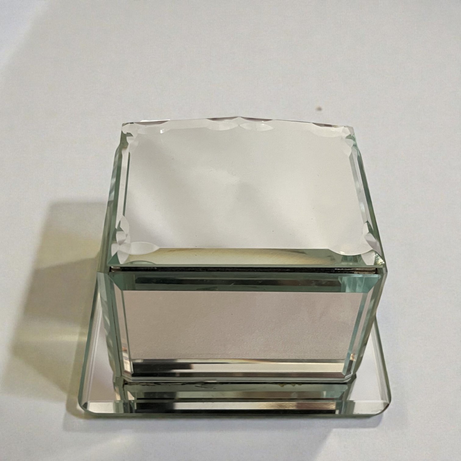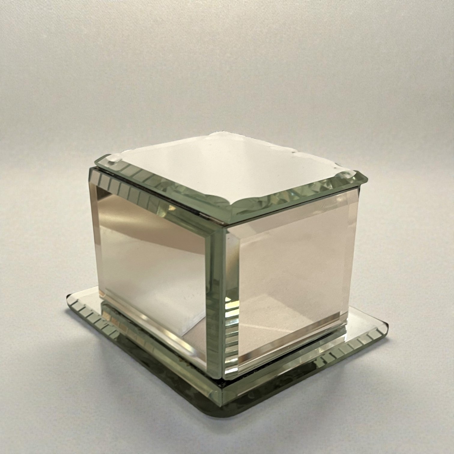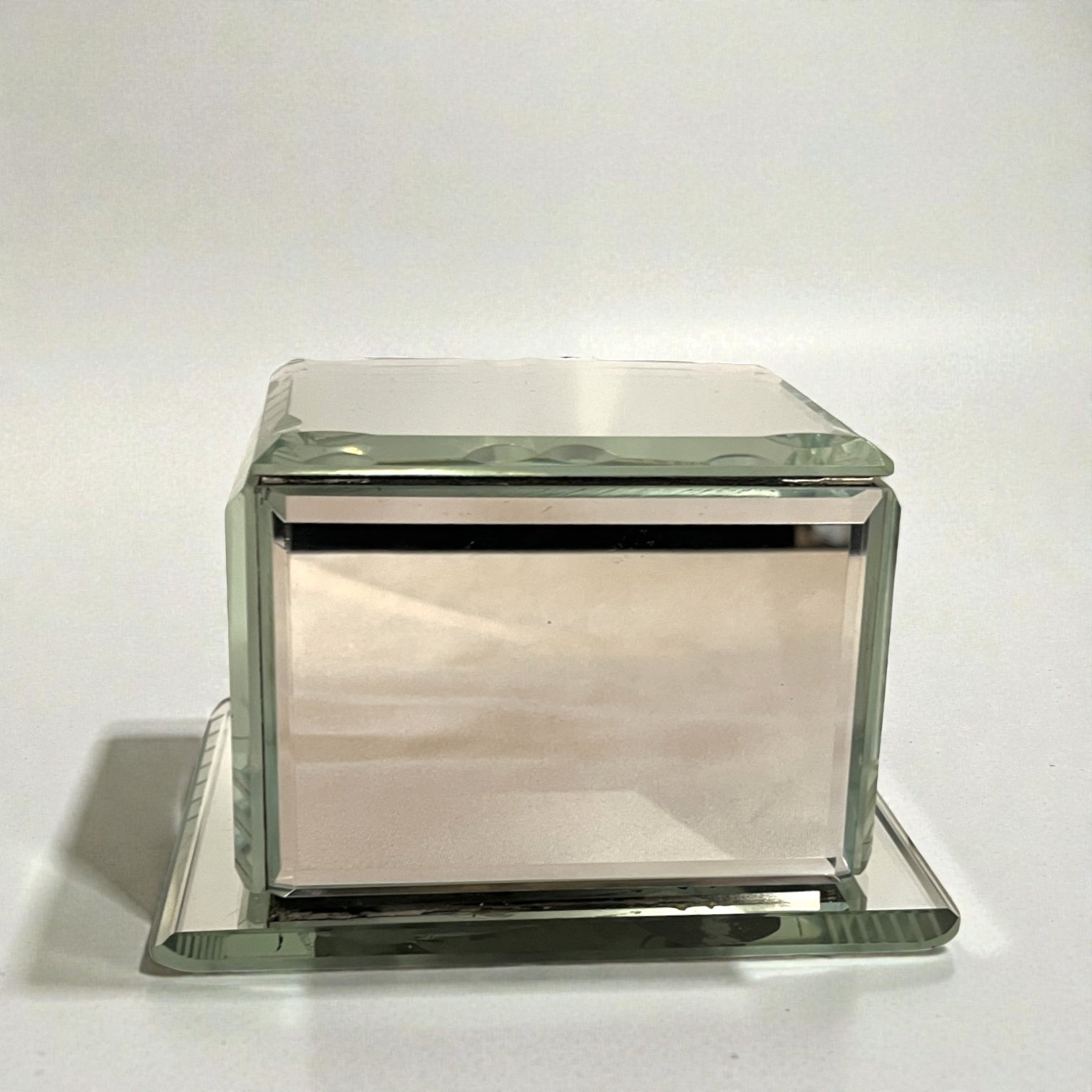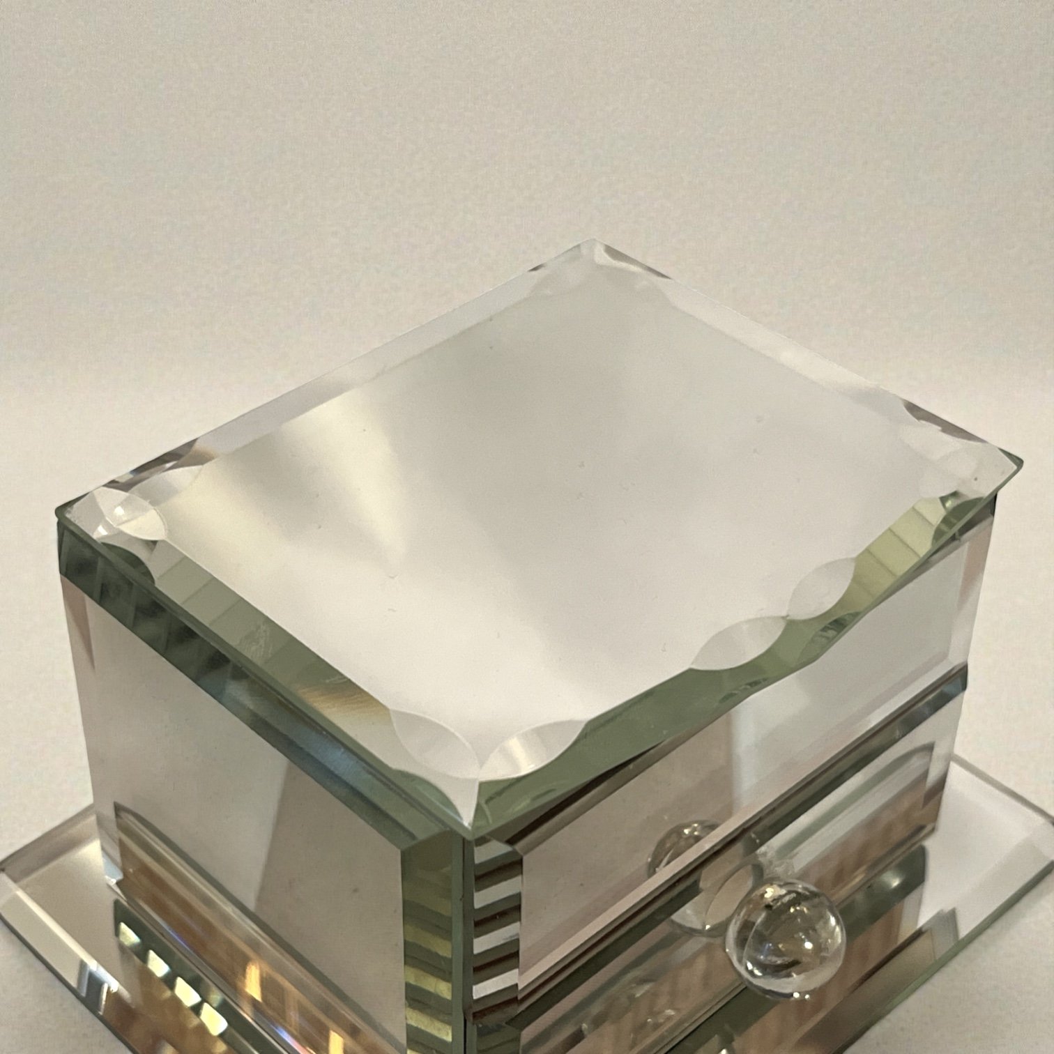 Elégante boîte à bijoux Art Déco en verre miroir à bords biseautés datant des années 1940.