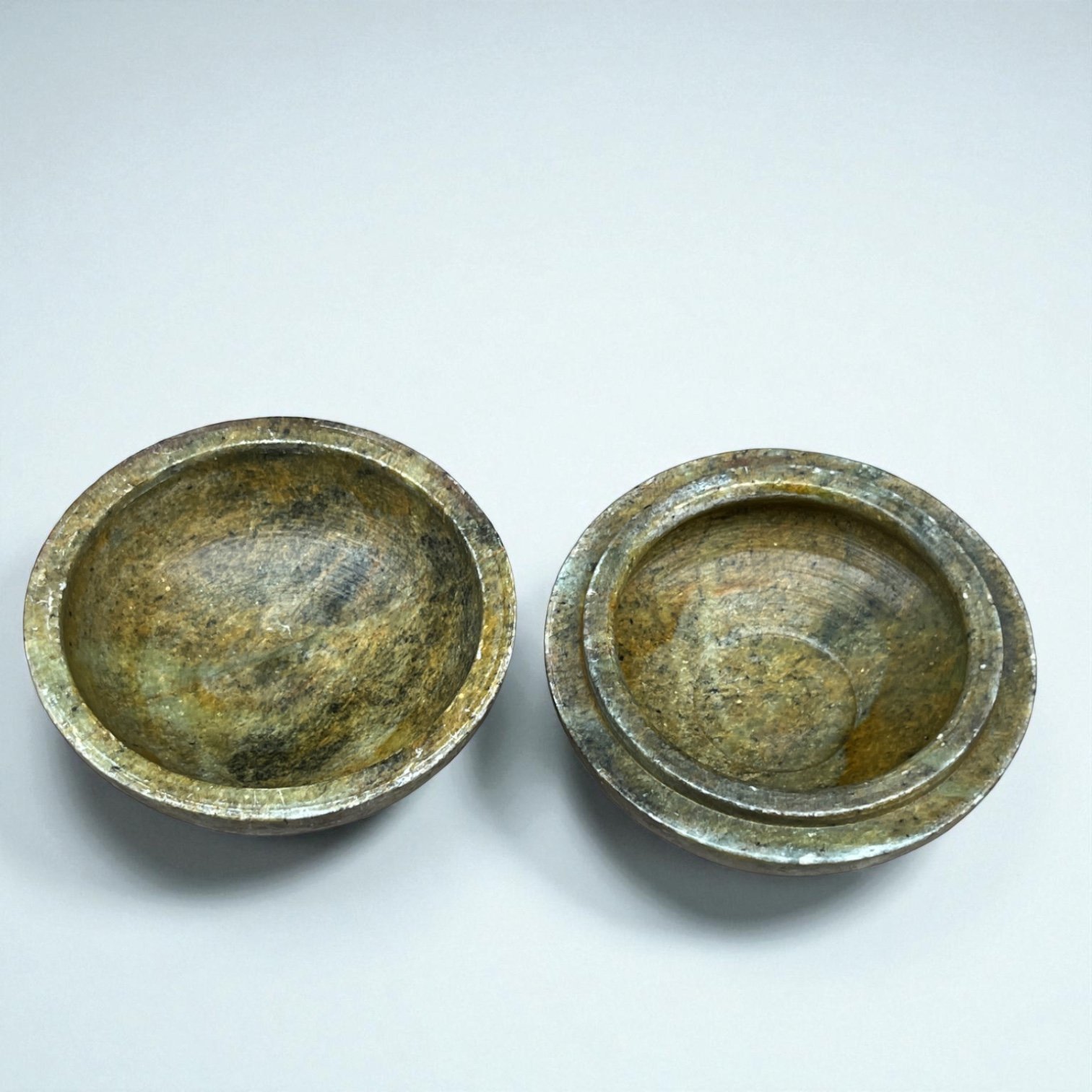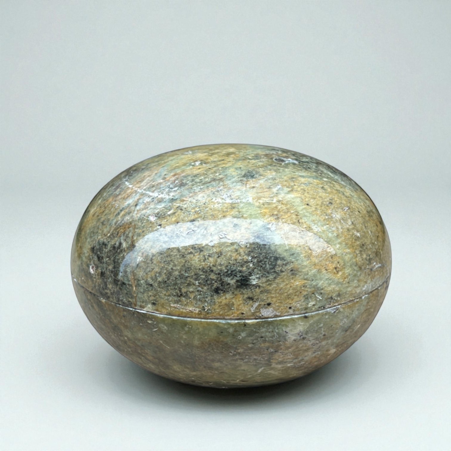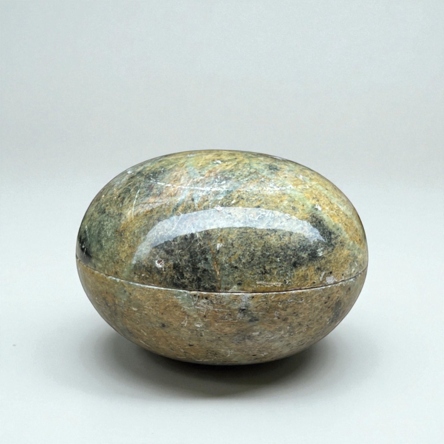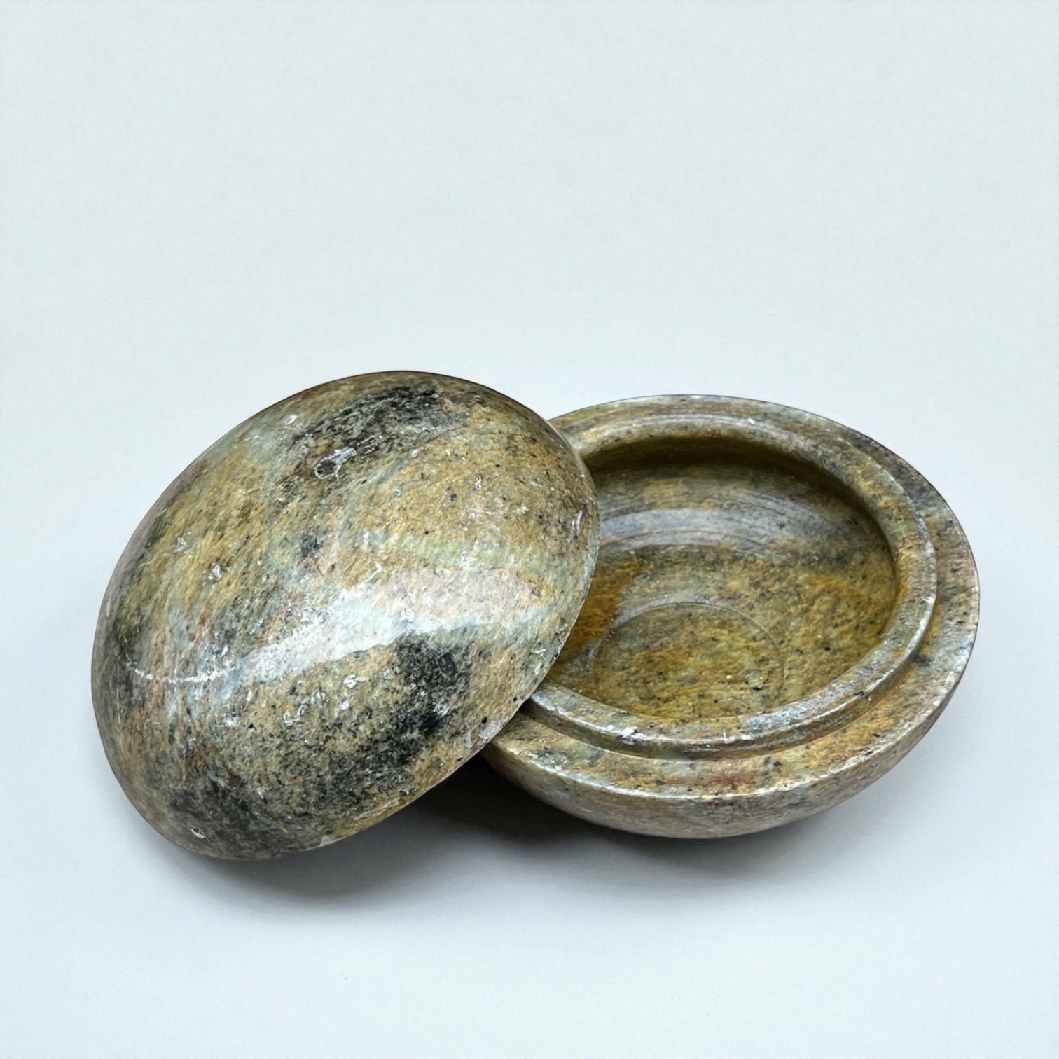 Boîte ronde en pierre naturelle verte sculptée et polie à la main des années 70.