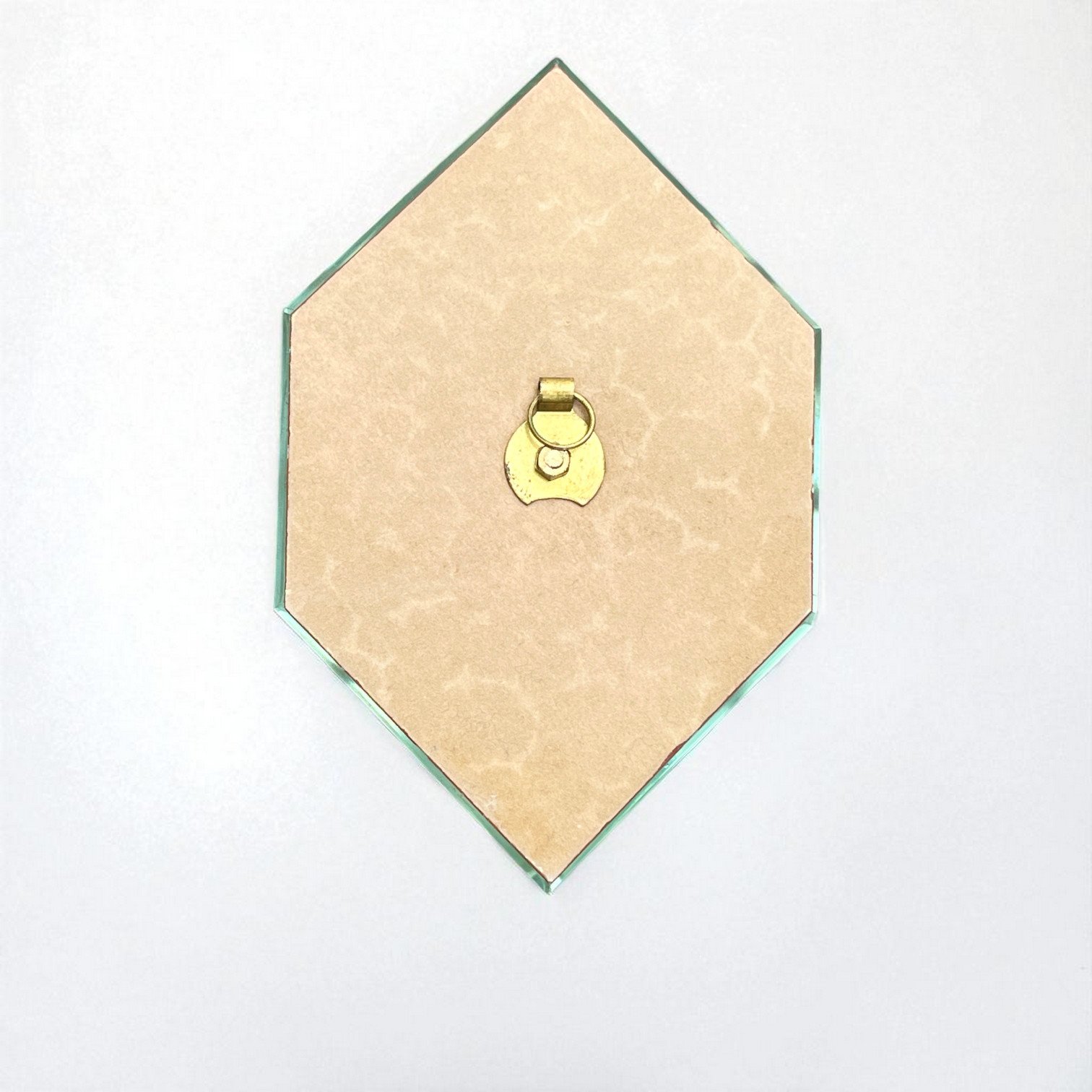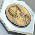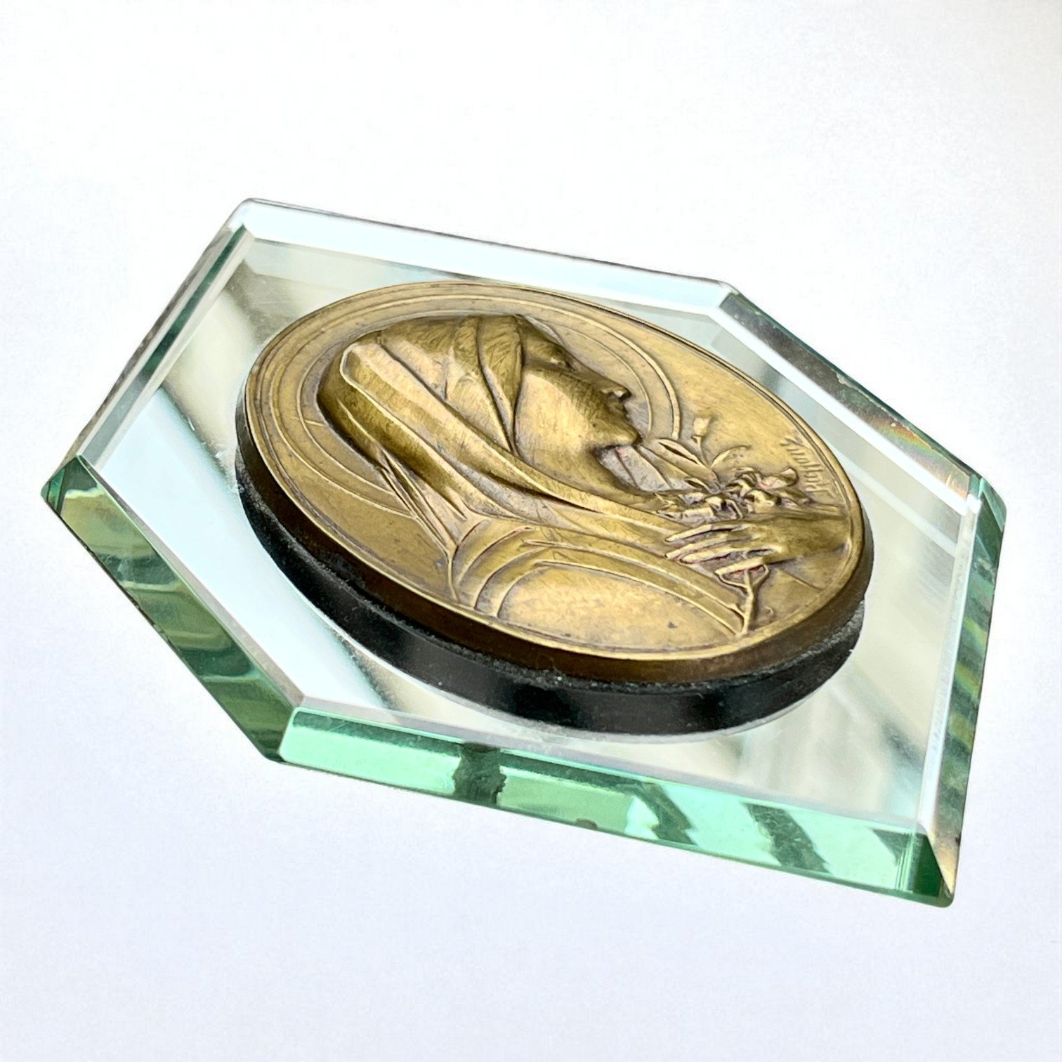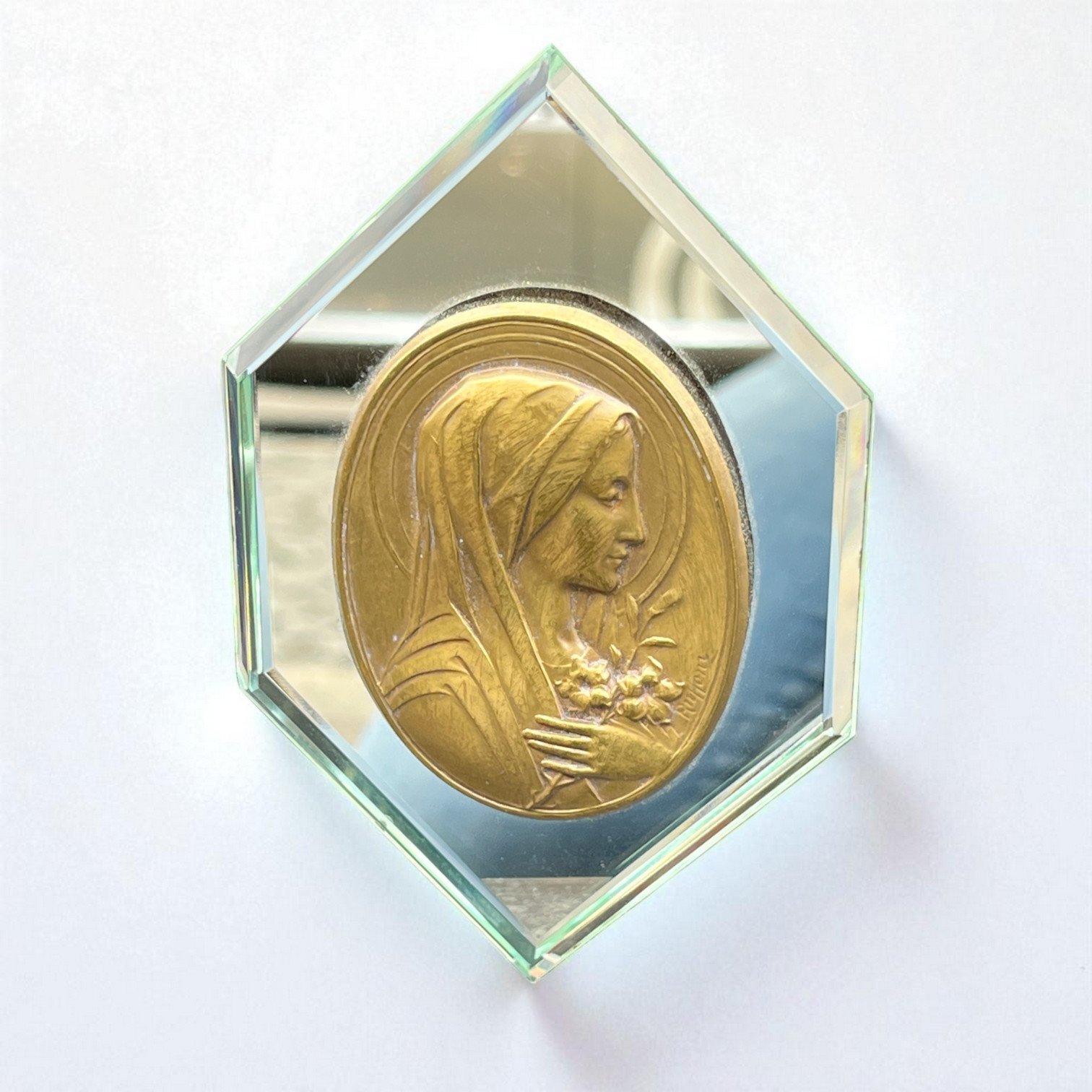 Charmant petit cadre ancien en verre miroir hexagonal orné d’un médaillon en bronze représentant la Vierge Marie en bas-relief, signé Ruffony.