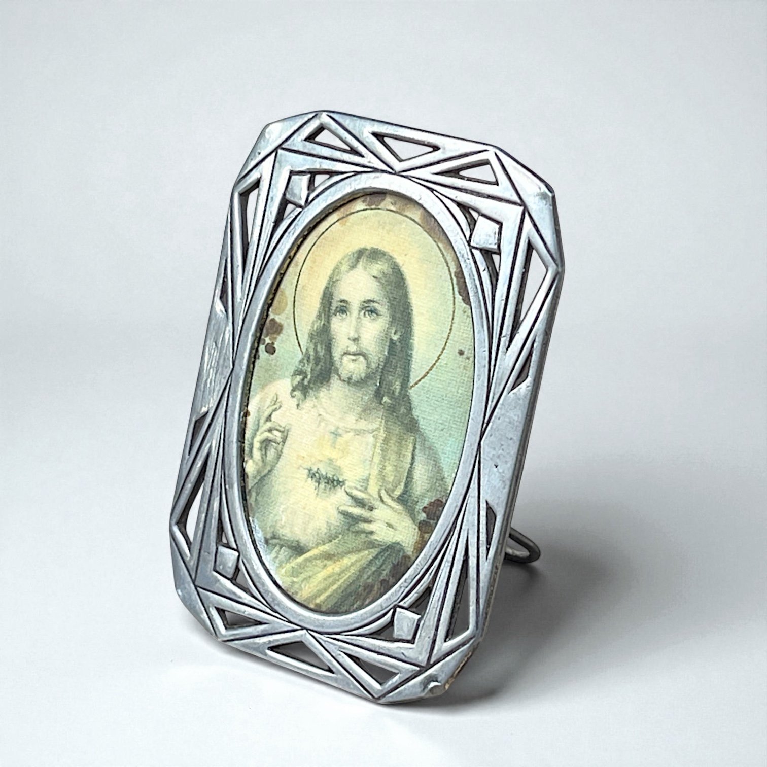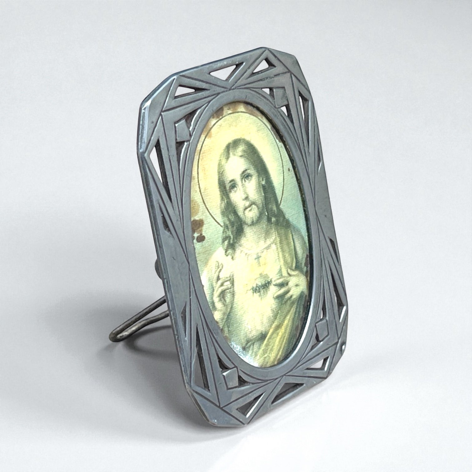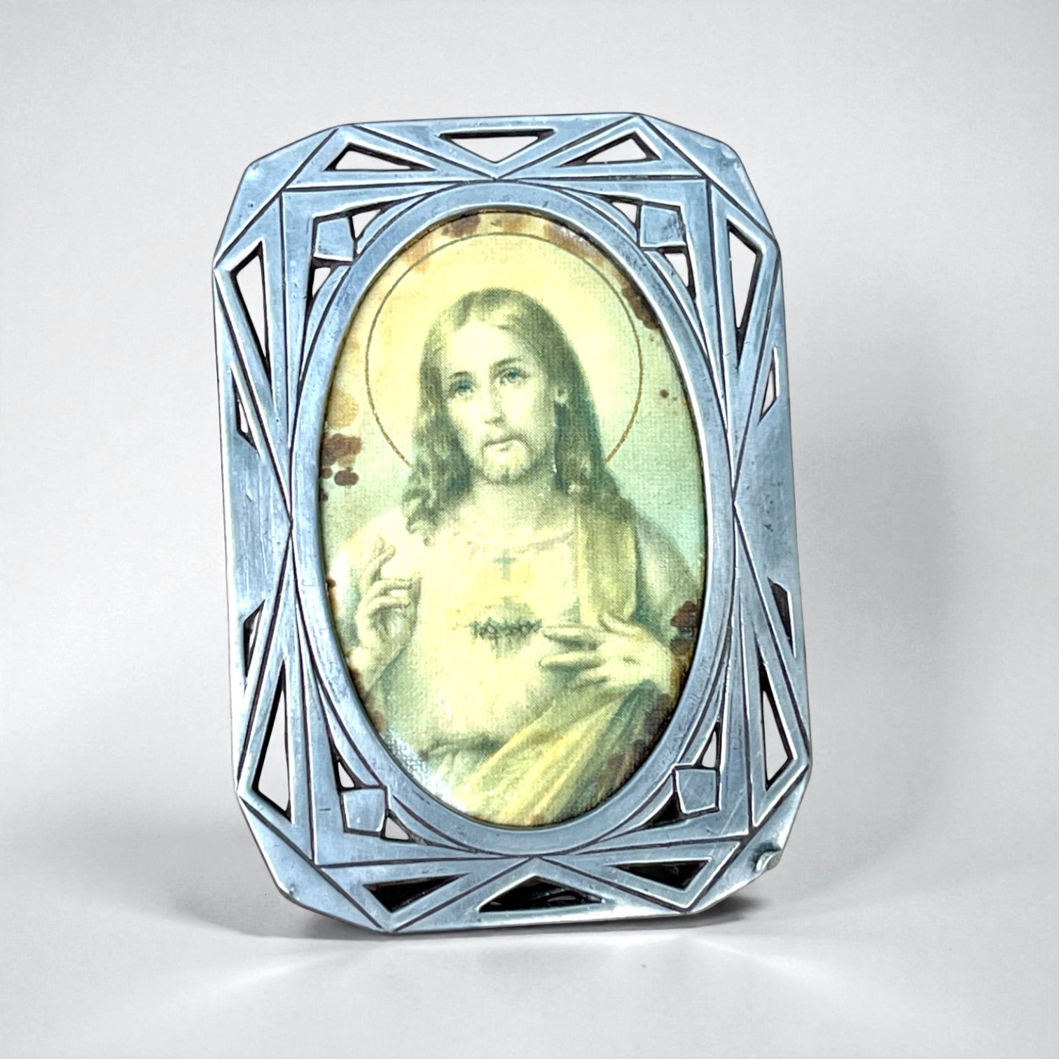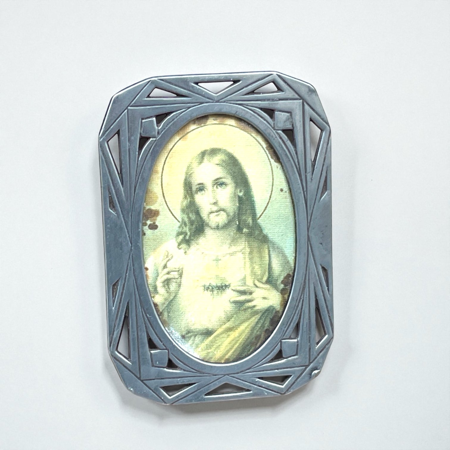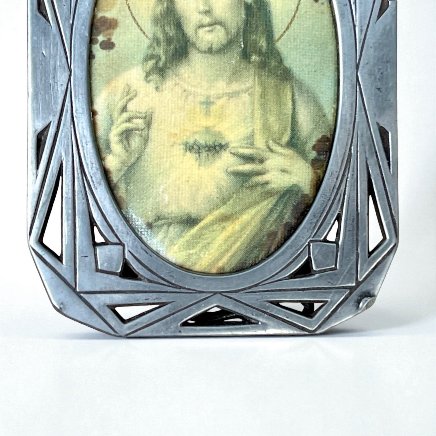 Cadre Art déco religieux ancien en étain - Sacré-Cœur de Jésus - cadre vintage 1930