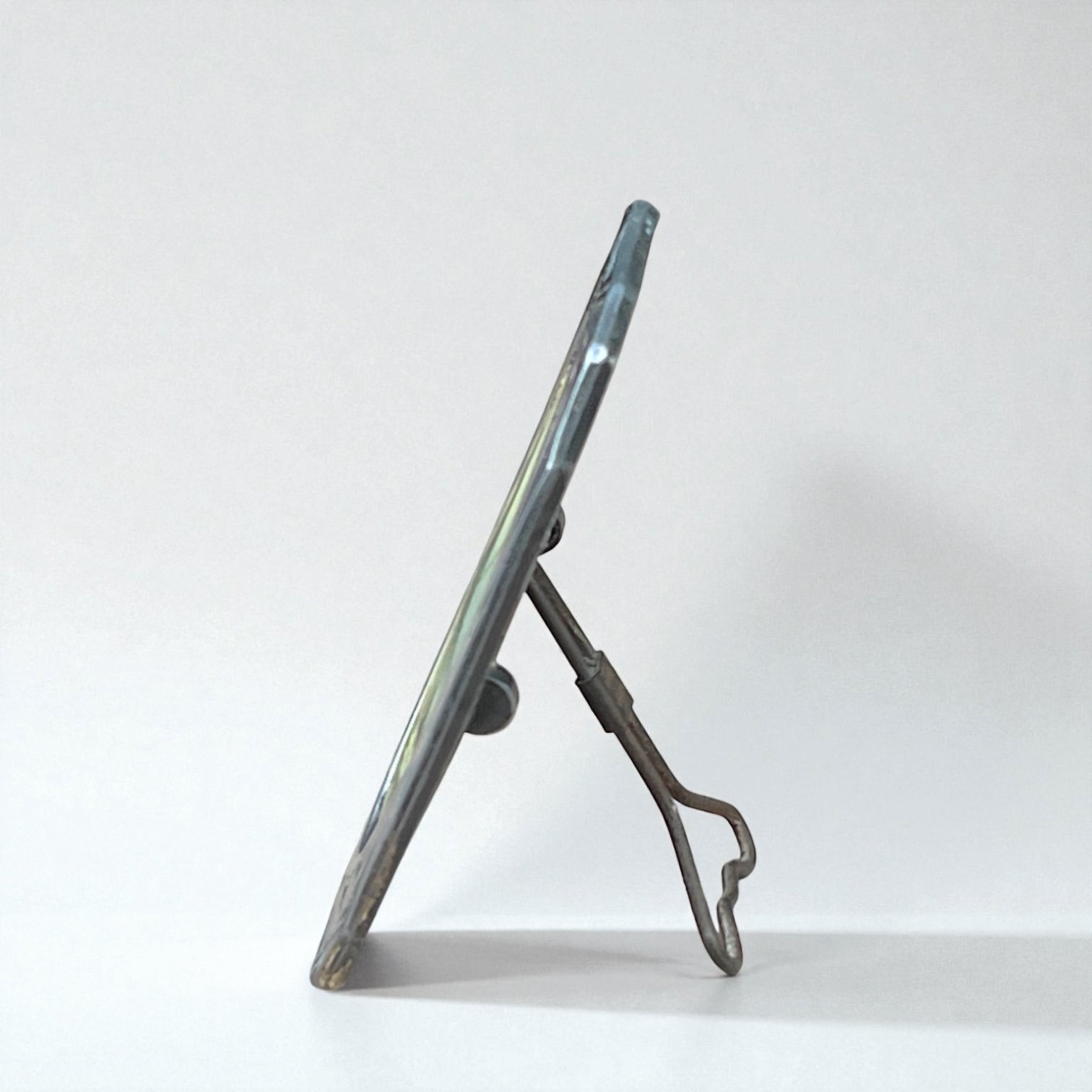 Le cadre présente un décor ajouré typique du style Art déco des années 1930, et repose sur un support métallique repliable à l’arrière.