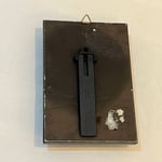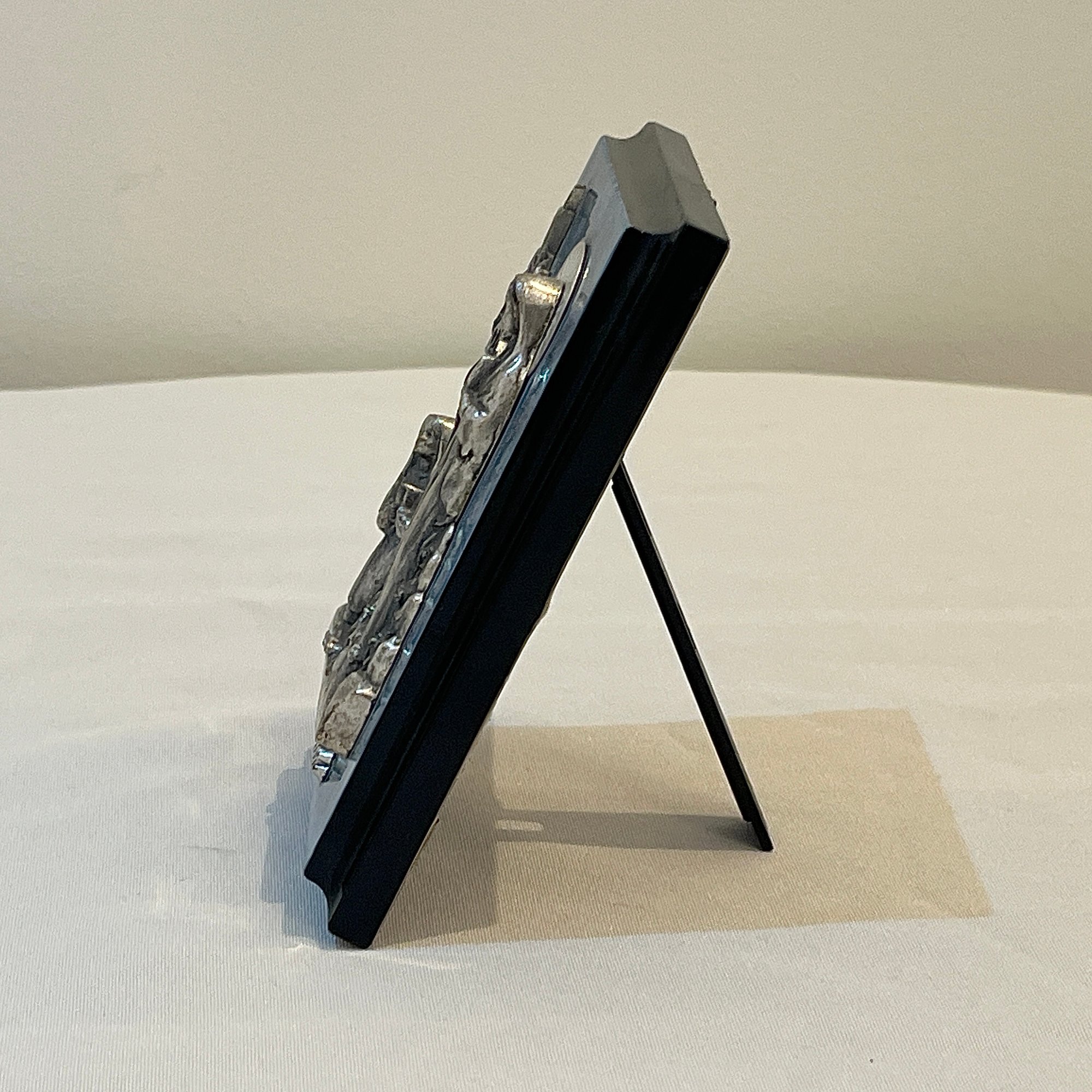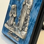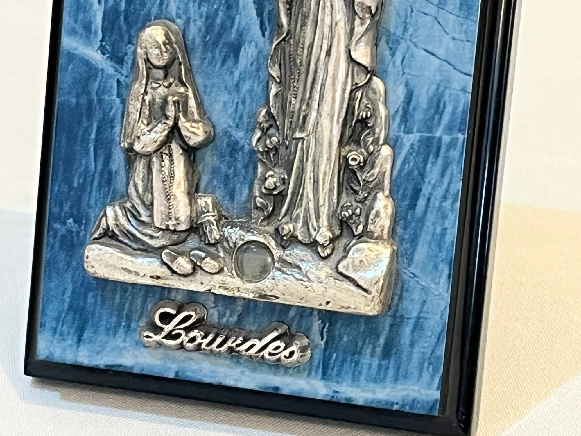 Cadre à accrocher ou poser d'un souvenir religieux datant des années 60 - 70 d'un pèlerinage à Lourdes représentant Bernadette Soubirous et la Sainte Vierge Marie, avec la basilique, en métal argenté en relief ciselé à lamait sur un fond en plastique imitation marbre bleu et noir.
