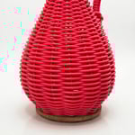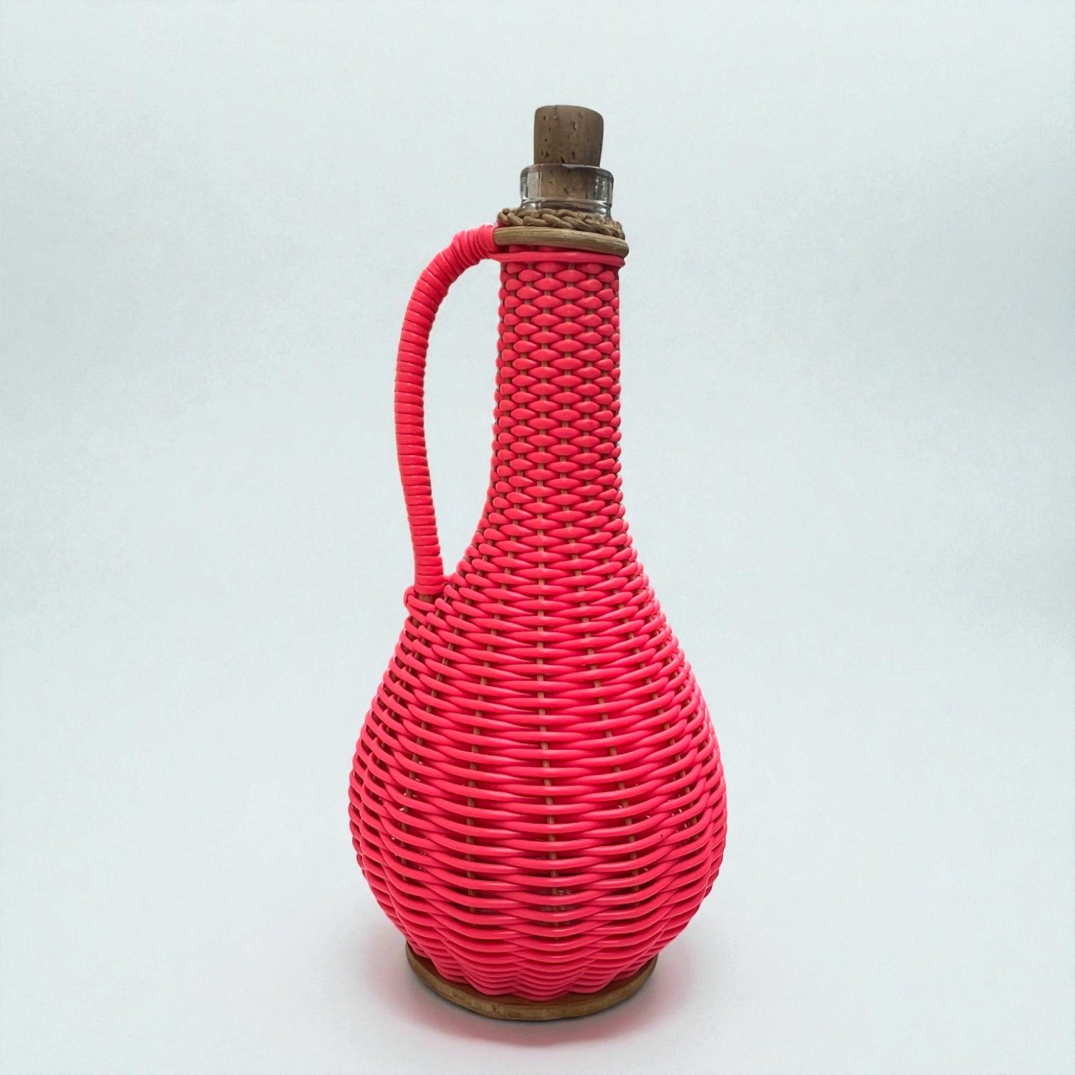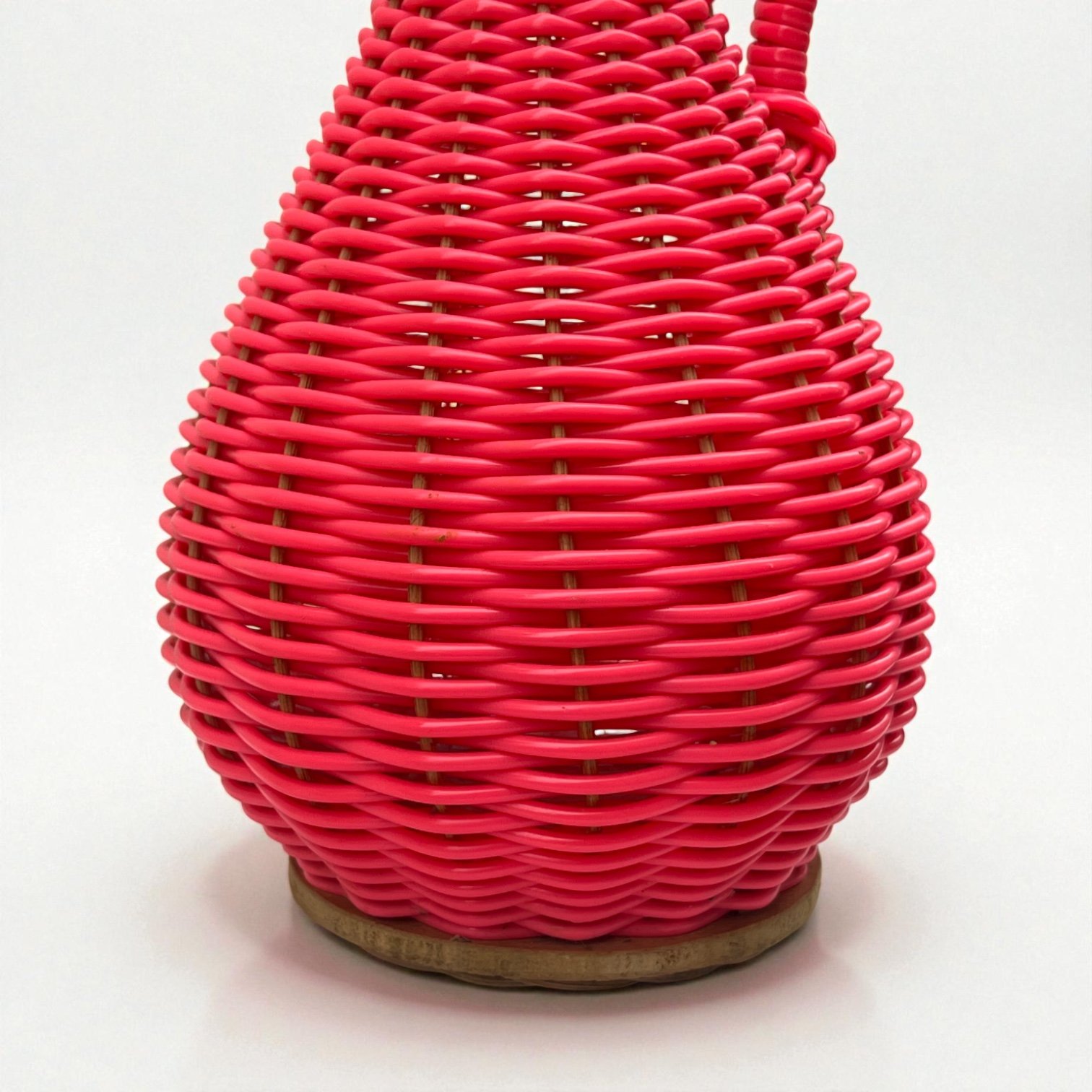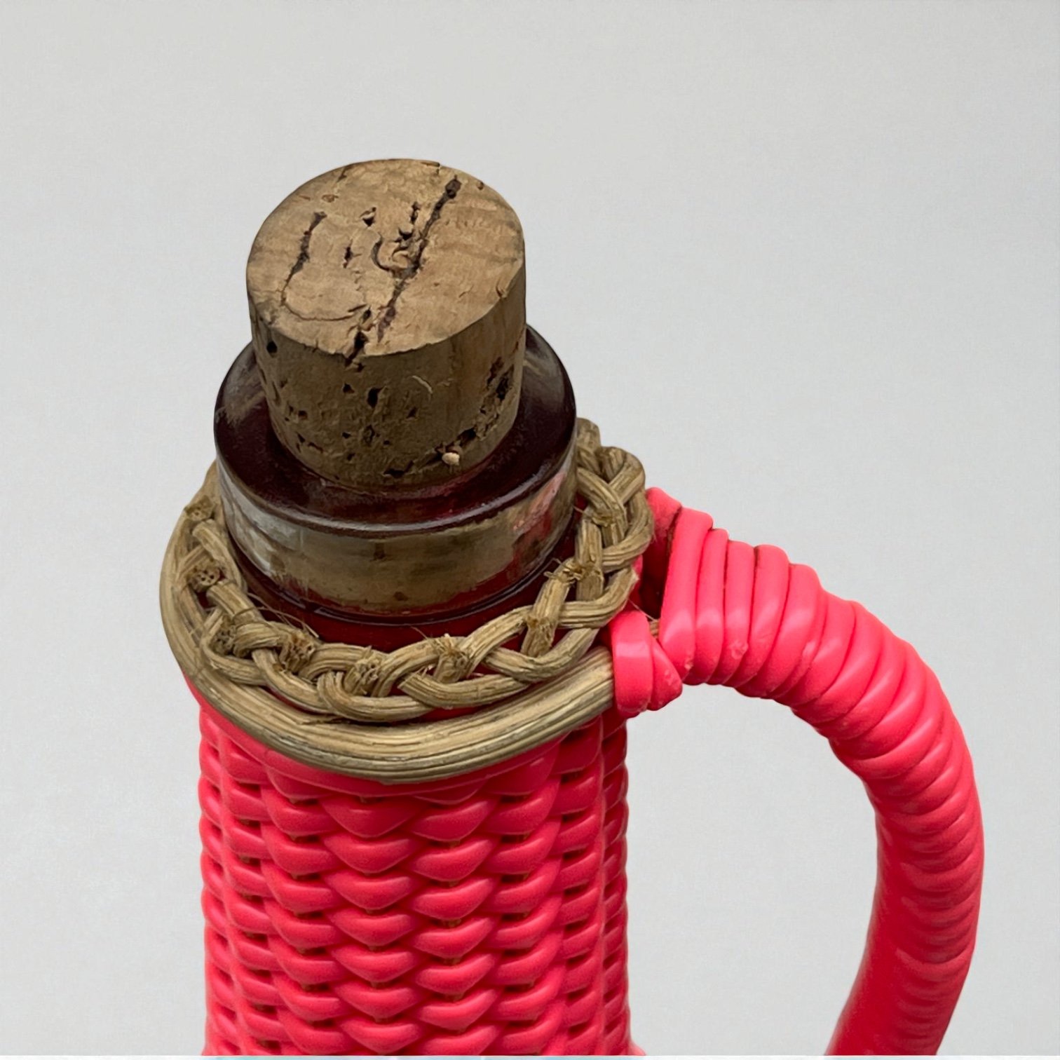 Cette carafe en verre est entièrement recouverte d’un tressage en plastique scoubidou, dans une teinte rose vif éclatante, avec une anse assortie et un bouchon en liège.