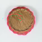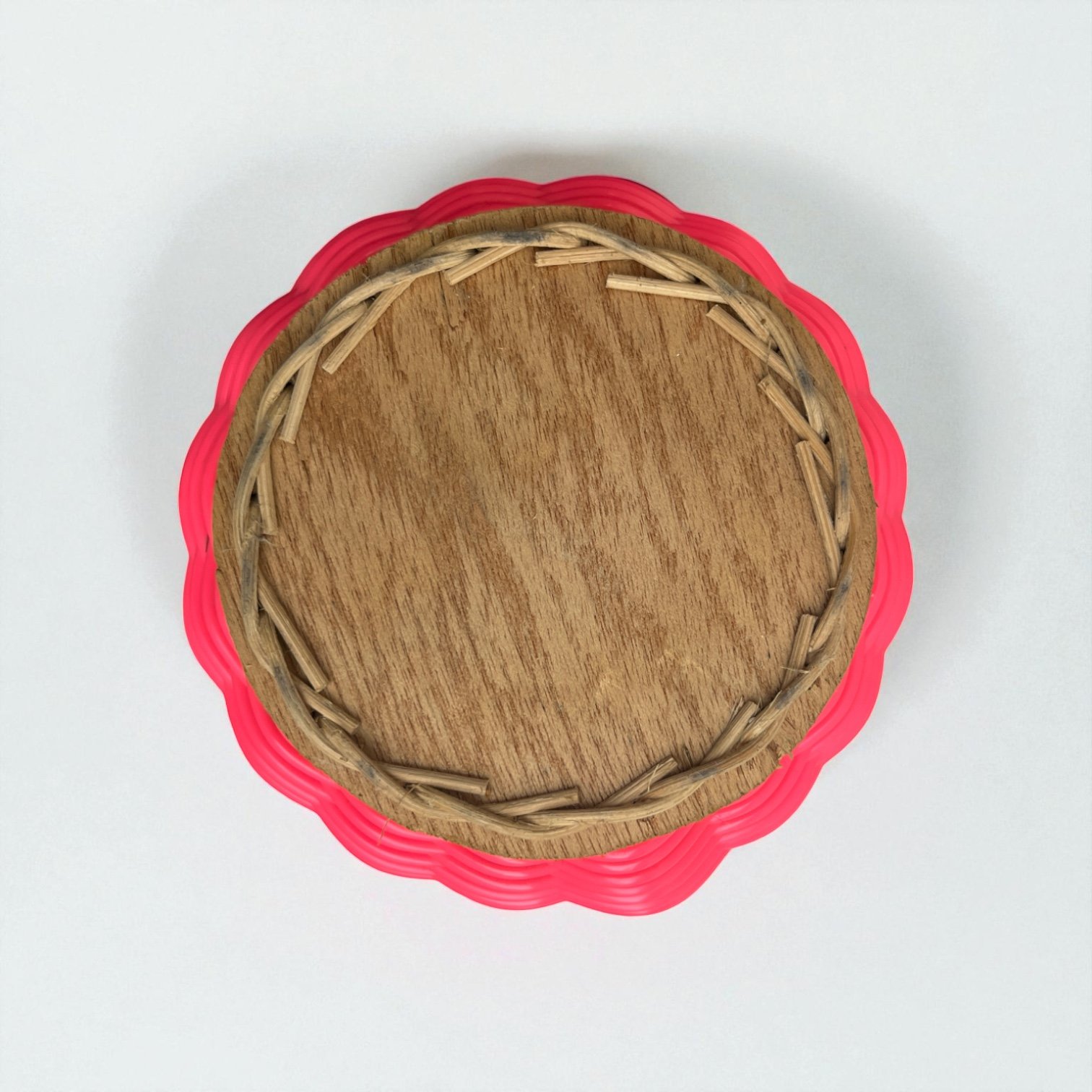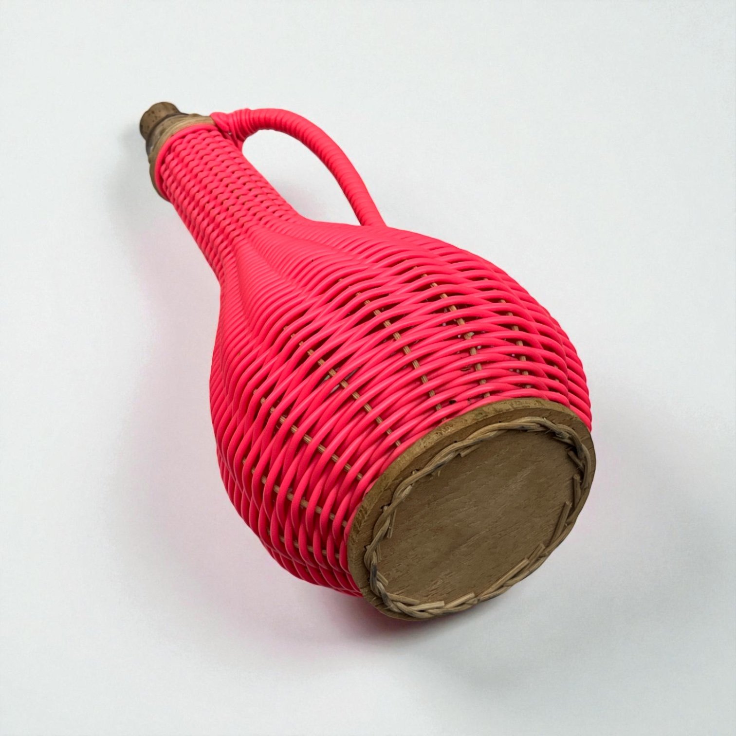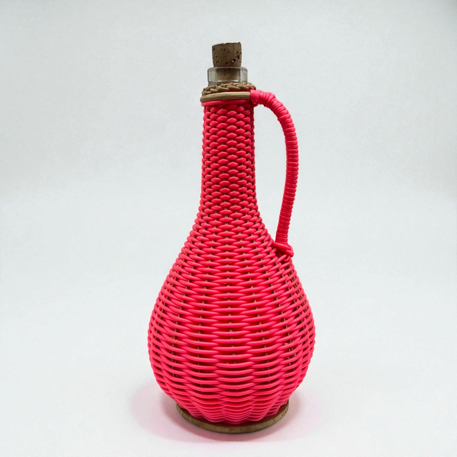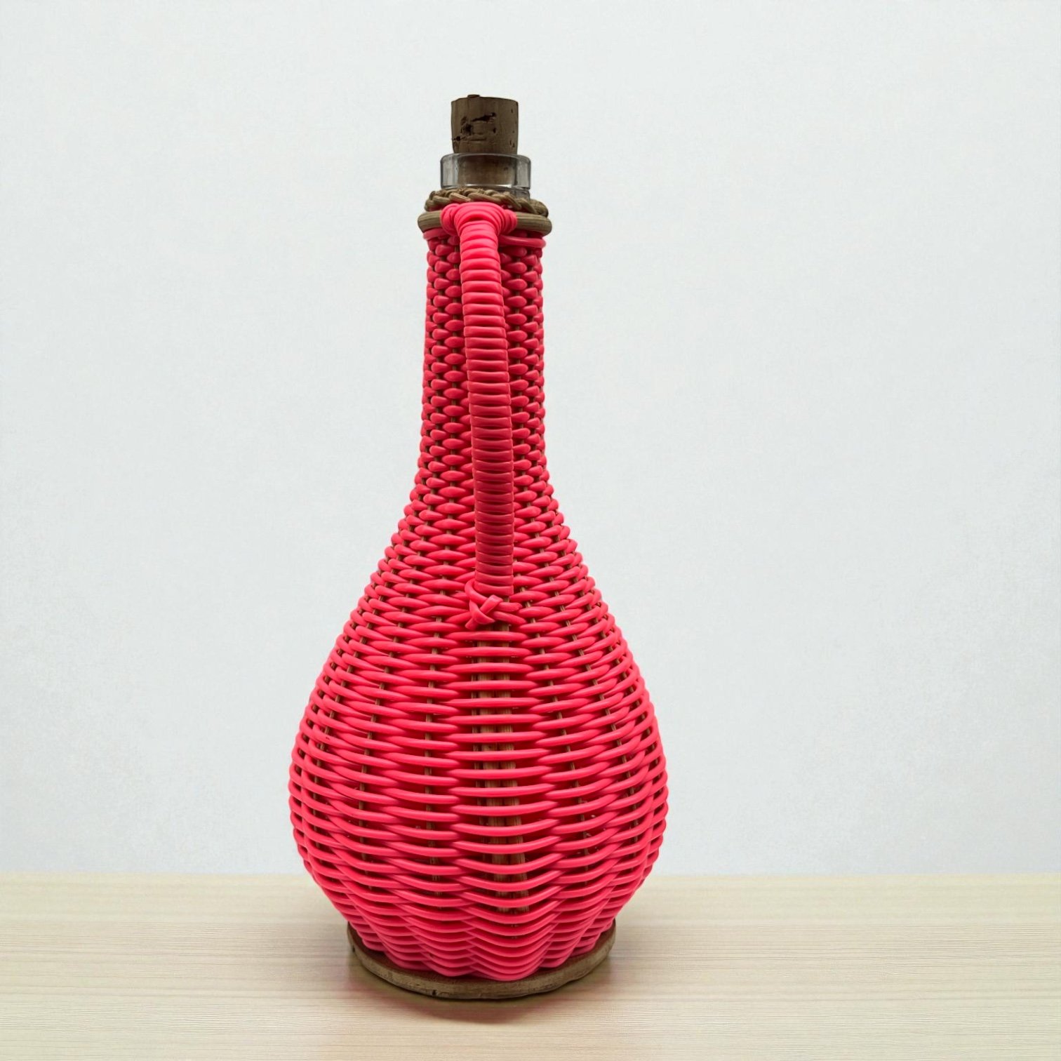 Cette carafe en verre est entièrement recouverte d’un tressage en plastique scoubidou, dans une teinte rose vif éclatante, avec une anse assortie et un bouchon en liège.