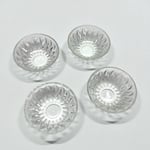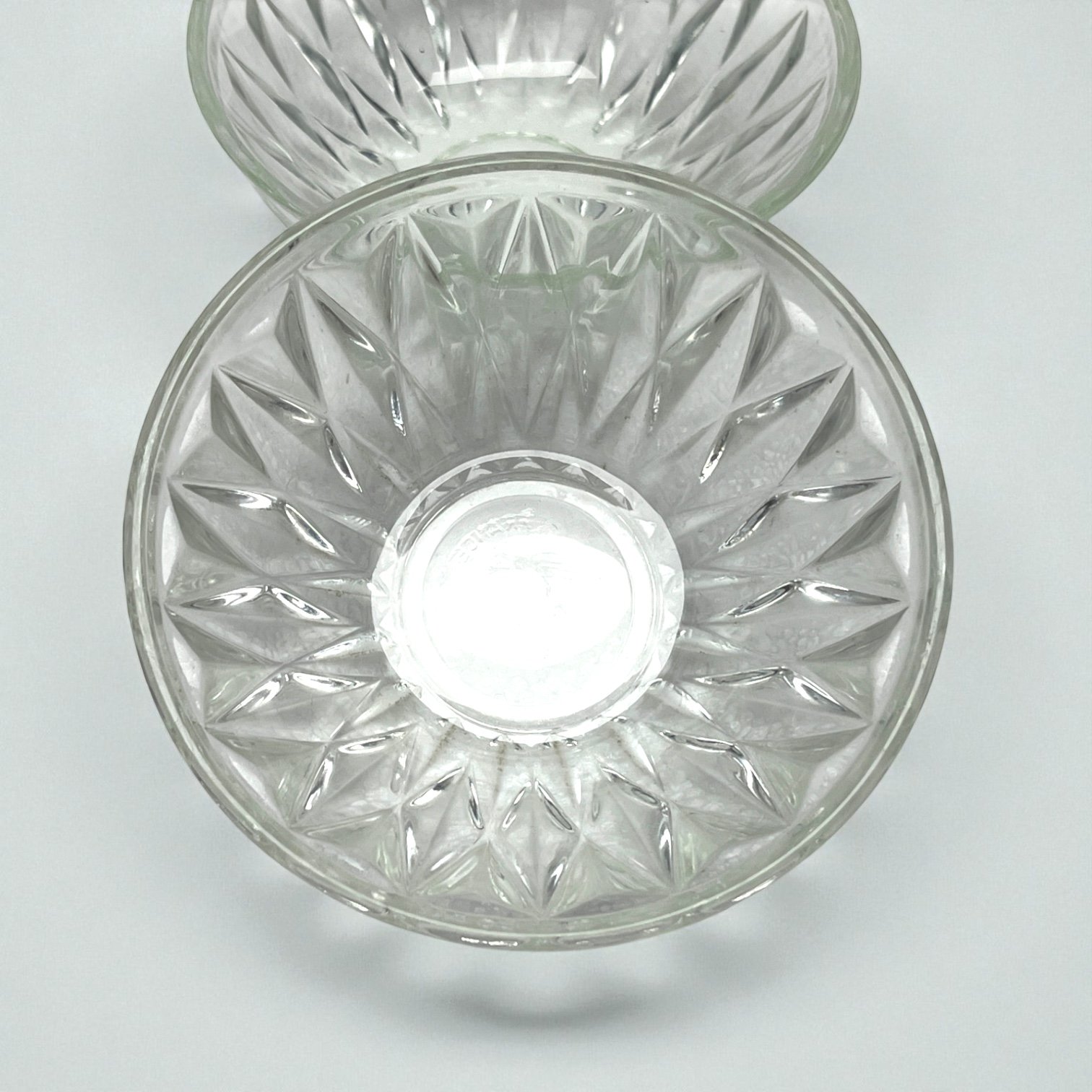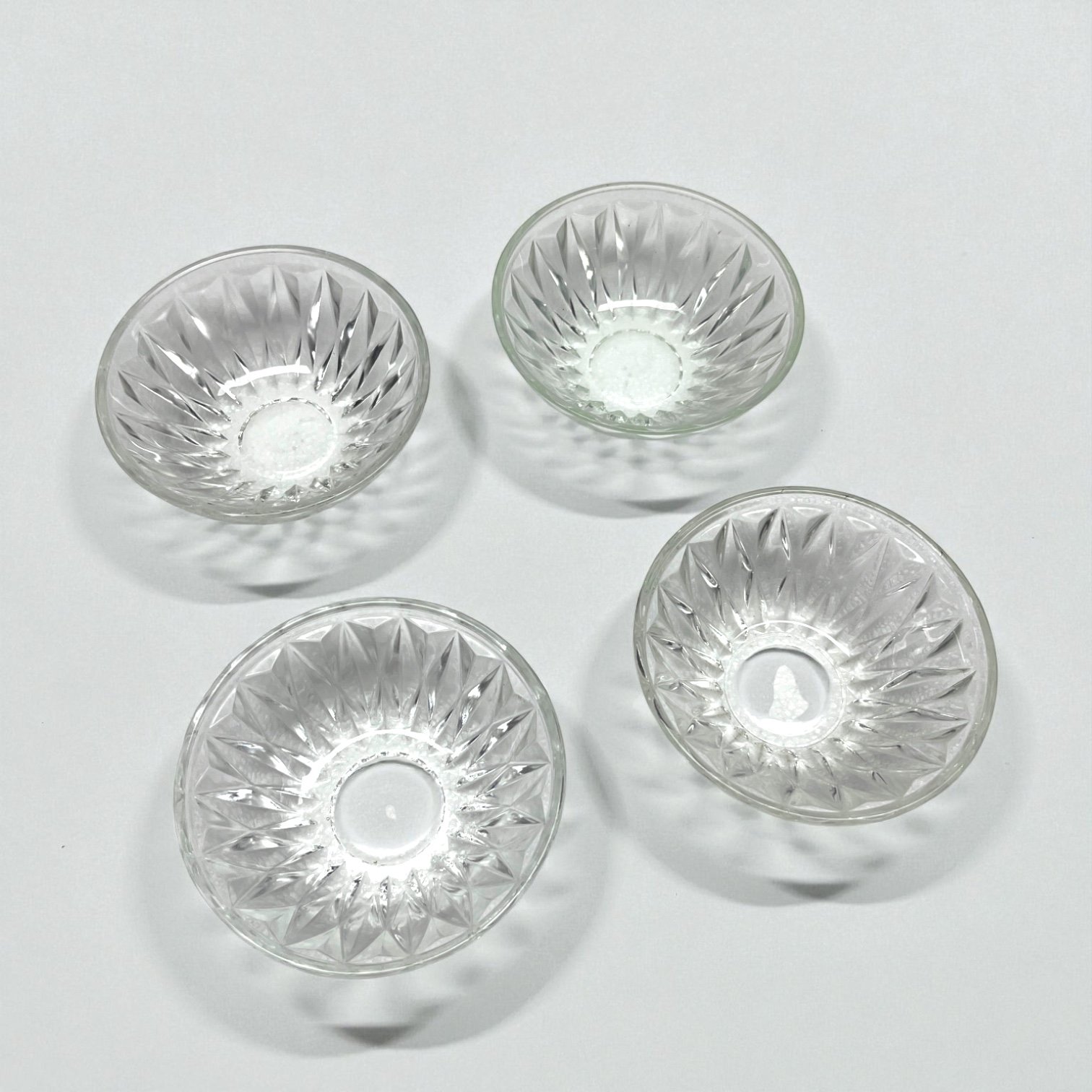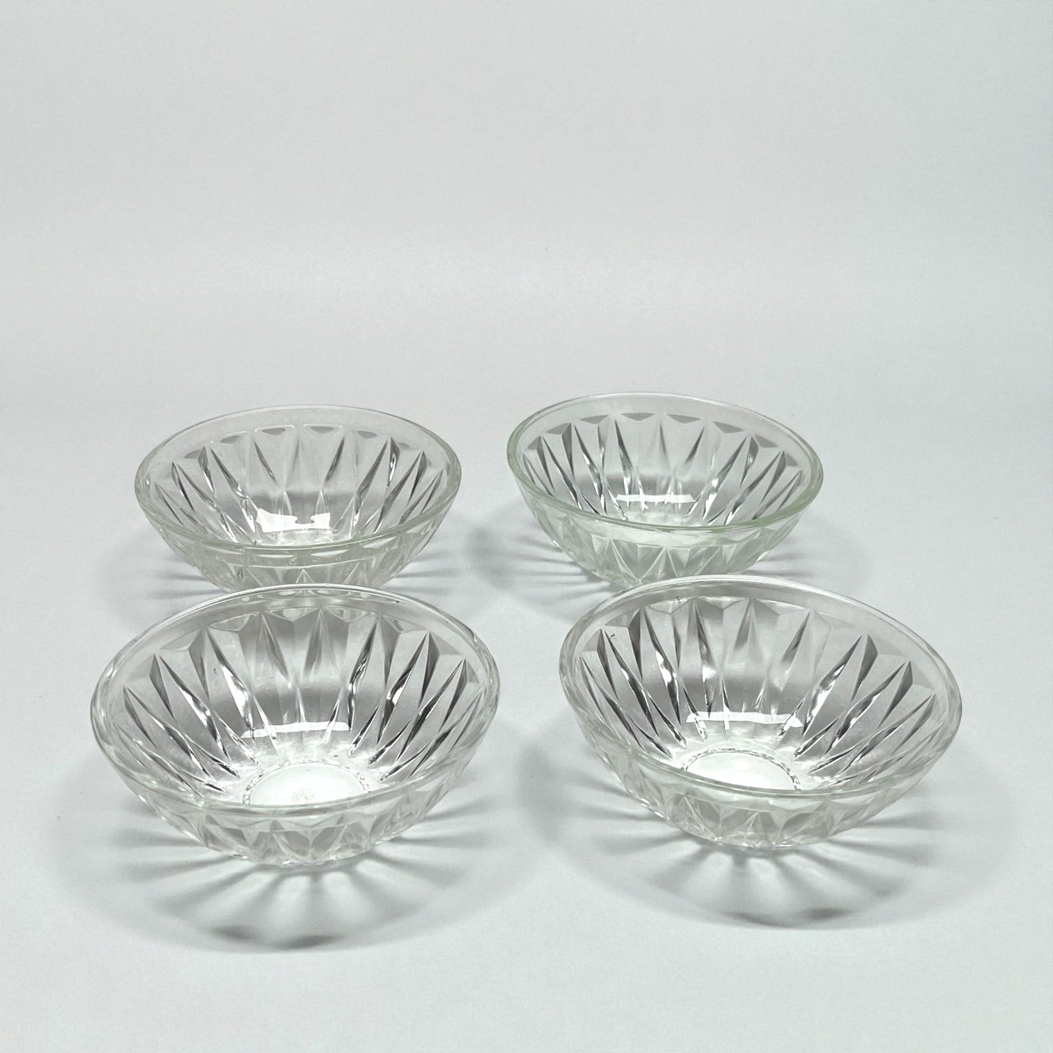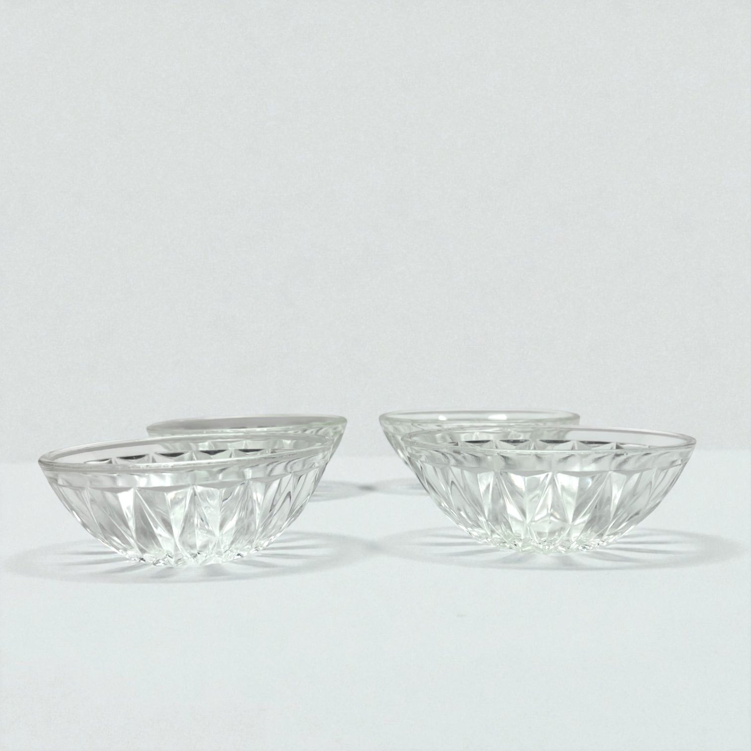 Ramequins en verre transparent à motif de losanges facettés, typiques du design vintage des années 1960-1970.