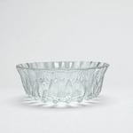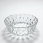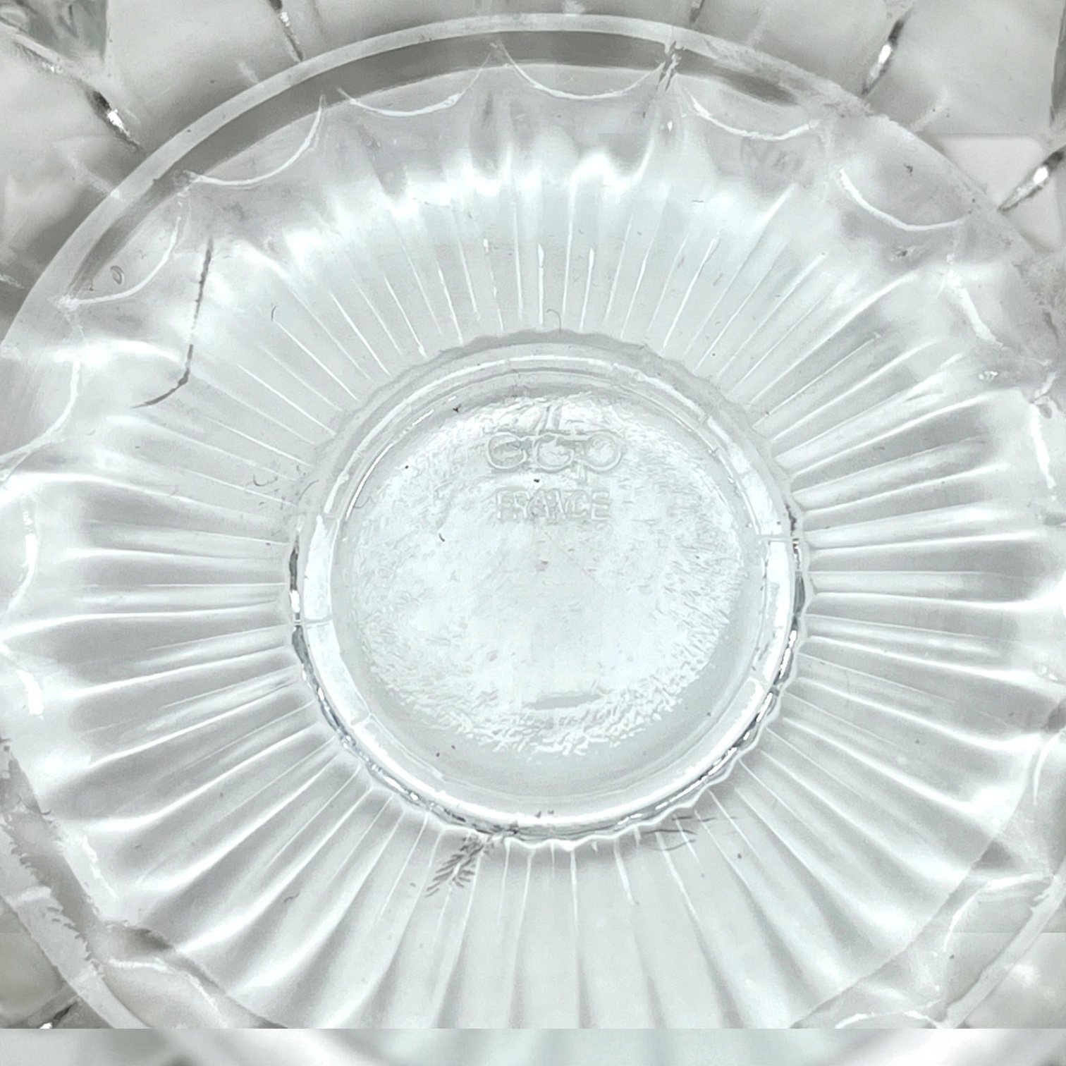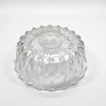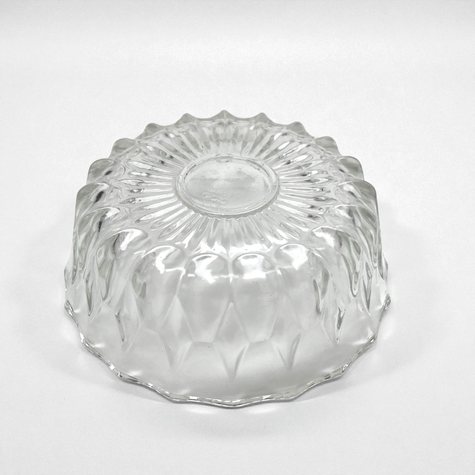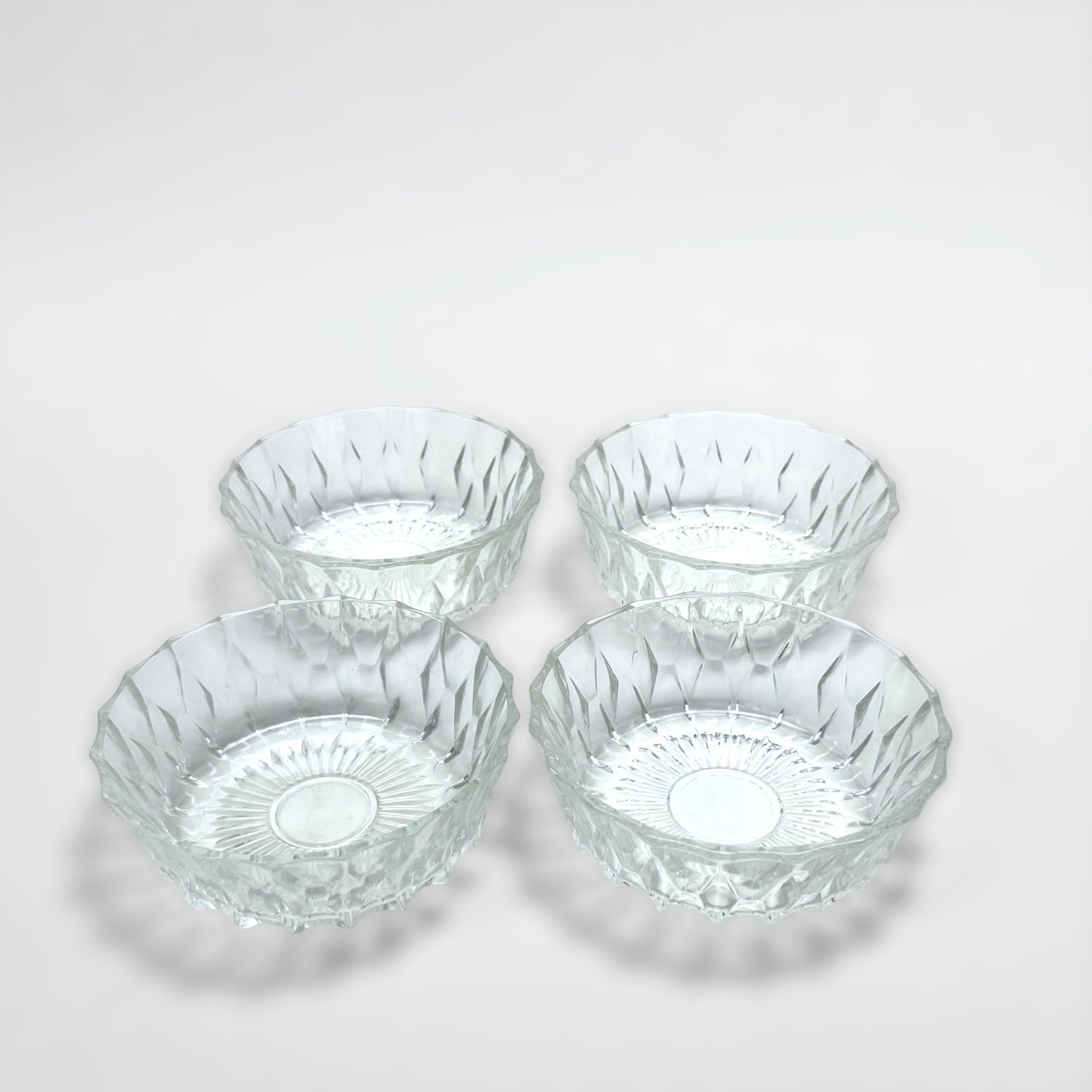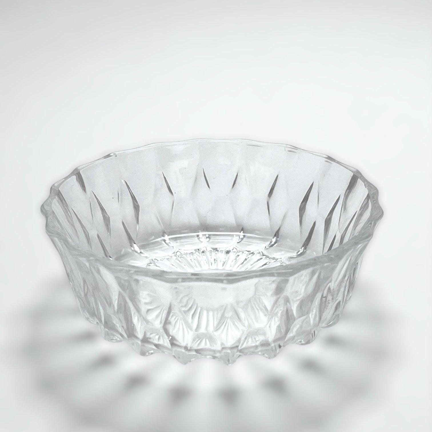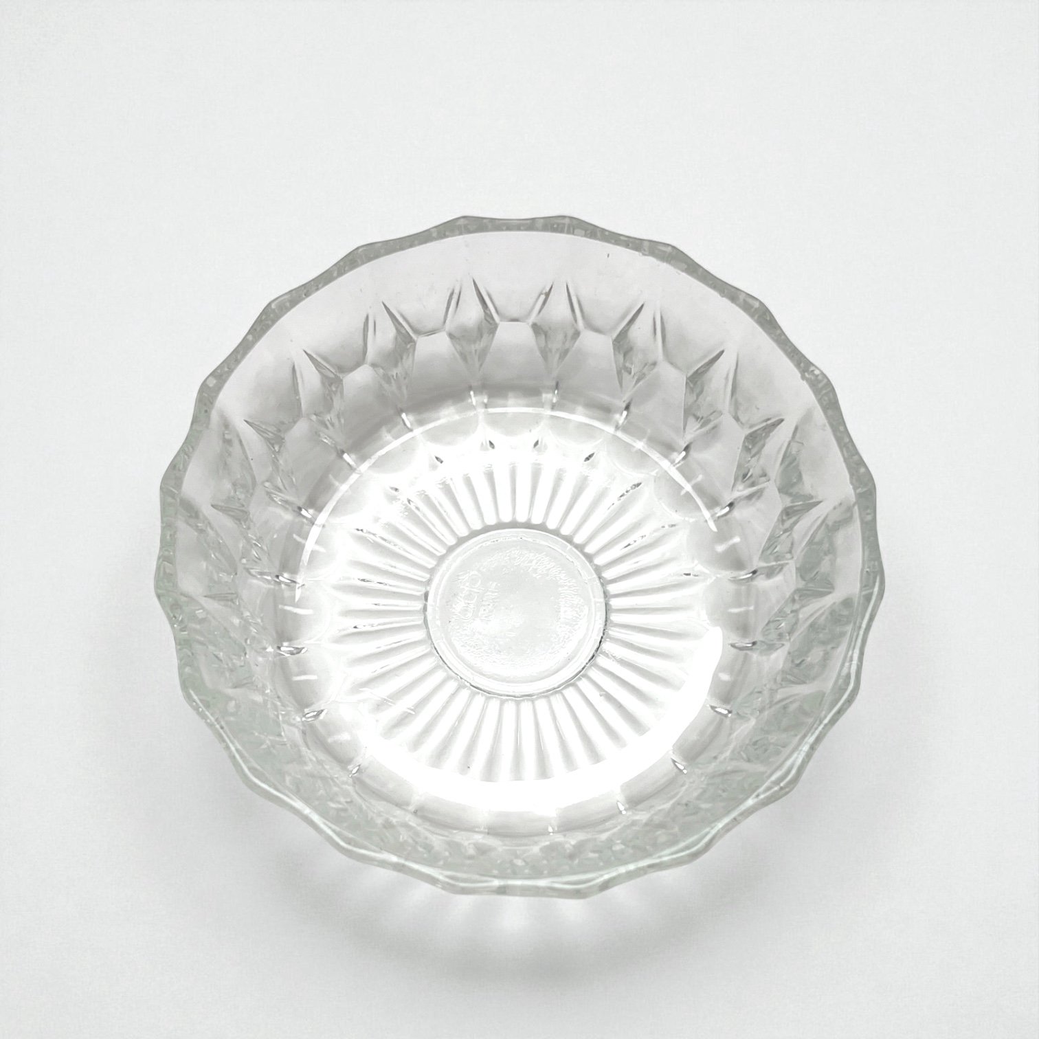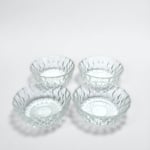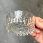 Ramequins en verre transparent à reliefs géométriques, typiques du design vintage des années 1960-1970.