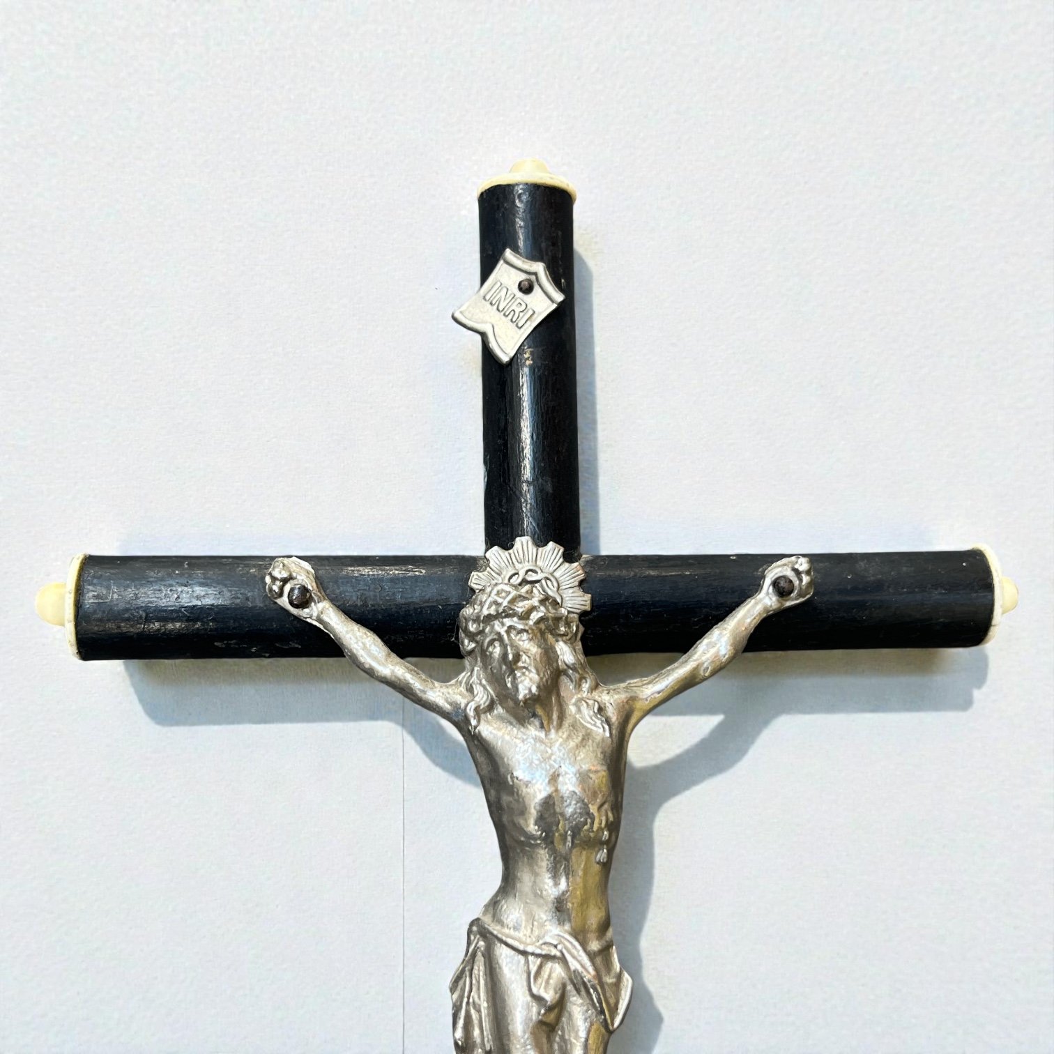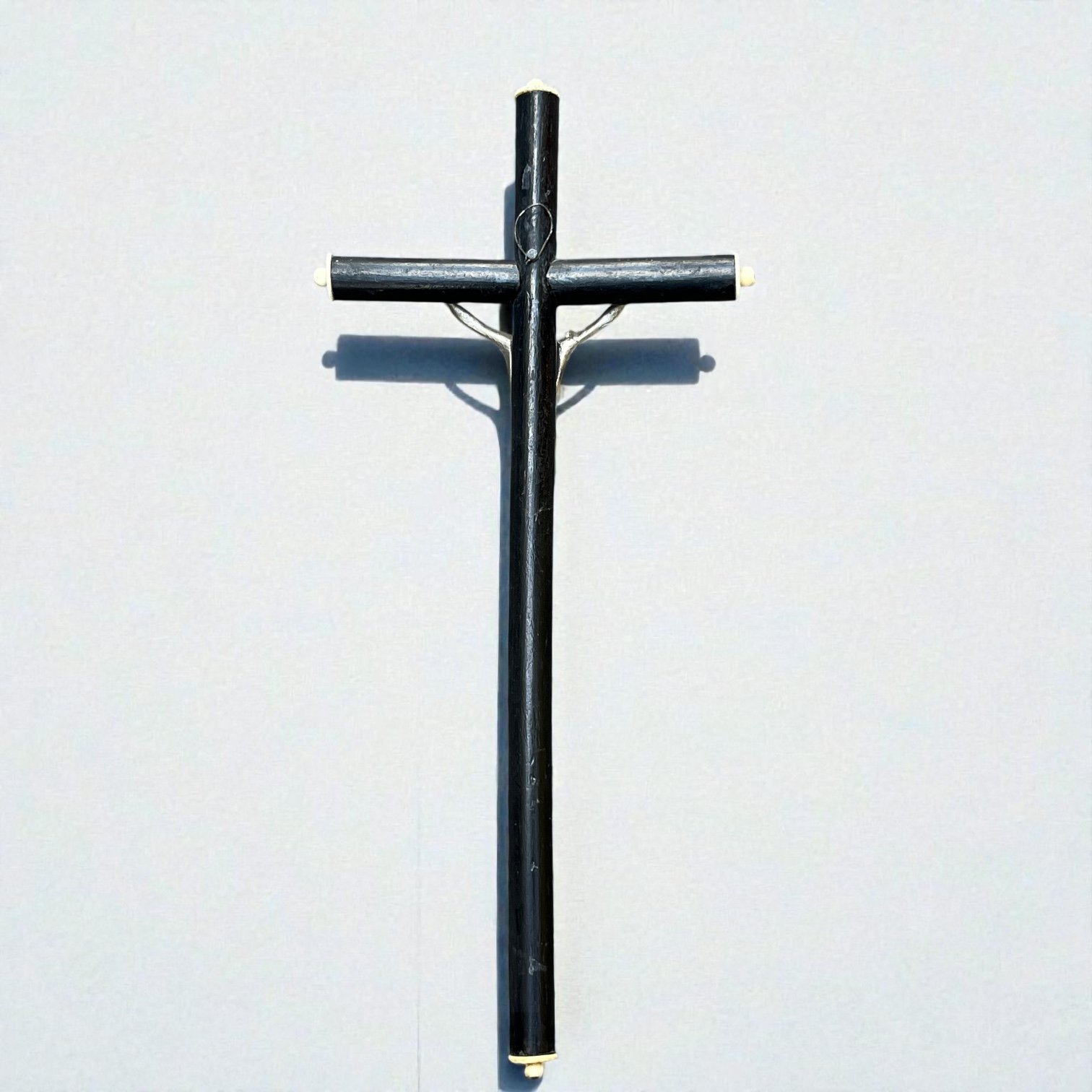 Ce crucifix français d'époque Napoléon III est une pièce de collection remarquable. La croix est en bois noirci finement tourné, ornée d'un Christ en métal argenté aux détails précis.