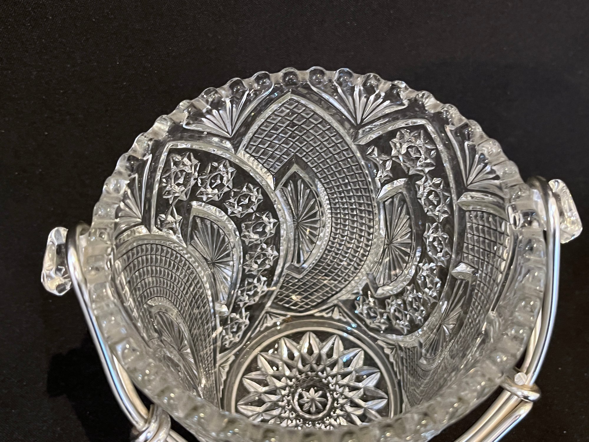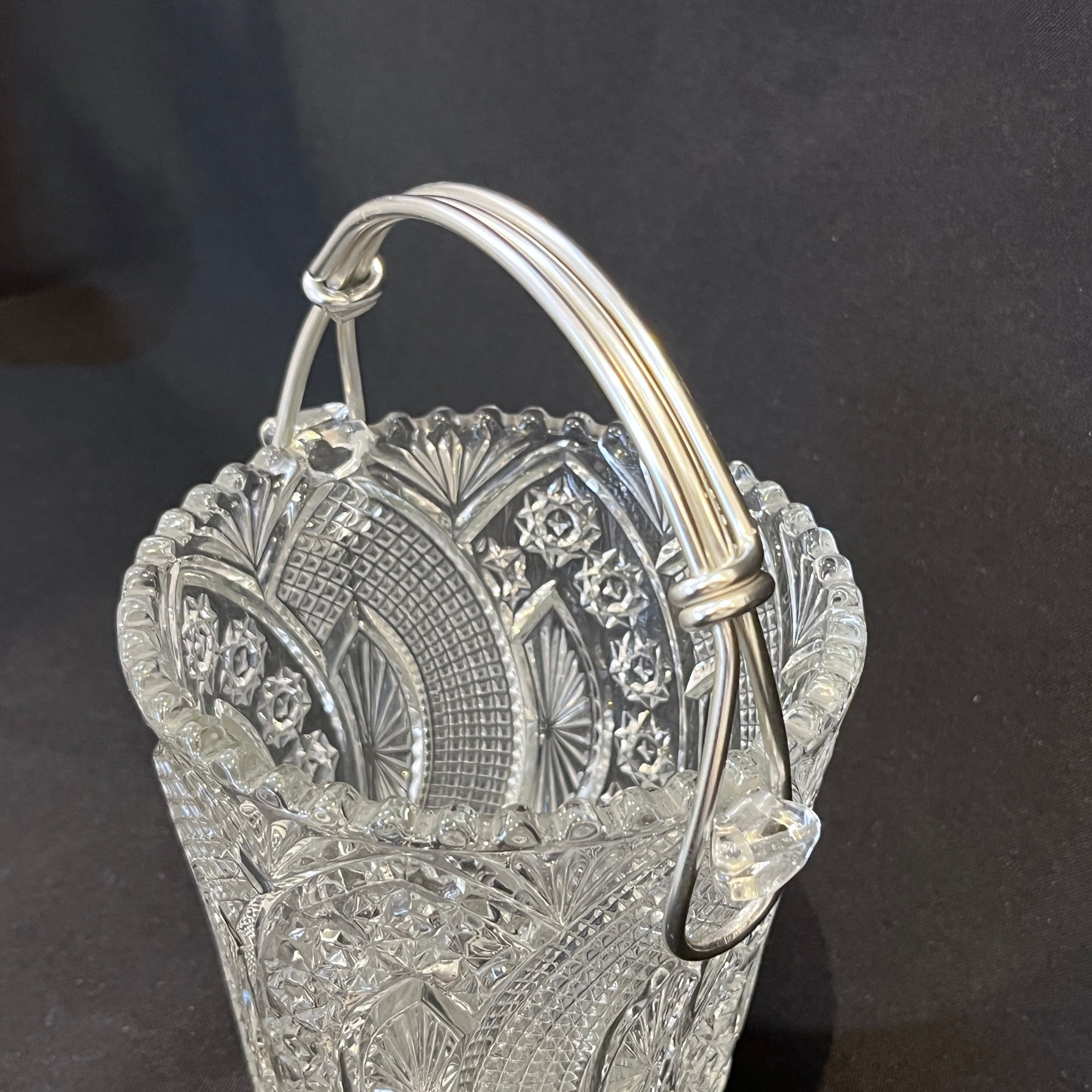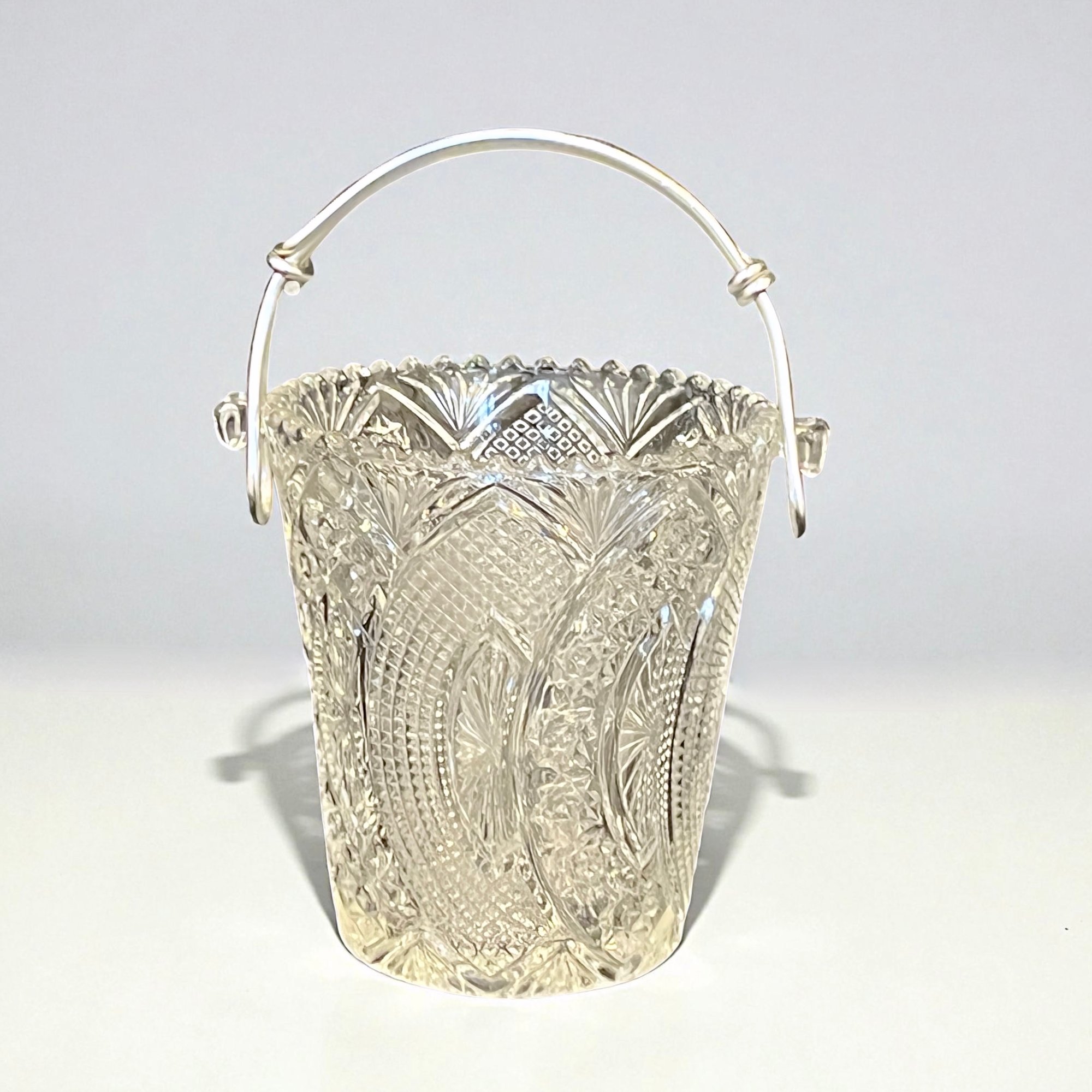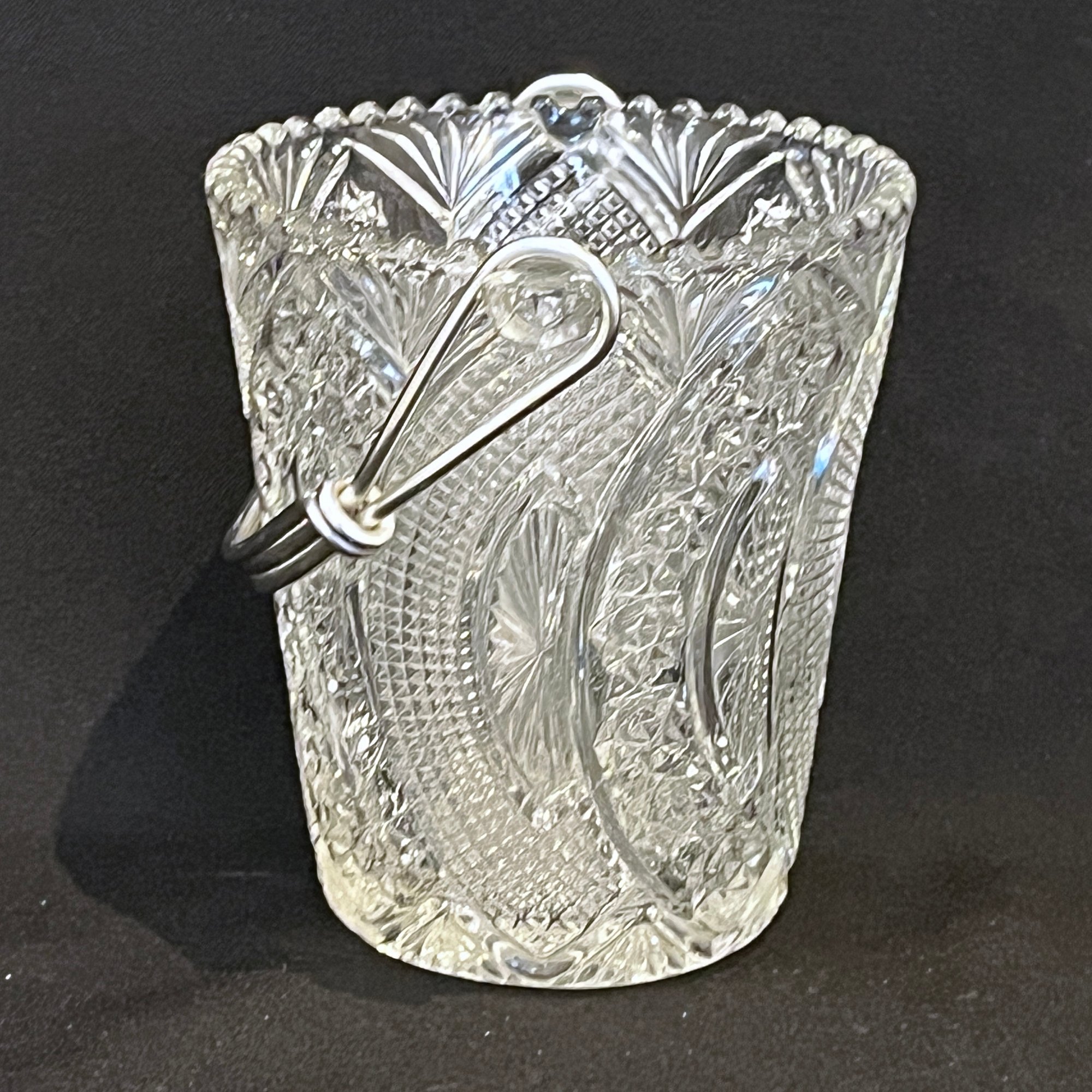 Joli seau à glaçons vintage en cristal taillé vintage 1950 1960, agrémenté d’une anse en métal chromé. Le cristal présente un décor géométrique élégant qui capte la lumière et crée un effet scintillant.