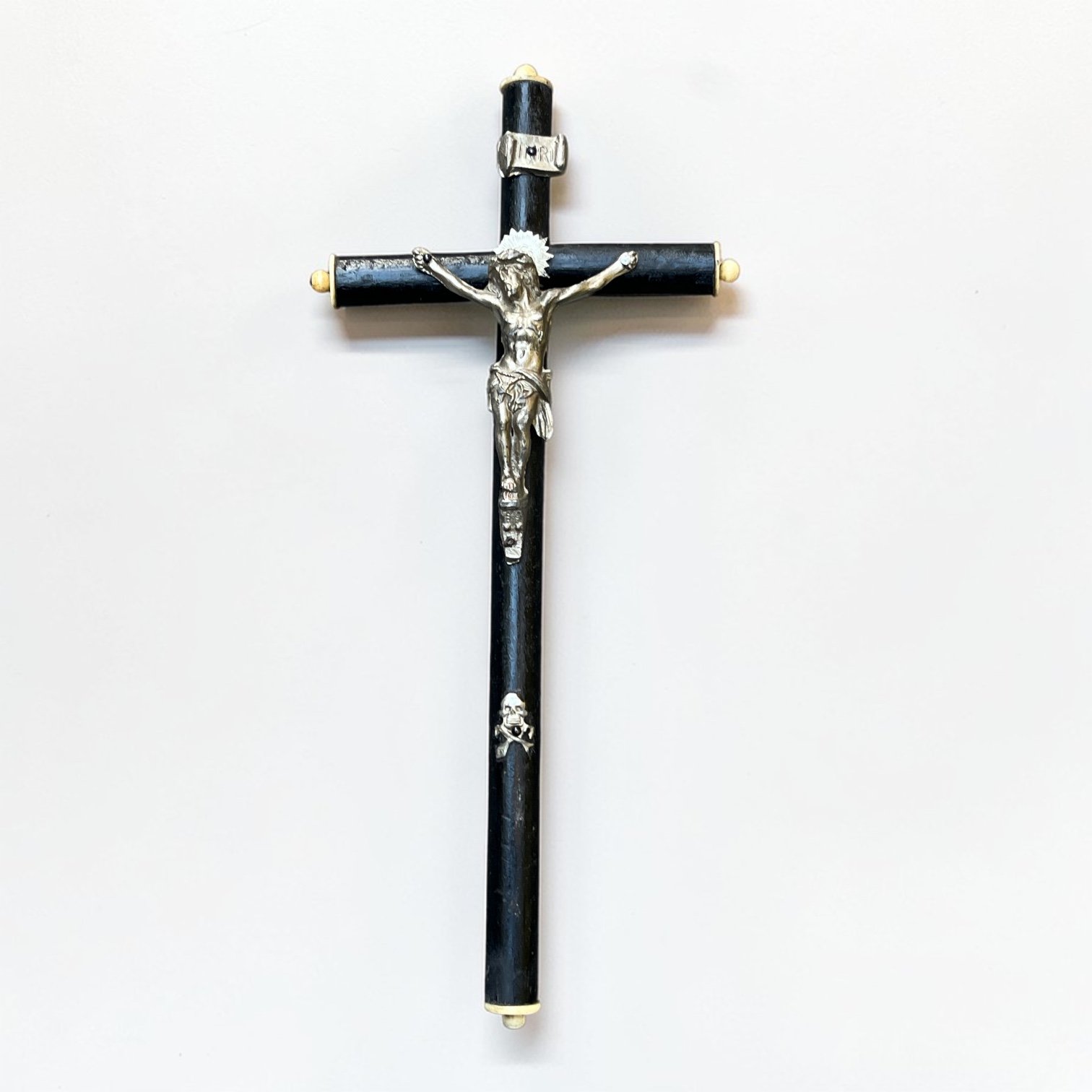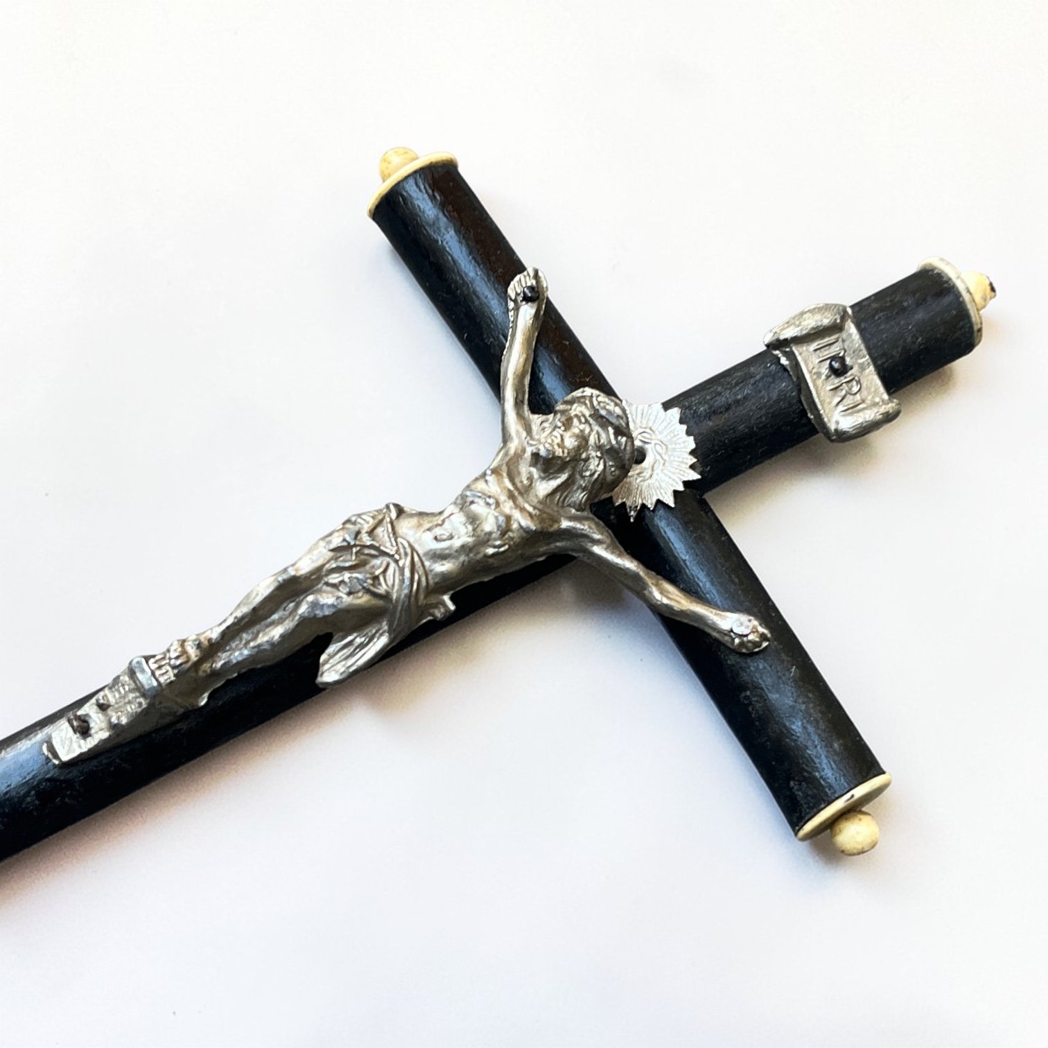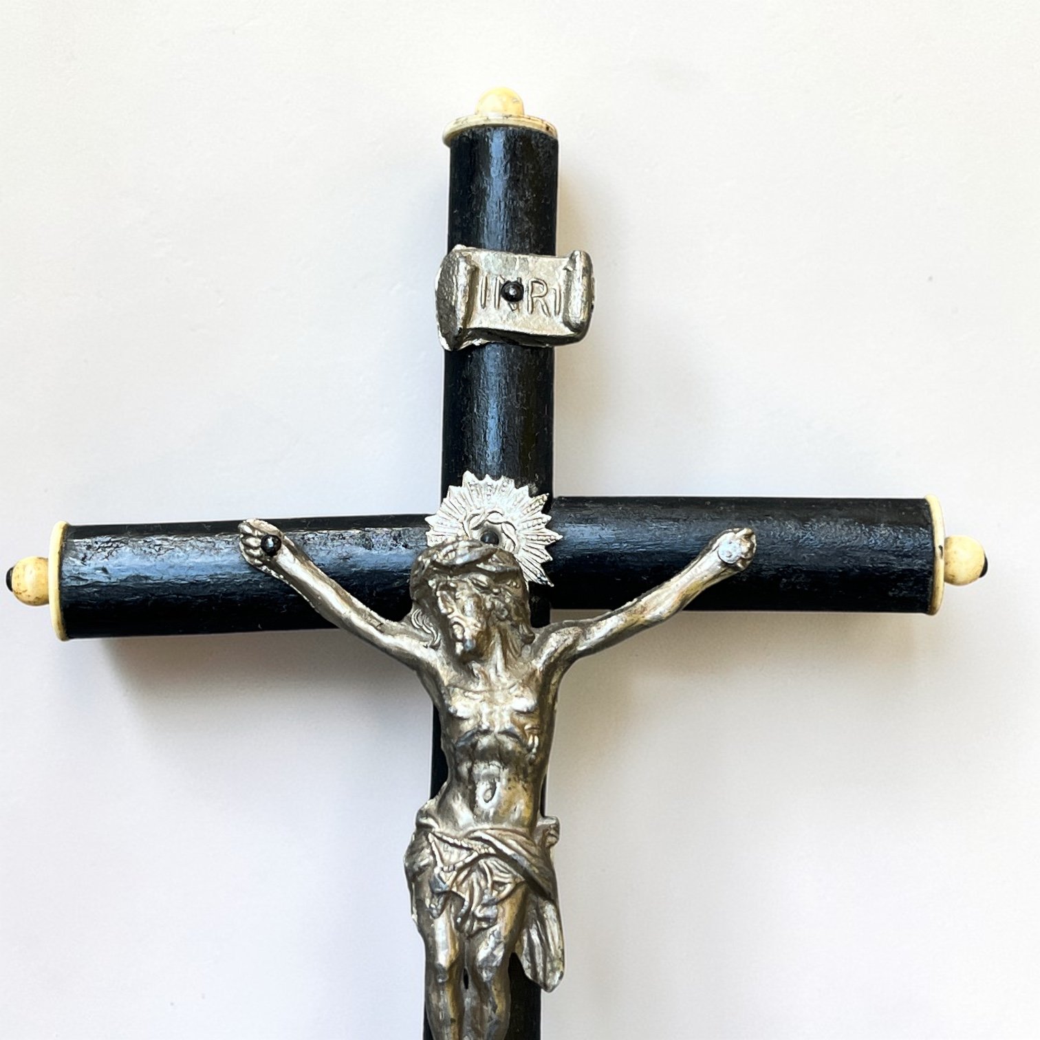 Ce crucifix français d'époque Napoléon III est une pièce de collection remarquable. La croix est en bois noirci finement tourné, ornée d'un Christ en métal argenté aux détails précis.