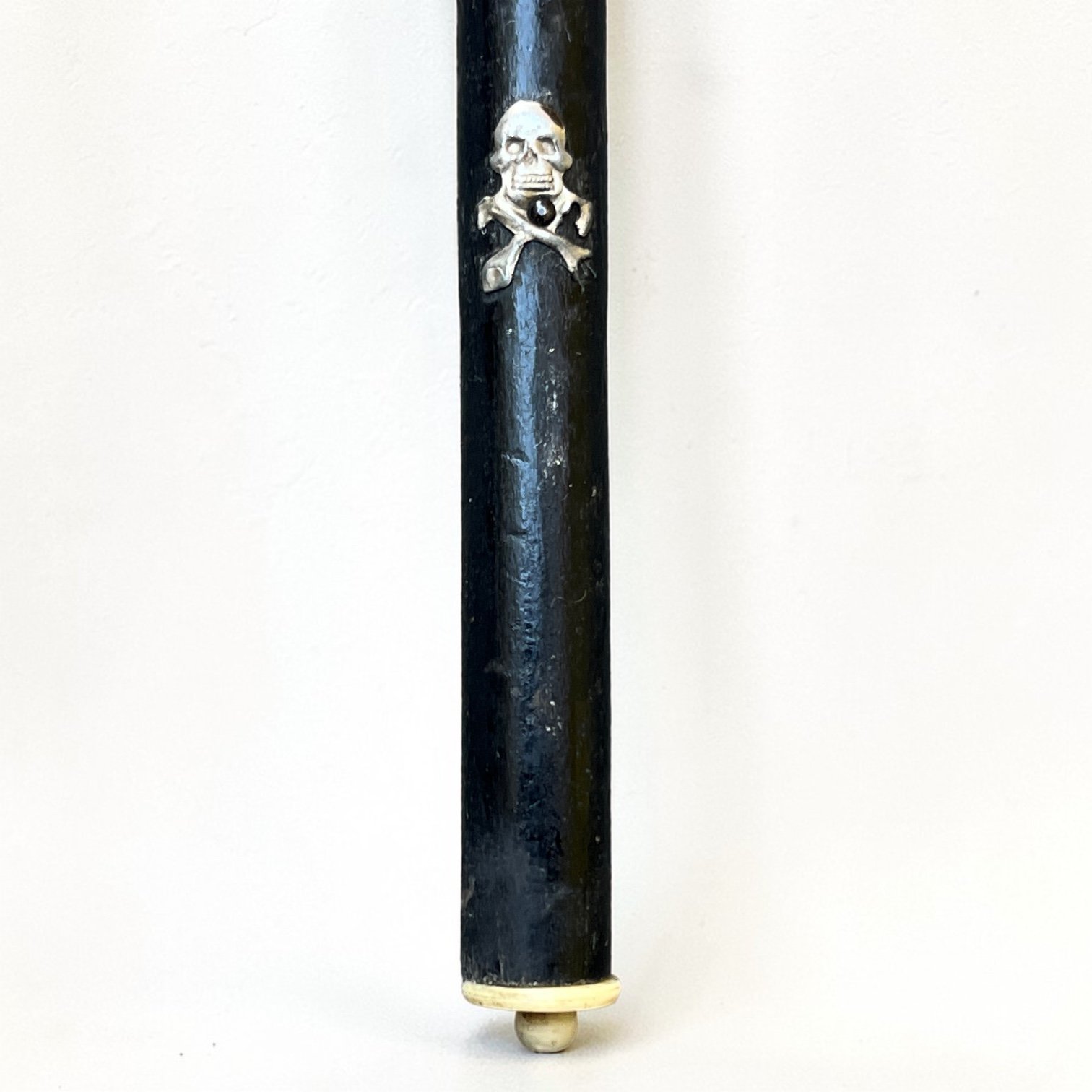 La particularité de cette pièce réside dans la présence du crâne et des os au pied de la croix, symbole du "Golgotha" (le lieu du crâne) et rappel de la vanité humaine (Memento Mori). Les embouts de la croix sont travaillés avec soin, typiques de l'artisanat religieux de la fin du XIXème siècle.
