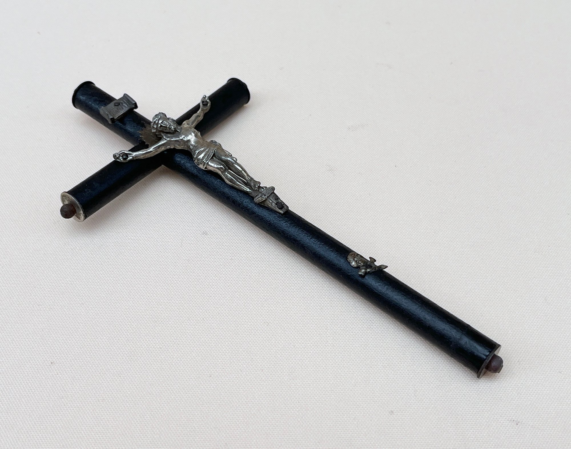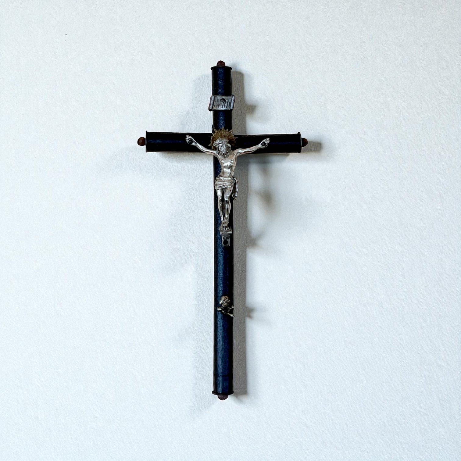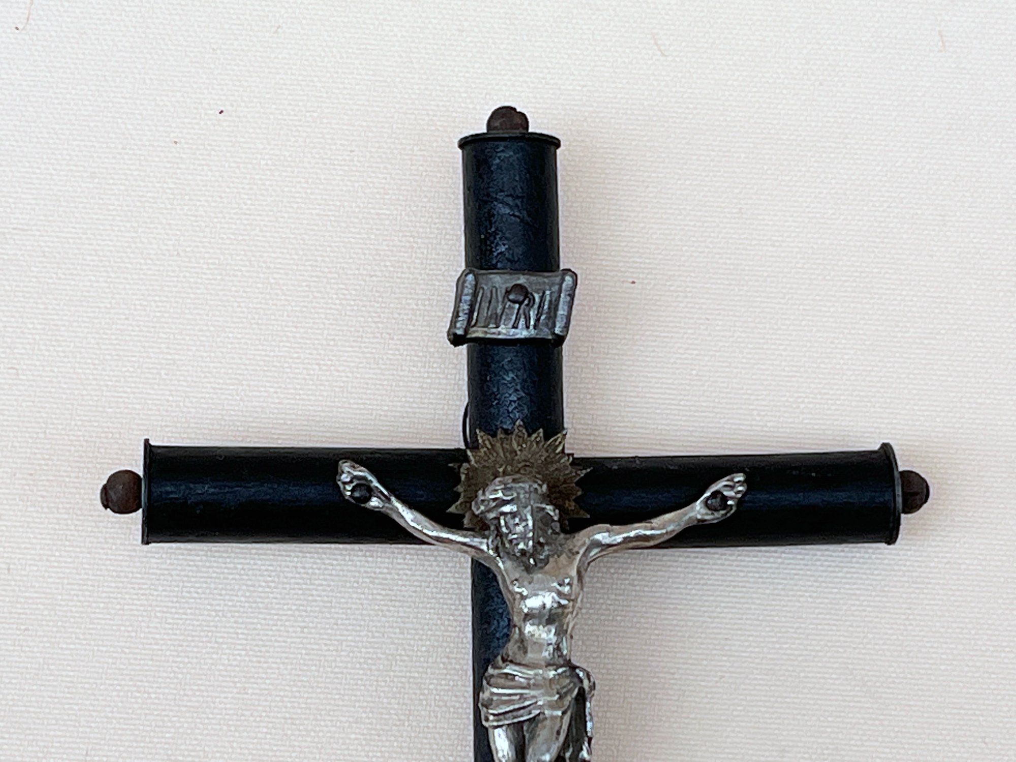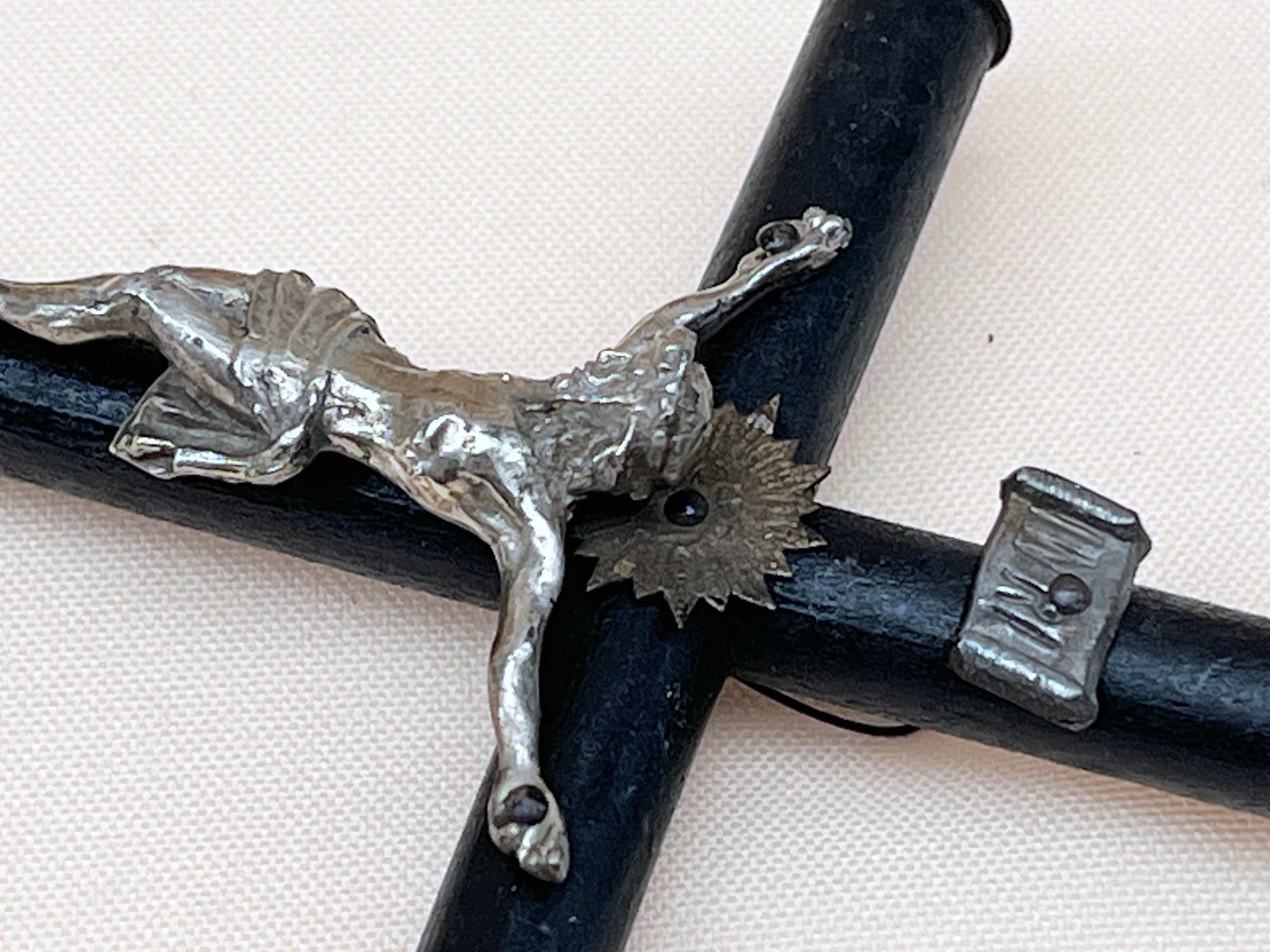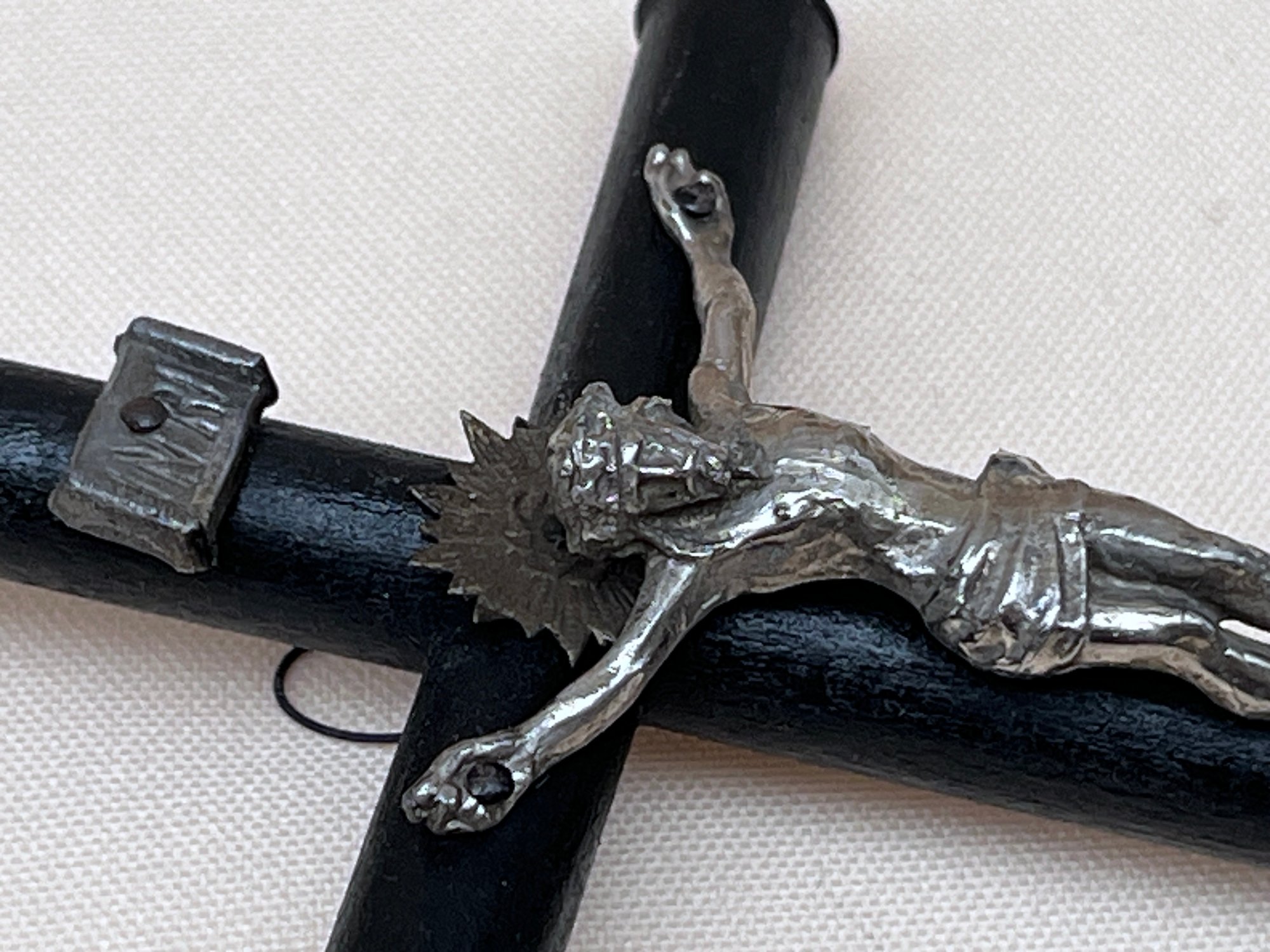 Crucifix antique Jésus Christ Napoléon III en bois noirci et Christ en métal - fin XIXe.