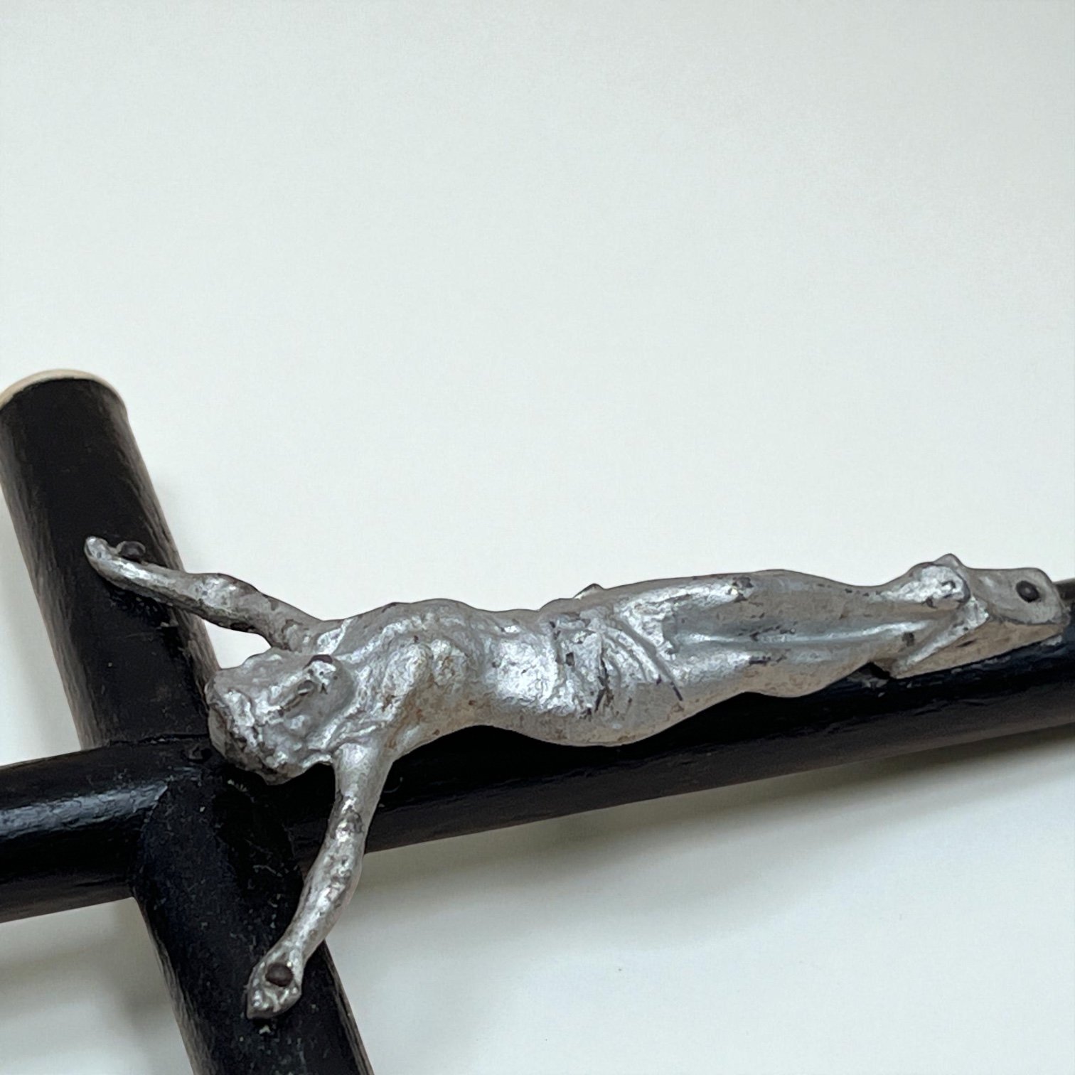 Le Christ est en métal gris, aux quatres extrémités une décoration en os.