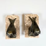 Paire de serre-livres Art Déco avec hirondelles en métal patiné bronze sur socle de marbre beige des années 1920 - 1930.