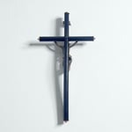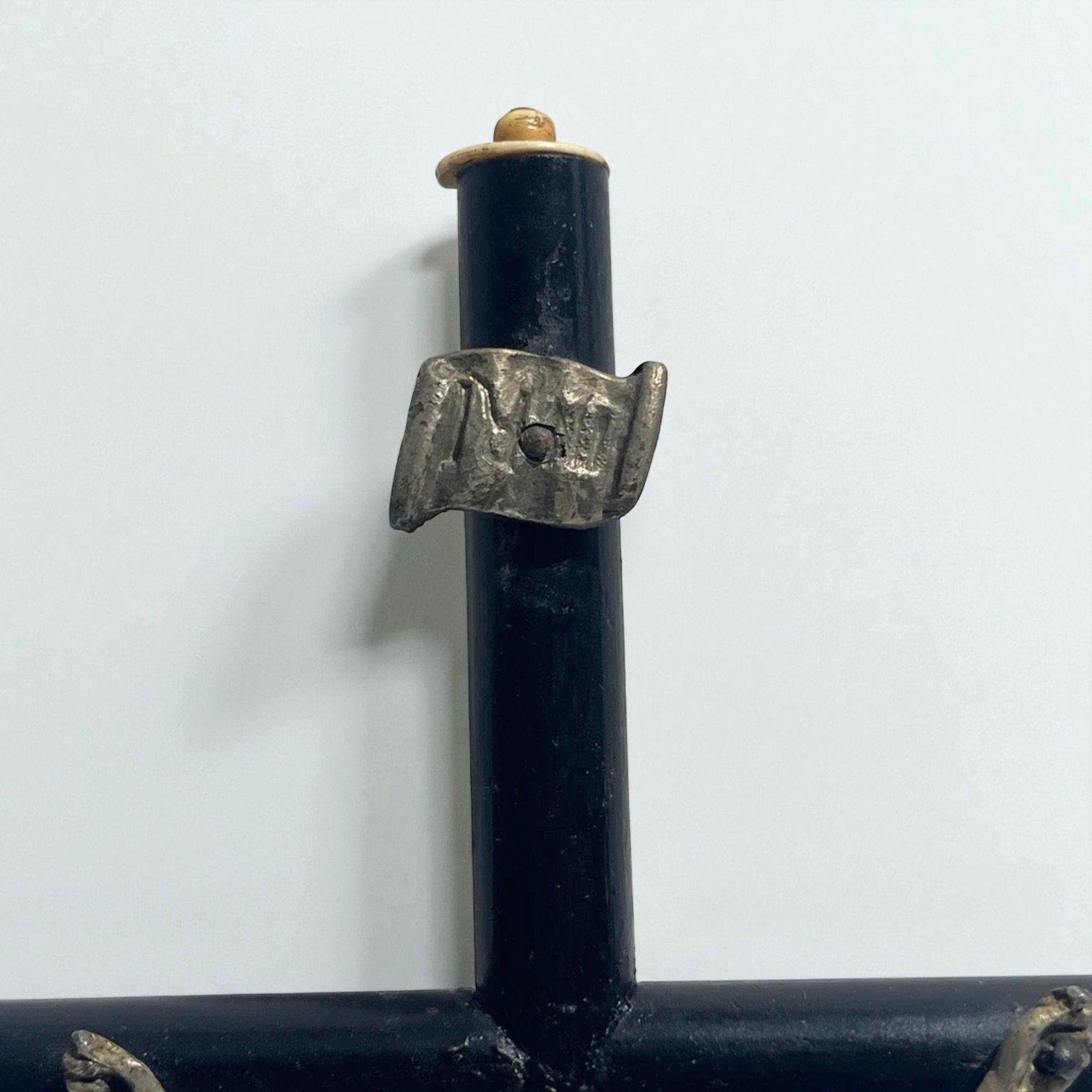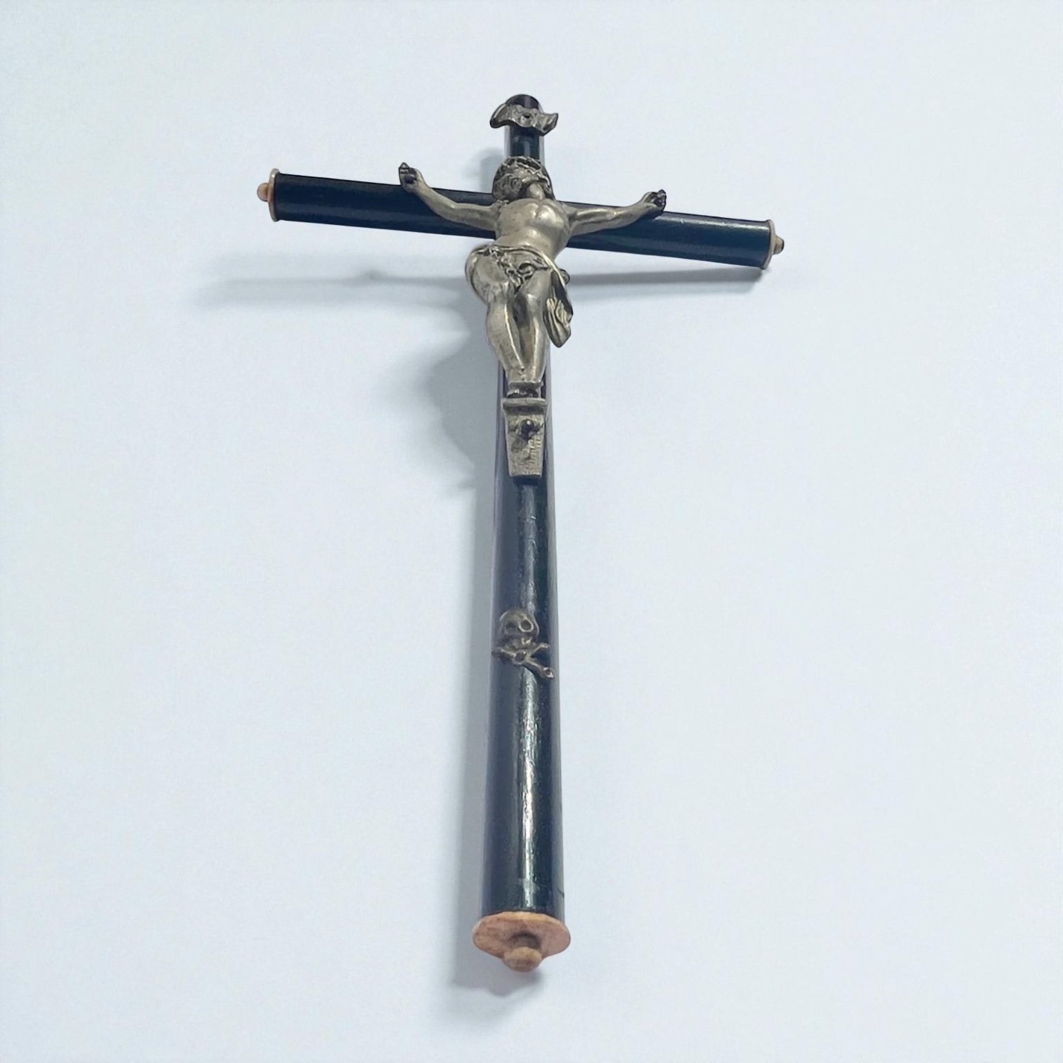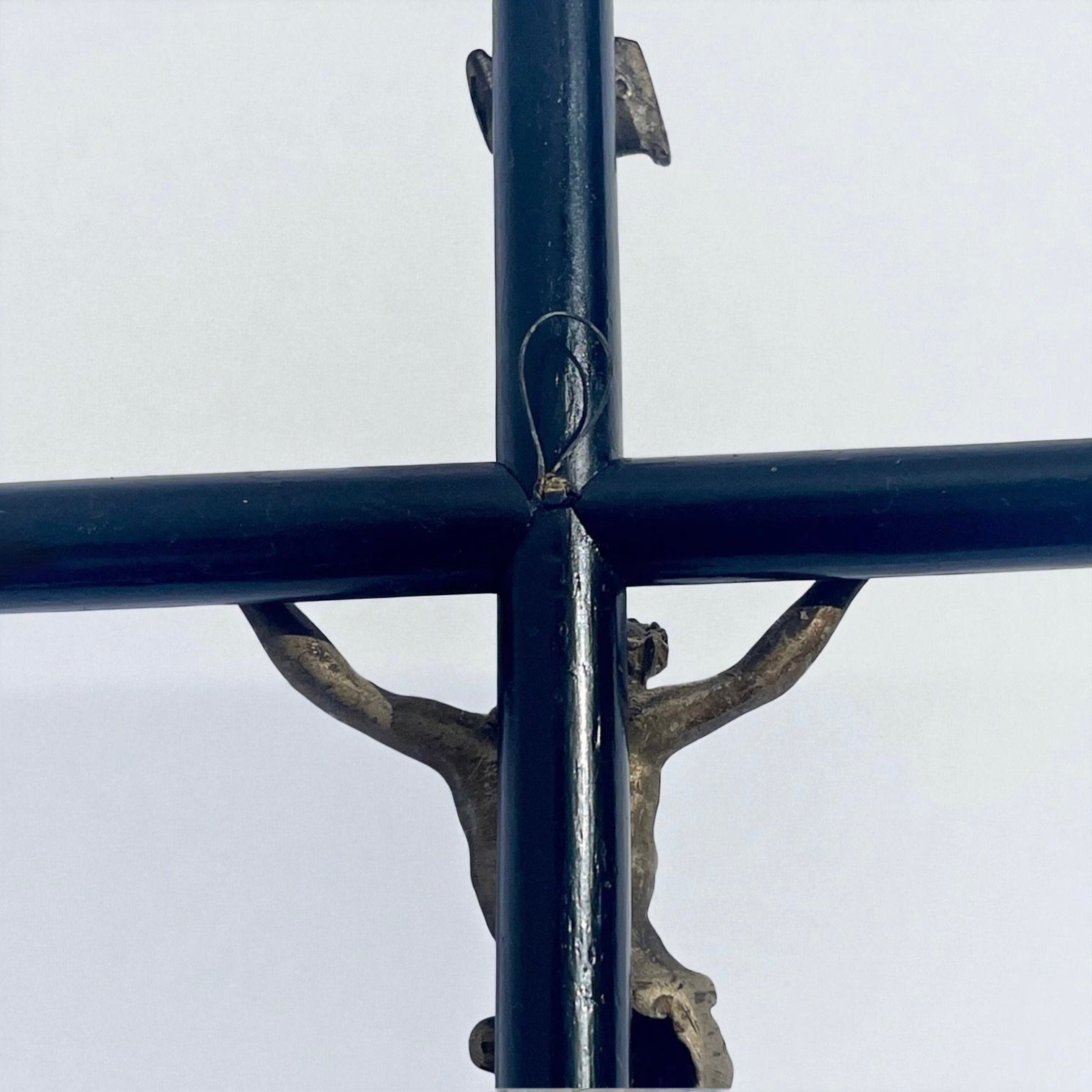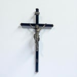 En bois noirci, elle est ornée d’un Christ en métal , délicatement travaillé.