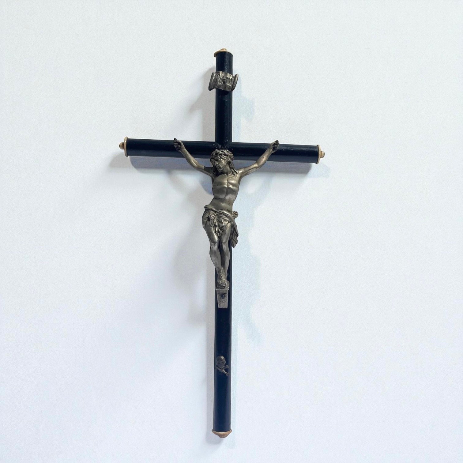Grand crucifix antique Jésus Christ Napoléon III en bois noirci et Christ en métal - fin XIXe.