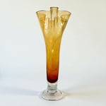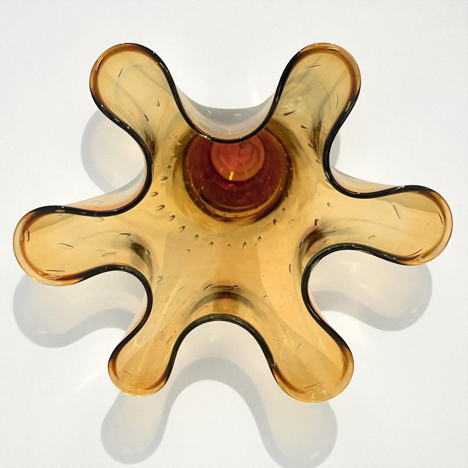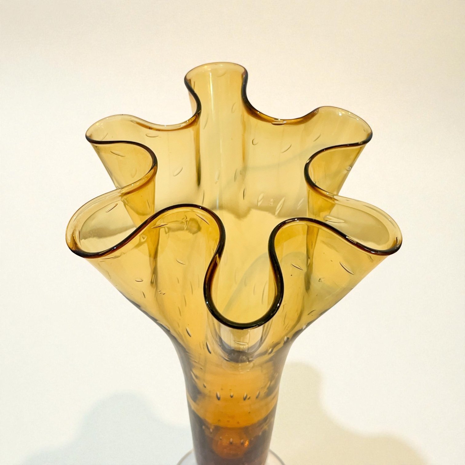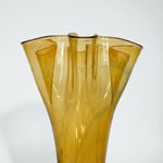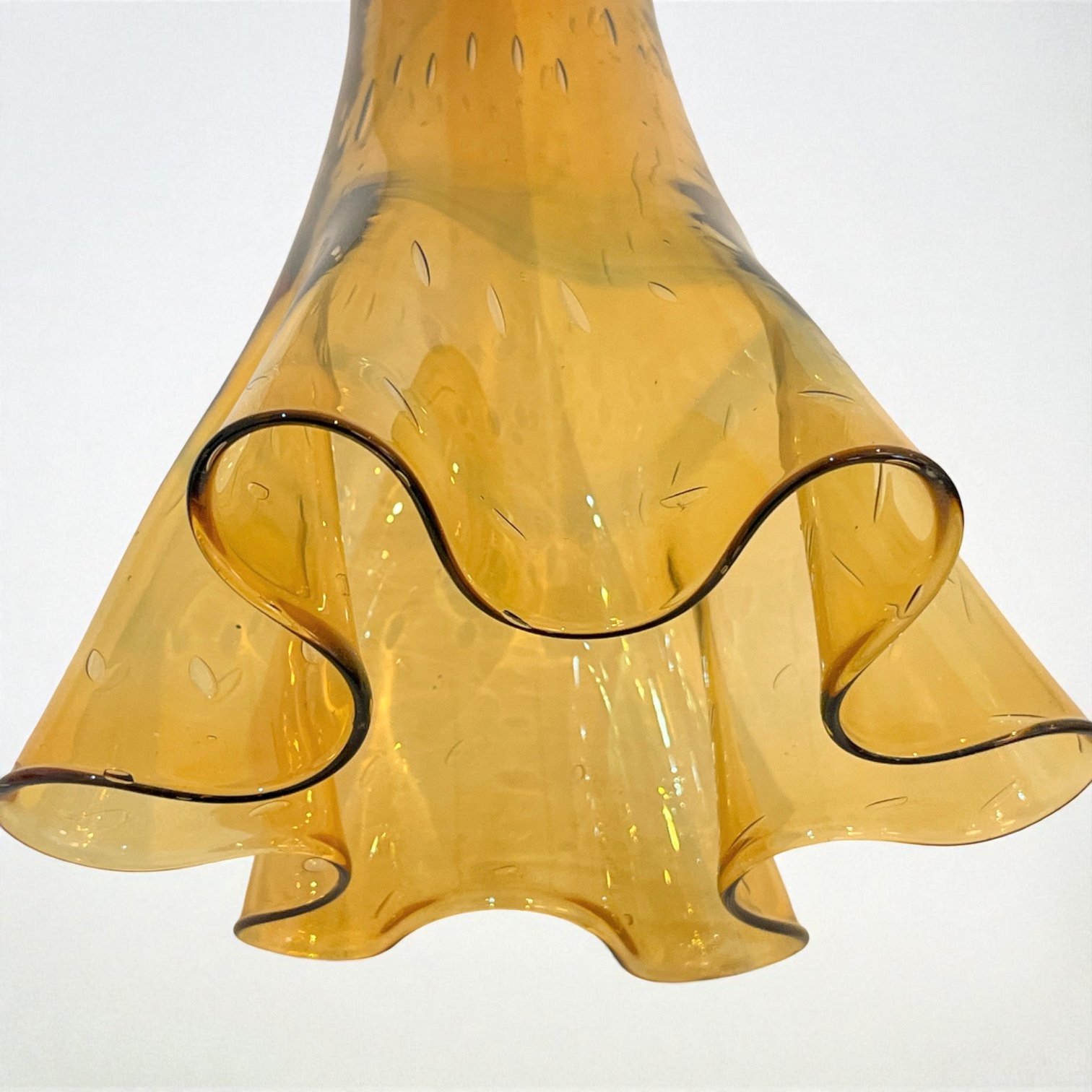Ce modèle se distingue par sa hauteur impressionnante, sa forme évasée ondulée et son verre ambré richement travaillé, typique du savoir-faire italien.