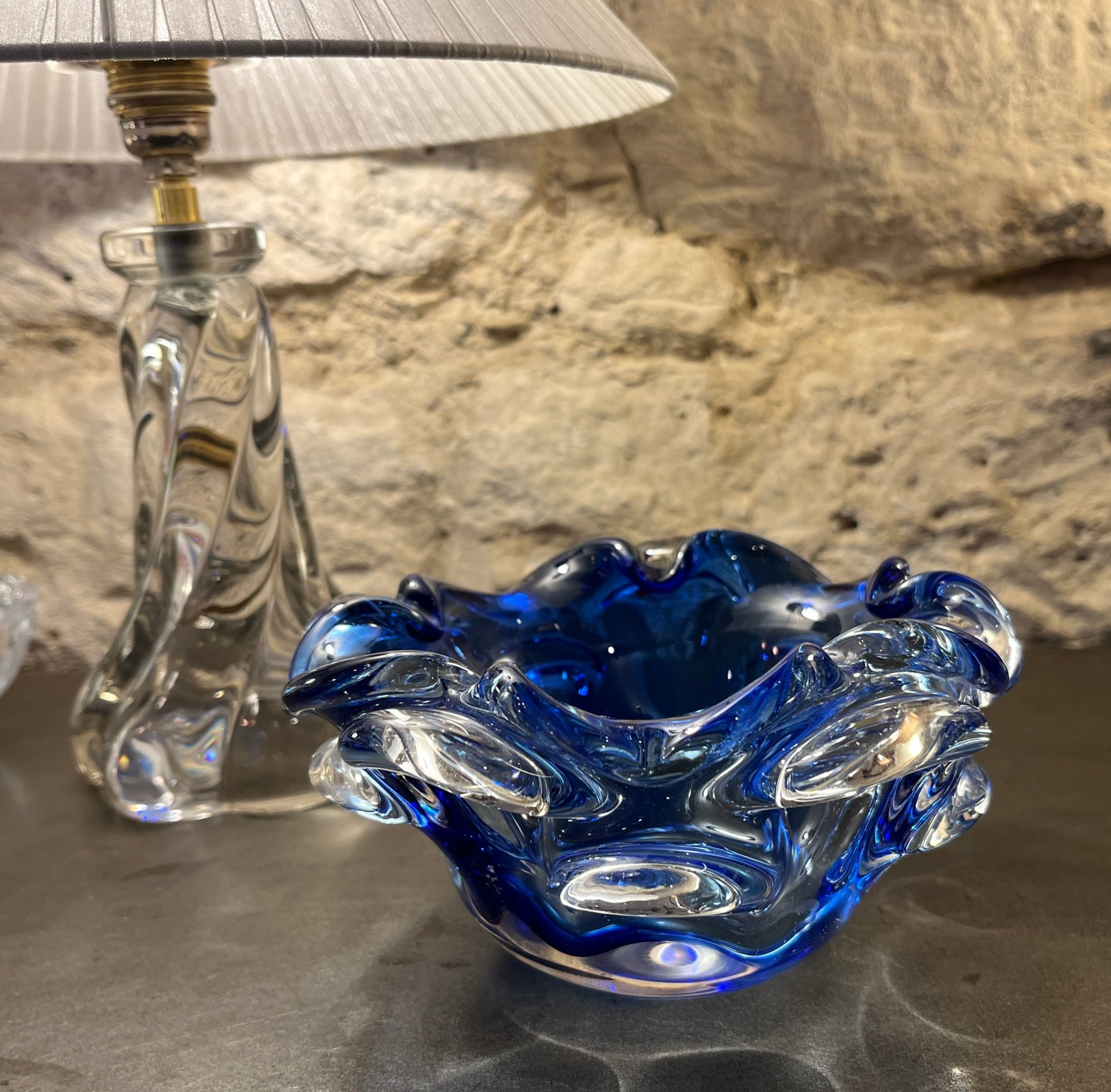 Les bords sont délicatement ondulés, donnant un effet mouvementé et élégant. Le verre est épais et lourd, signe d’une belle qualité de fabrication.