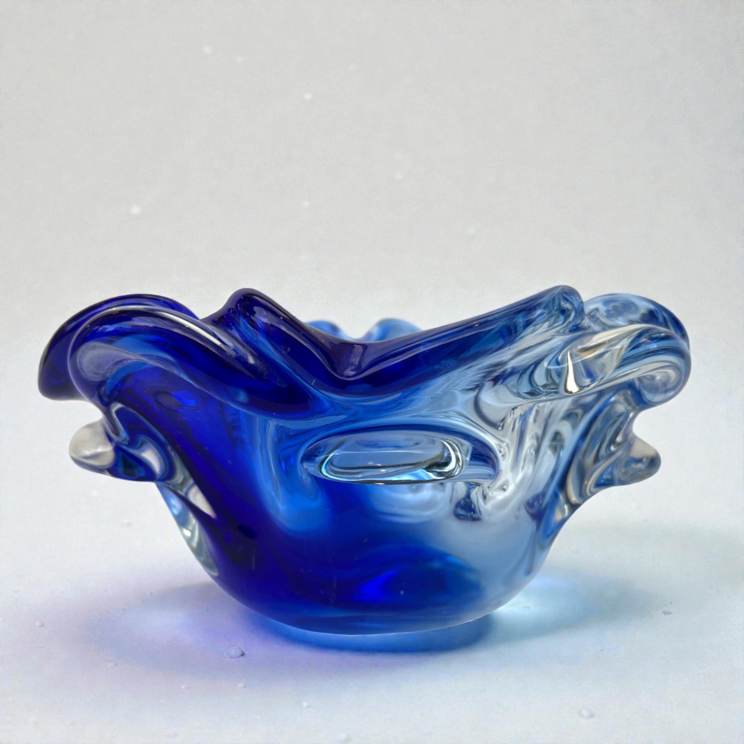 Imposant vide-poche Sommerso en verre de Murano, réalisé à la main en Italie dans les années 1960 -1970, dans une teinte bleu cobalt intense avec des parties translucides, formant un décor fluide et organique.