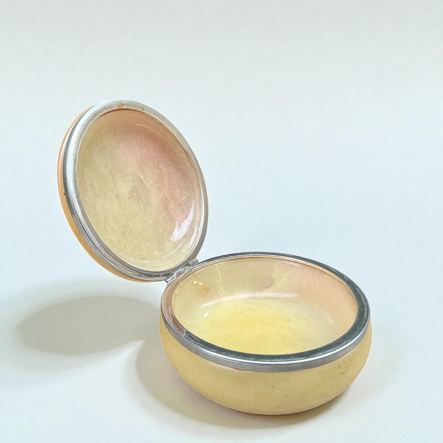 Élégante boîte à bijoux vintage en albâtre naturel, ornée d’une décalcomanie de fleurs de cerisier roses, datant des années 1970.