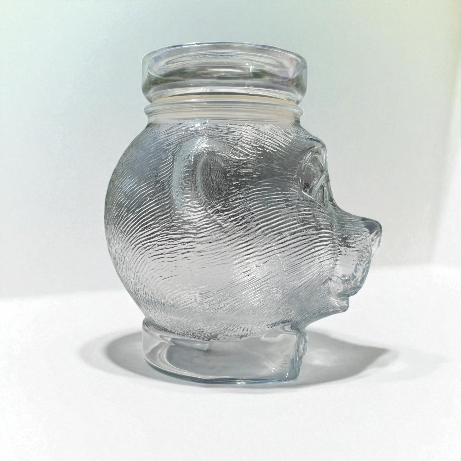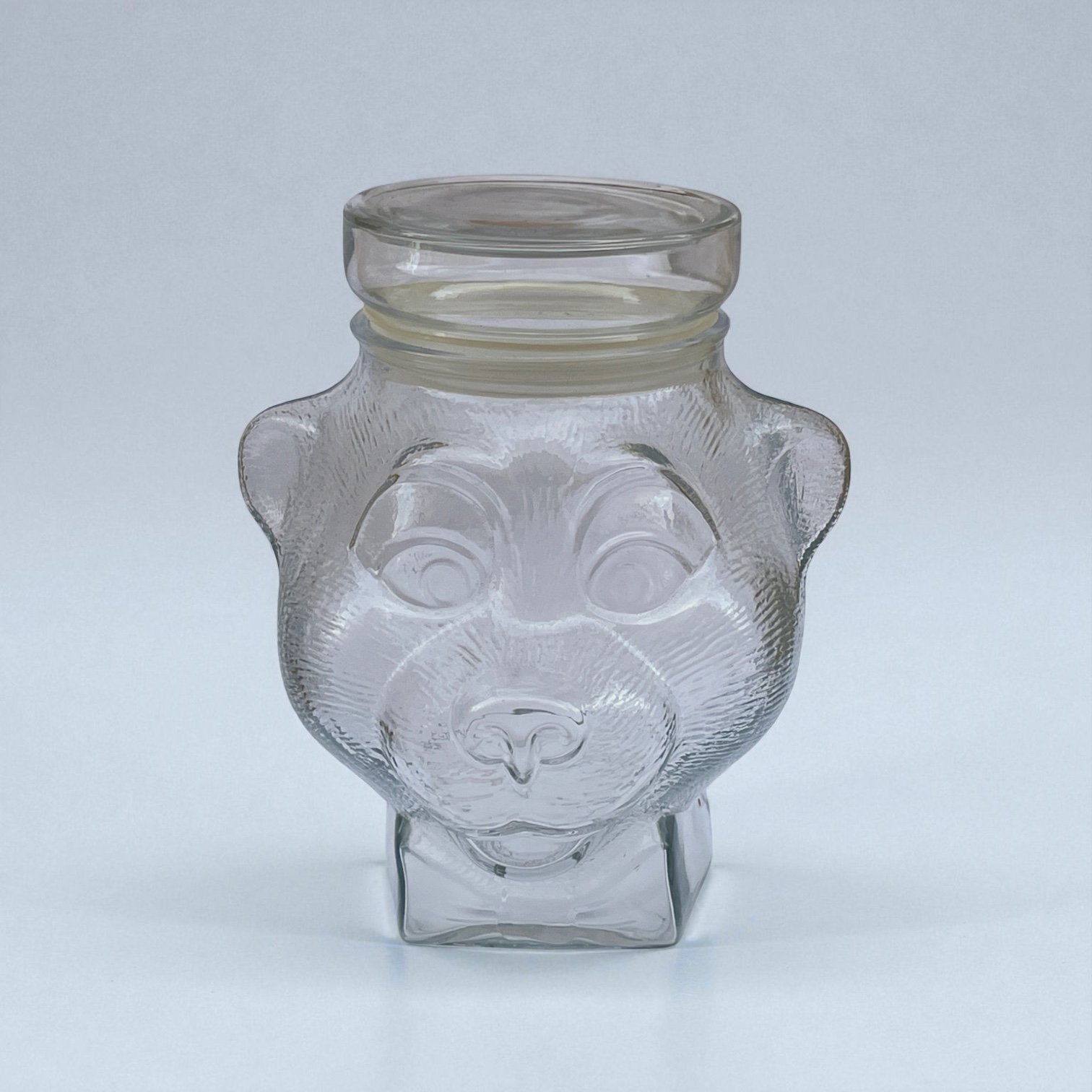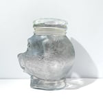 Pot à bonbons ou biscuits vintage en verre avec couvercle en forme de tête d'ourson qui était dans les boulangeries dans les années 70 - 80.