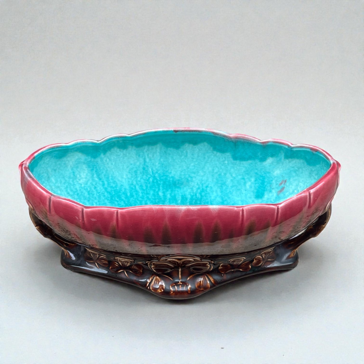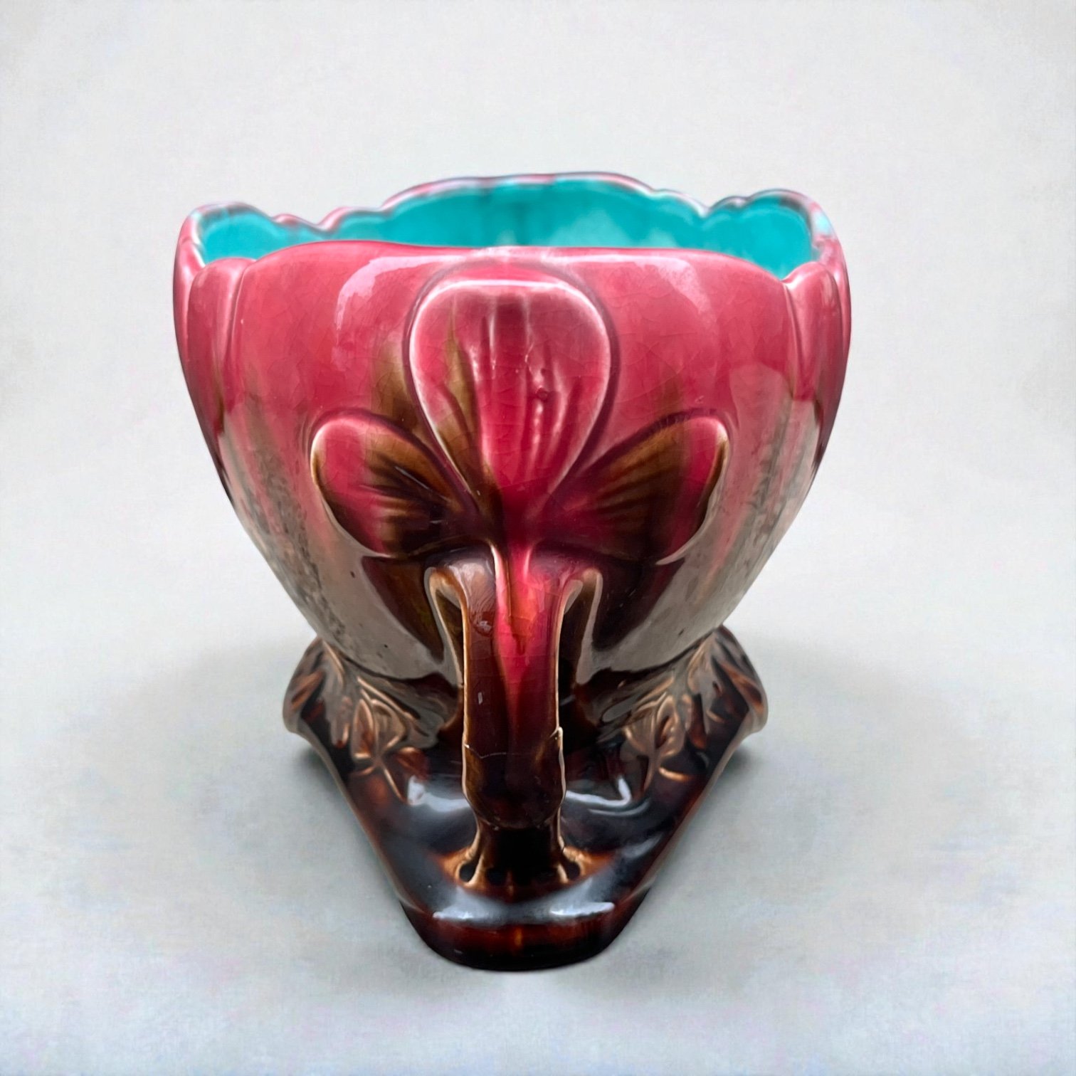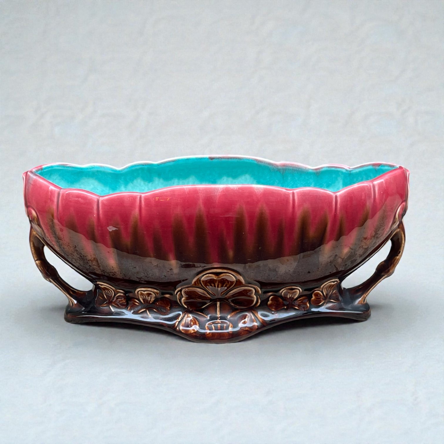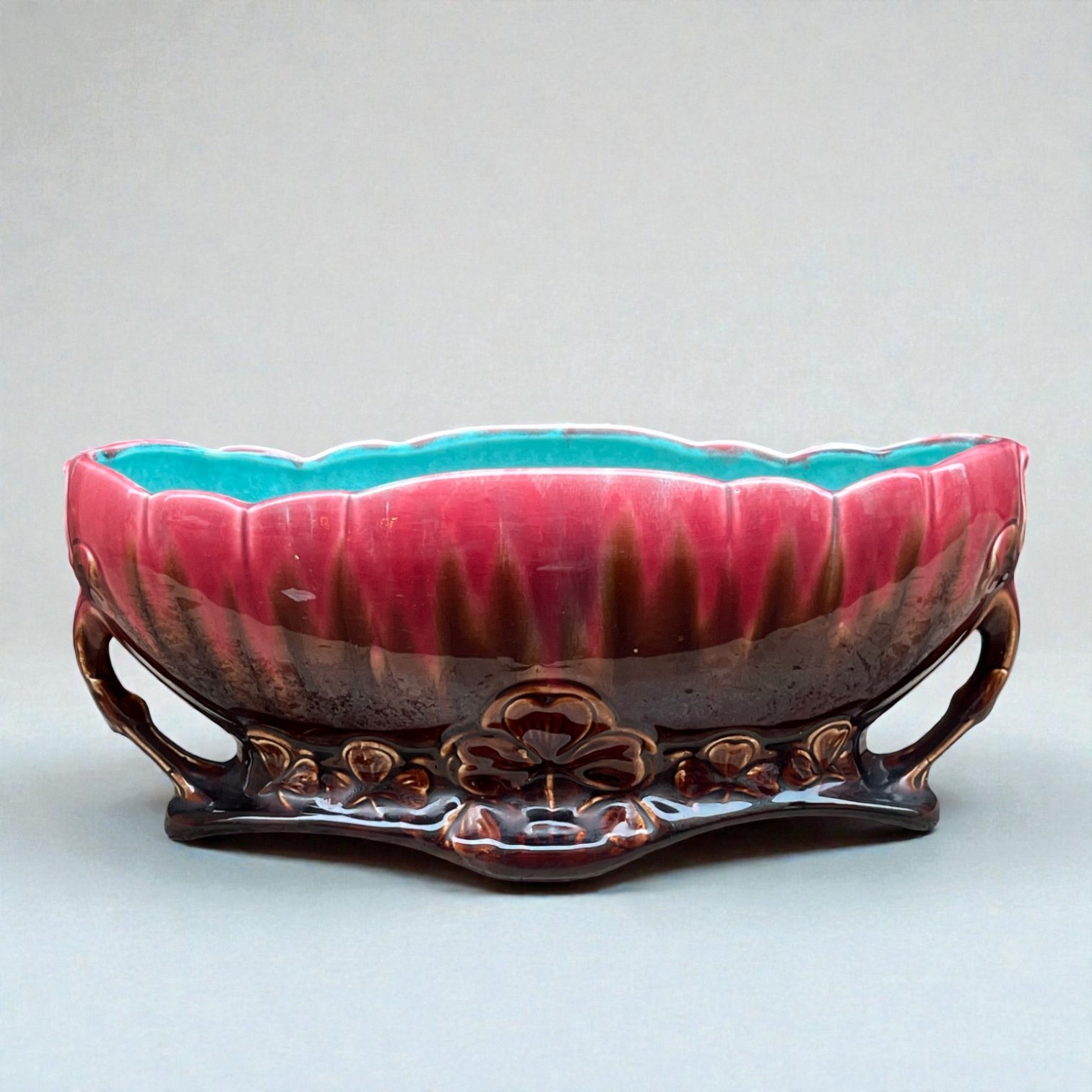 Grande jardinière Art Nouveau en poterie d'art datant de 1920 en céramique émaillée marron rose et bleu turquoise.