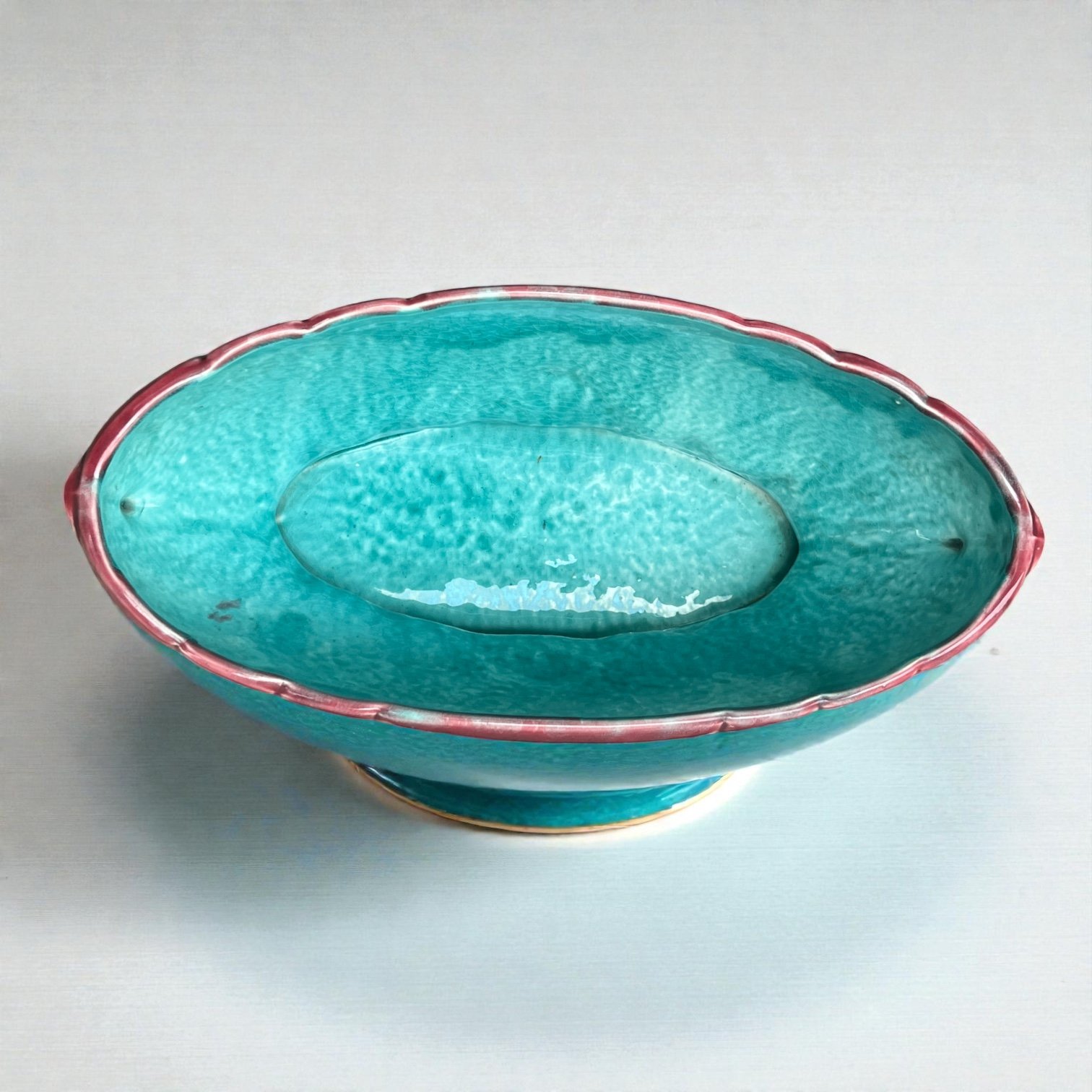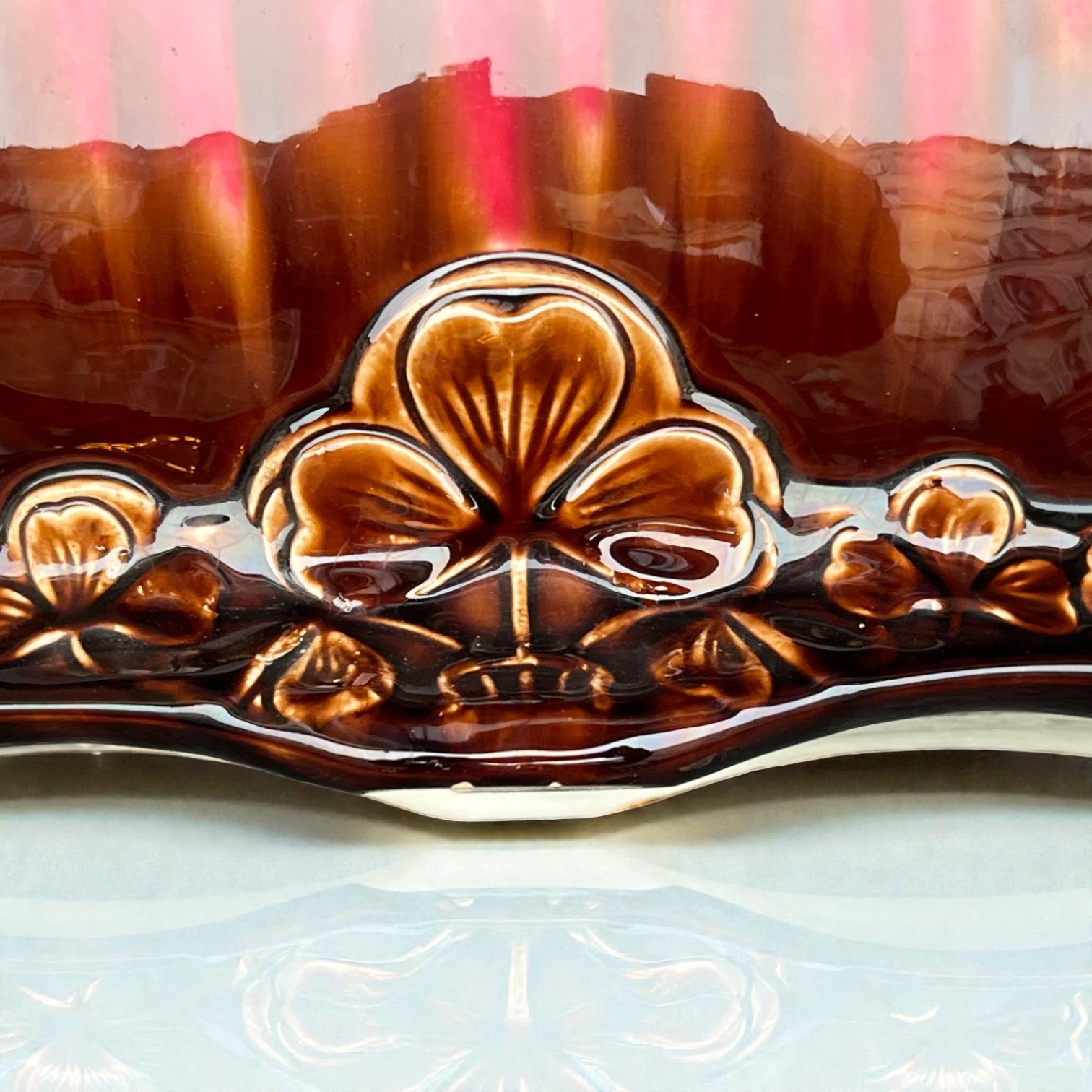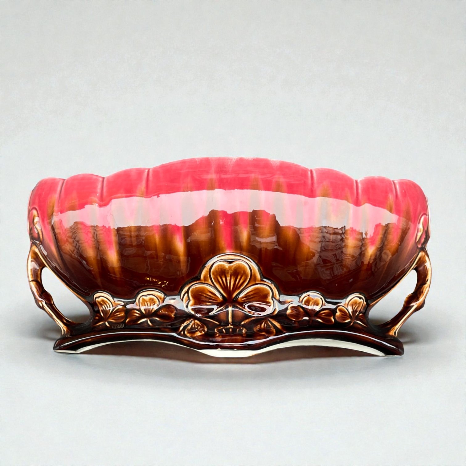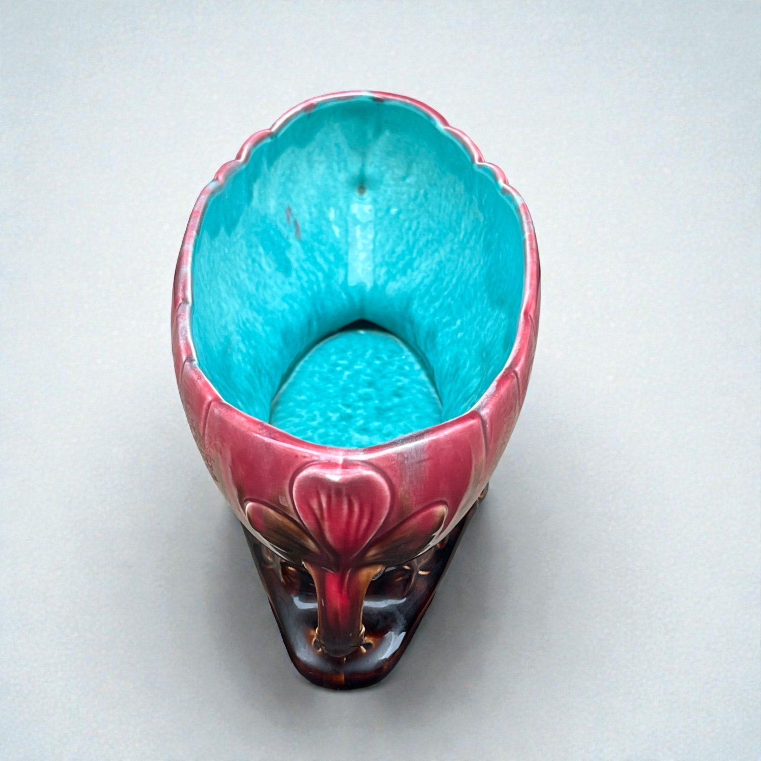 Grande jardinière Art Nouveau en poterie d'art datant de 1920 en céramique émaillée marron rose et bleu turquoise.