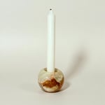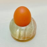 Cet objet polyvalent peut servir de coquetier, de photophore ou de bougeoir pour bougie chauffe-plat. Son veinage naturel avec des nuances de vert, de crème et quelques touches orangées lui donne un charme unique.