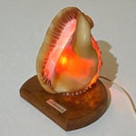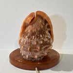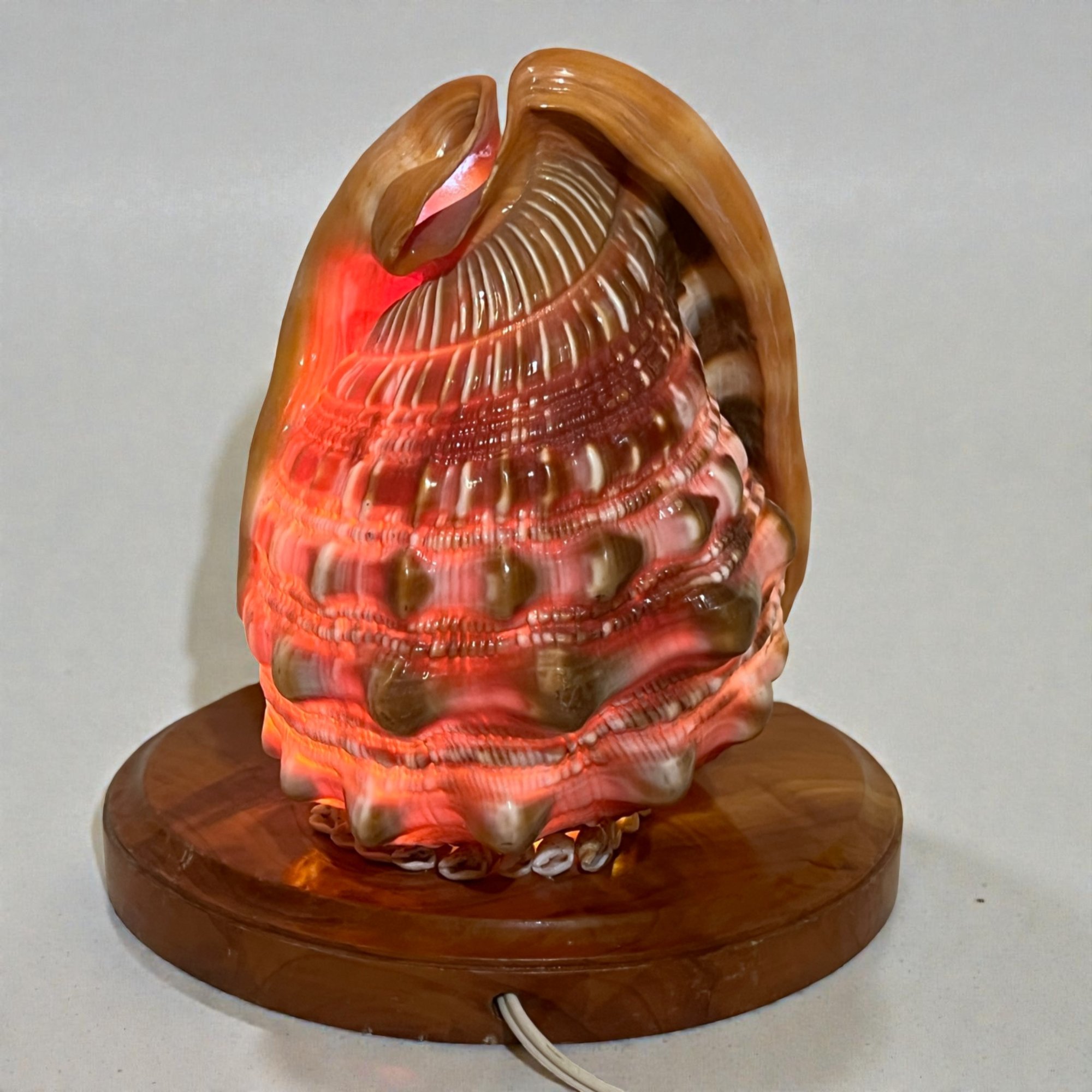 Lampe d'ambiance vintage constituée d'un véritable coquillage naturel de type "Casque rouge" (Cypraecassis rufa). Monté sur un socle en bois verni élégant, ce coquillage diffuse une lumière tamisée aux tons ambrés et chaleureux une fois allumé.
