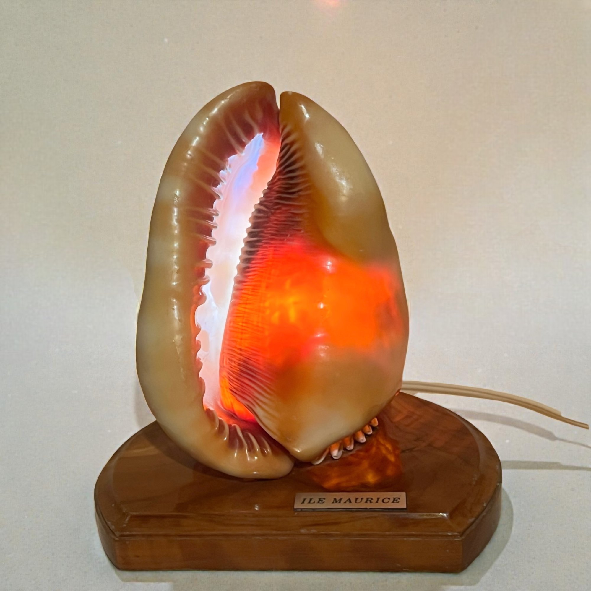Lampe coquillage vintage Casque rouge sur socle bois Île Maurice 1970 décoration bord de mer