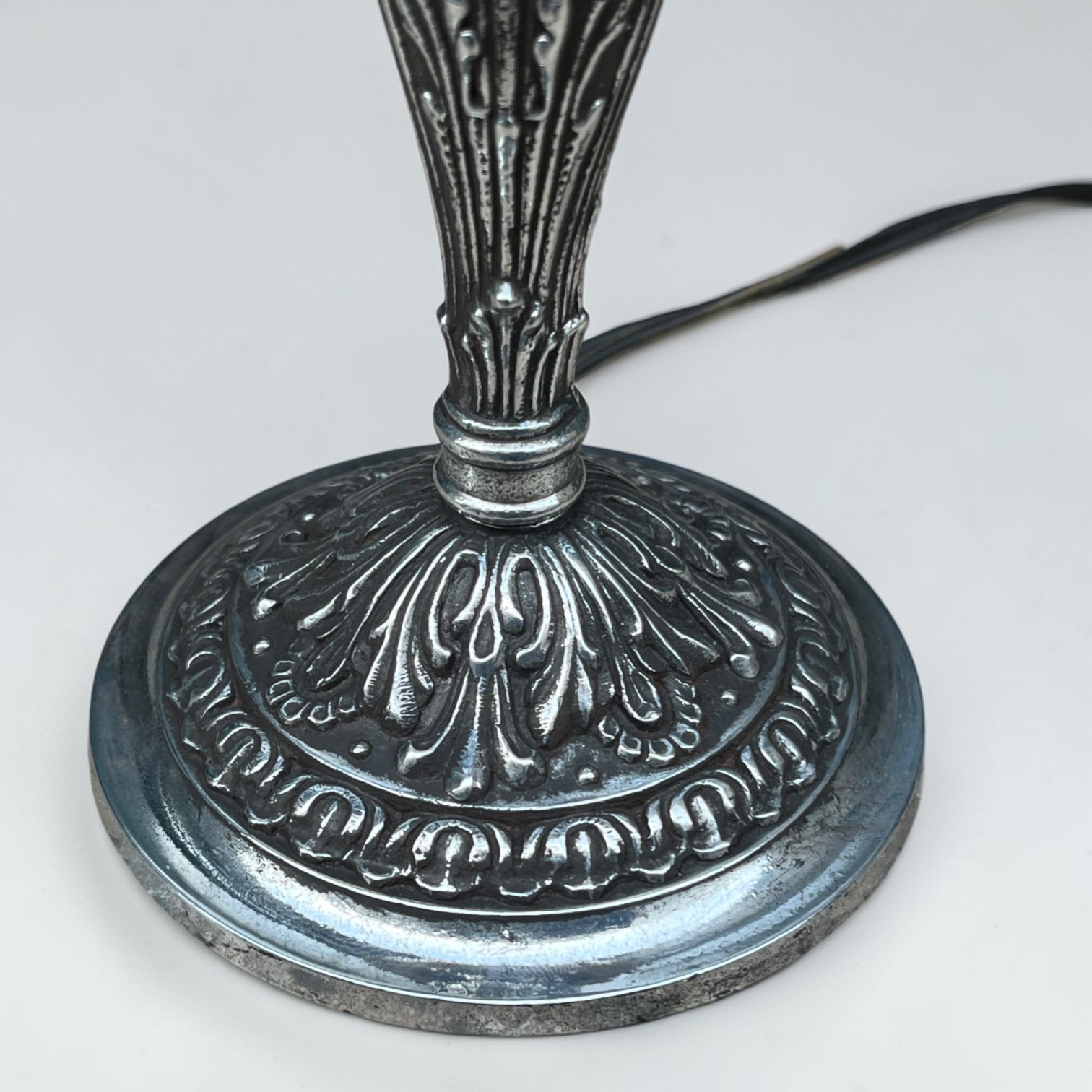 Lampe unique composée d’un véritable œuf d’autruche ancien, monté en globe lumineux sur un pied ouvragé en métal argenté aux motifs de feuillages et d'une frise de perles sur la base.
