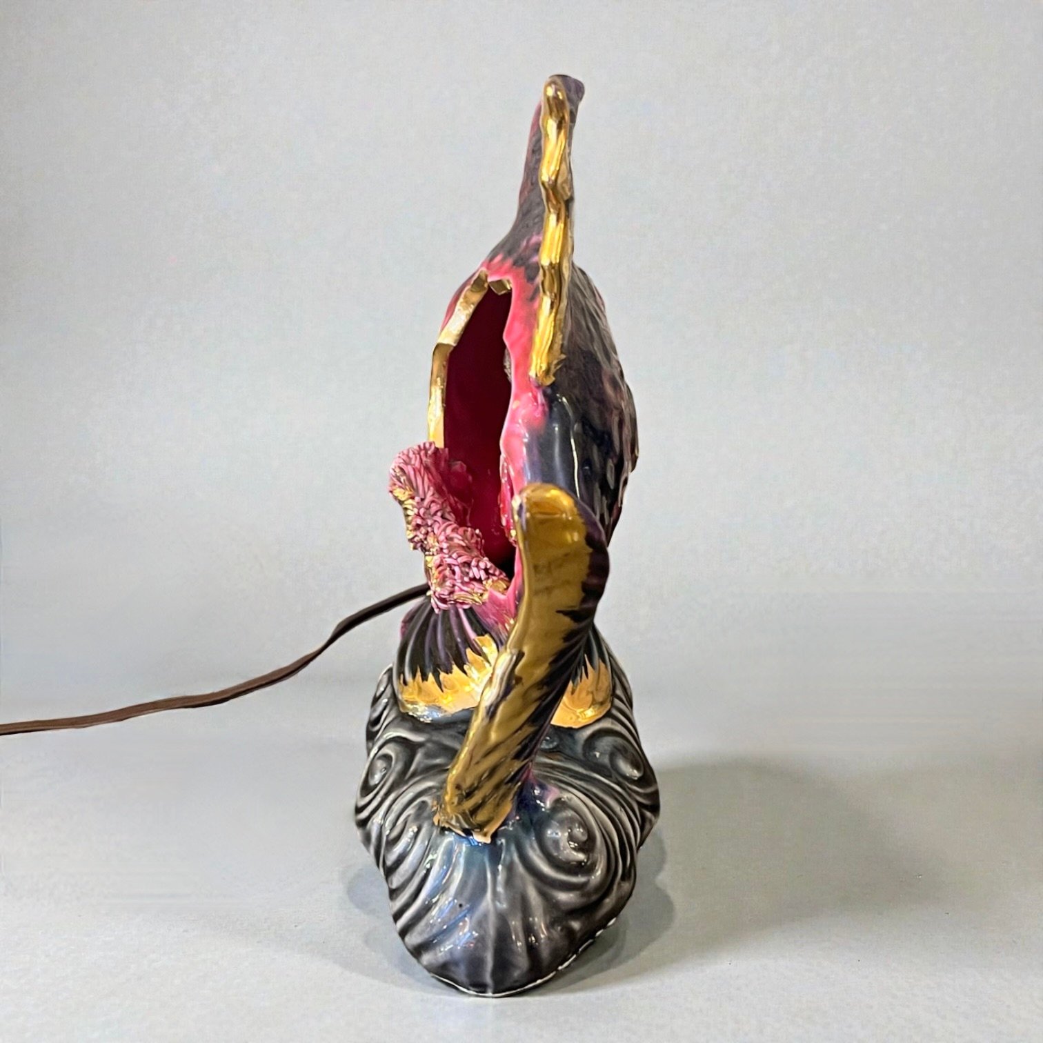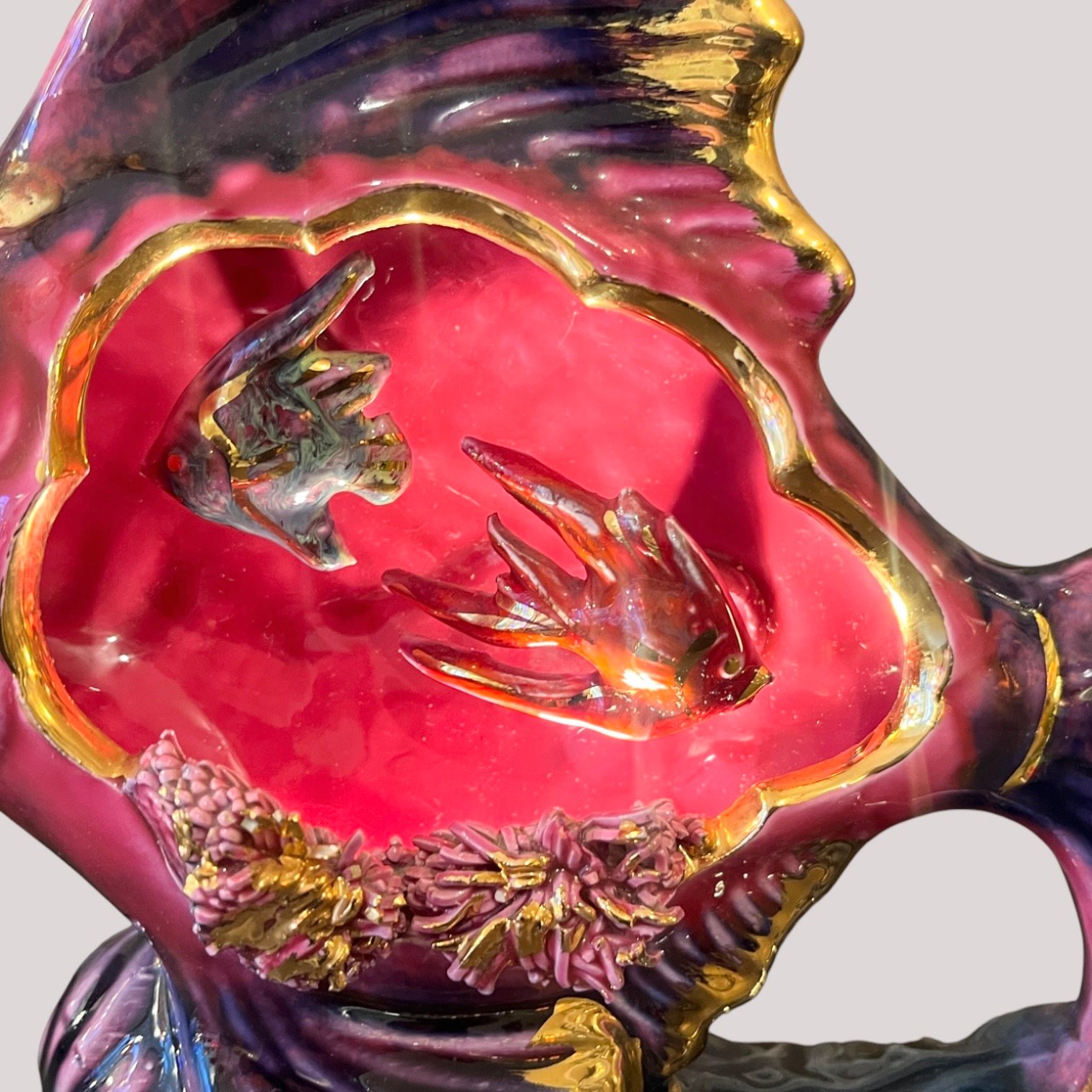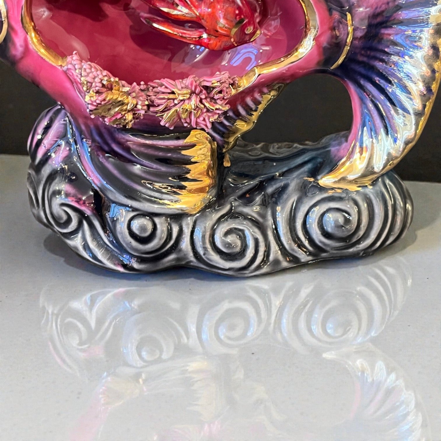 La céramique présente un glaçage irisé aux reflets violets et roses, rehaussée par de superbes détails à l'or fin sur les nageoires et les écailles.