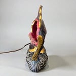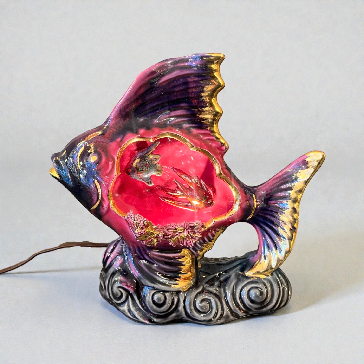 Cette lampe en forme de poisson exotique, typique de l'artisanat français de Vallauris des années 50 - 60, est un petit bijou de décoration rétro kitsch.