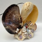 Elle est composée de grands coquillages naturels, d’ormeaux nacrés, de coquillages cauris et d’éléments marins décoratifs montés sur une base coquille.
