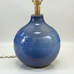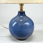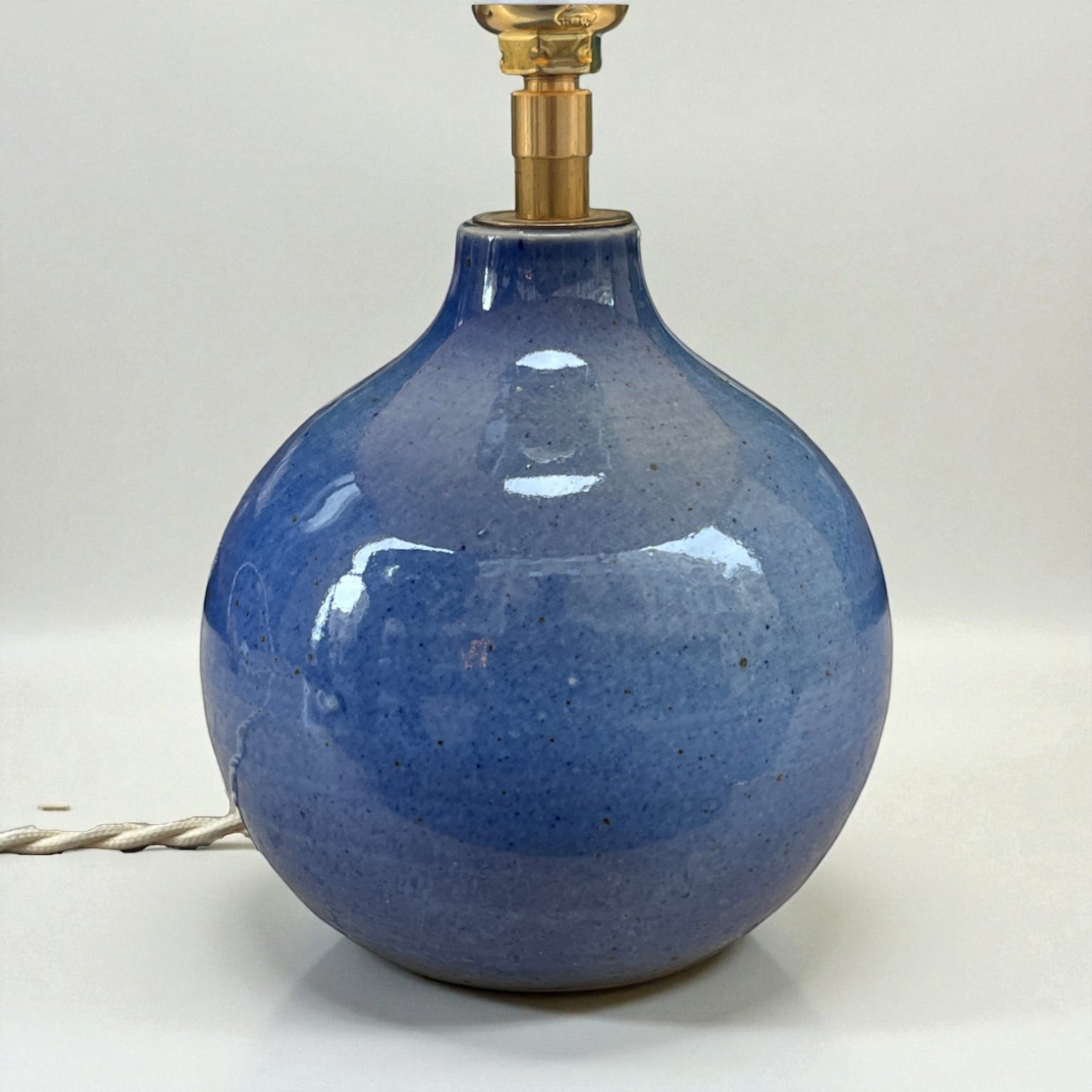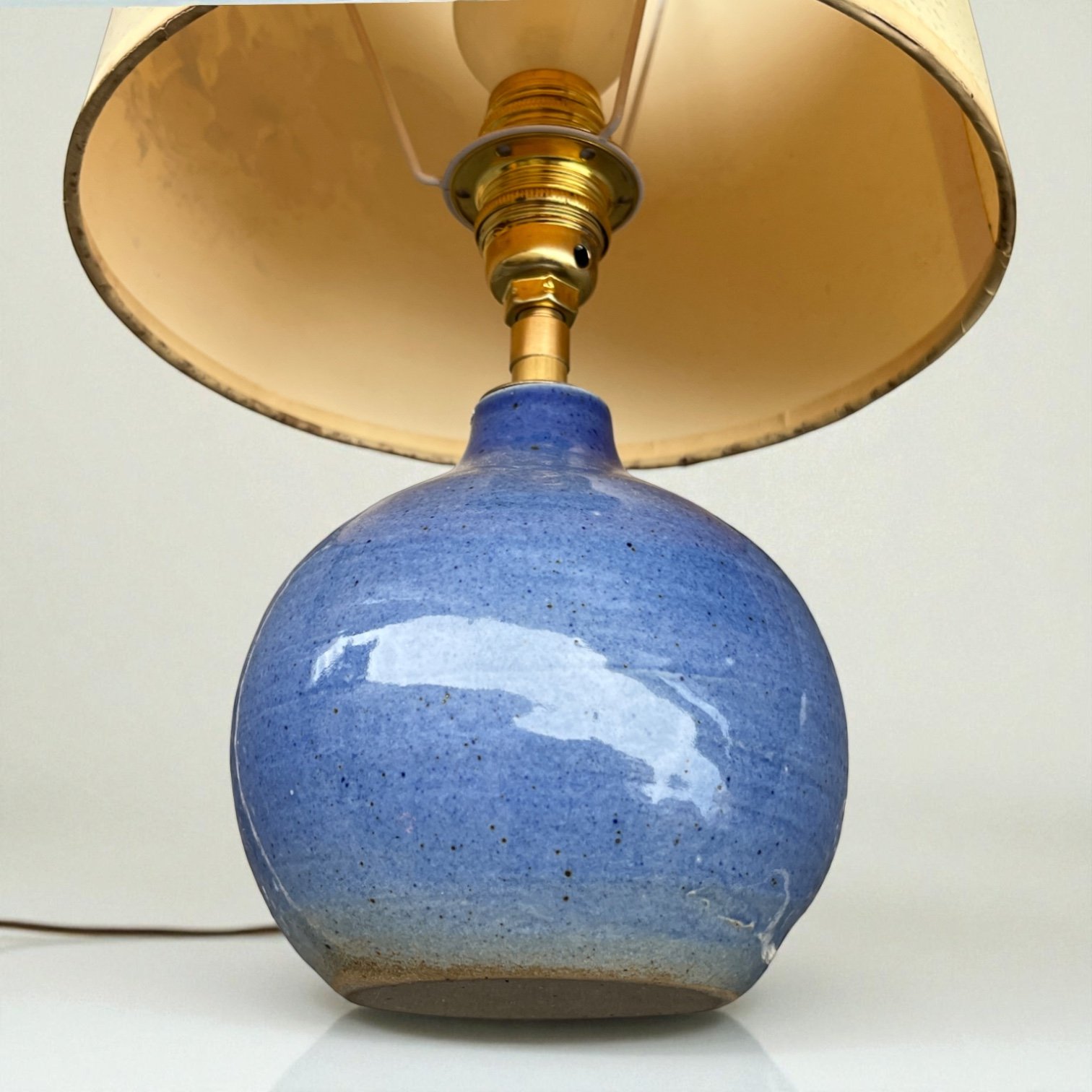 Belle lampe artisanale en grès vintage des années 70, émaillée dans les tons bleu lavande harmonieux vendue avec son abat-jour d'origine en fleurs séchées.