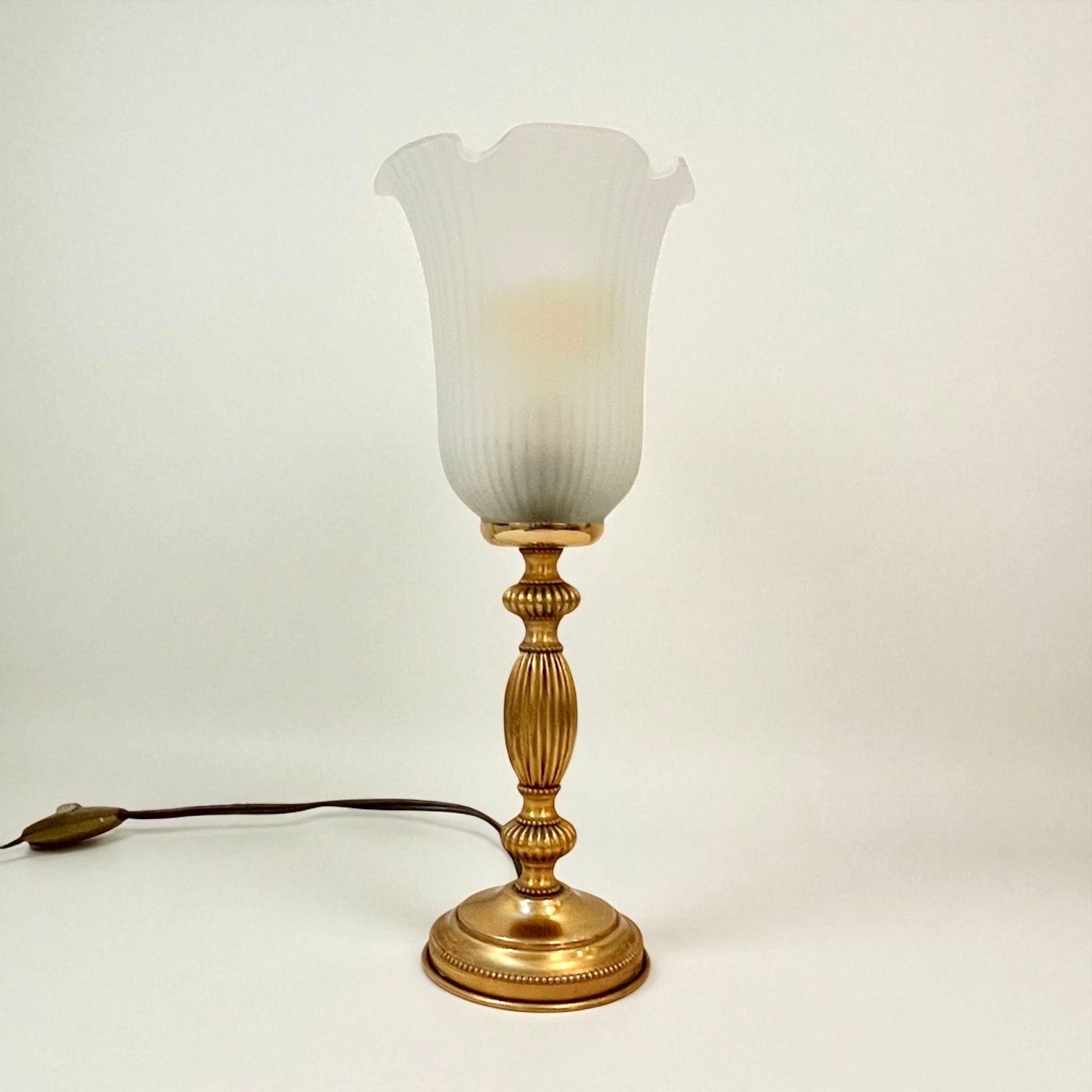 Ravissante lampe de chevet ancienne style années 1900 - 1930, composée d'un pied en laiton doré de style empire et d'une opaline forme tulipe plissée translucide.