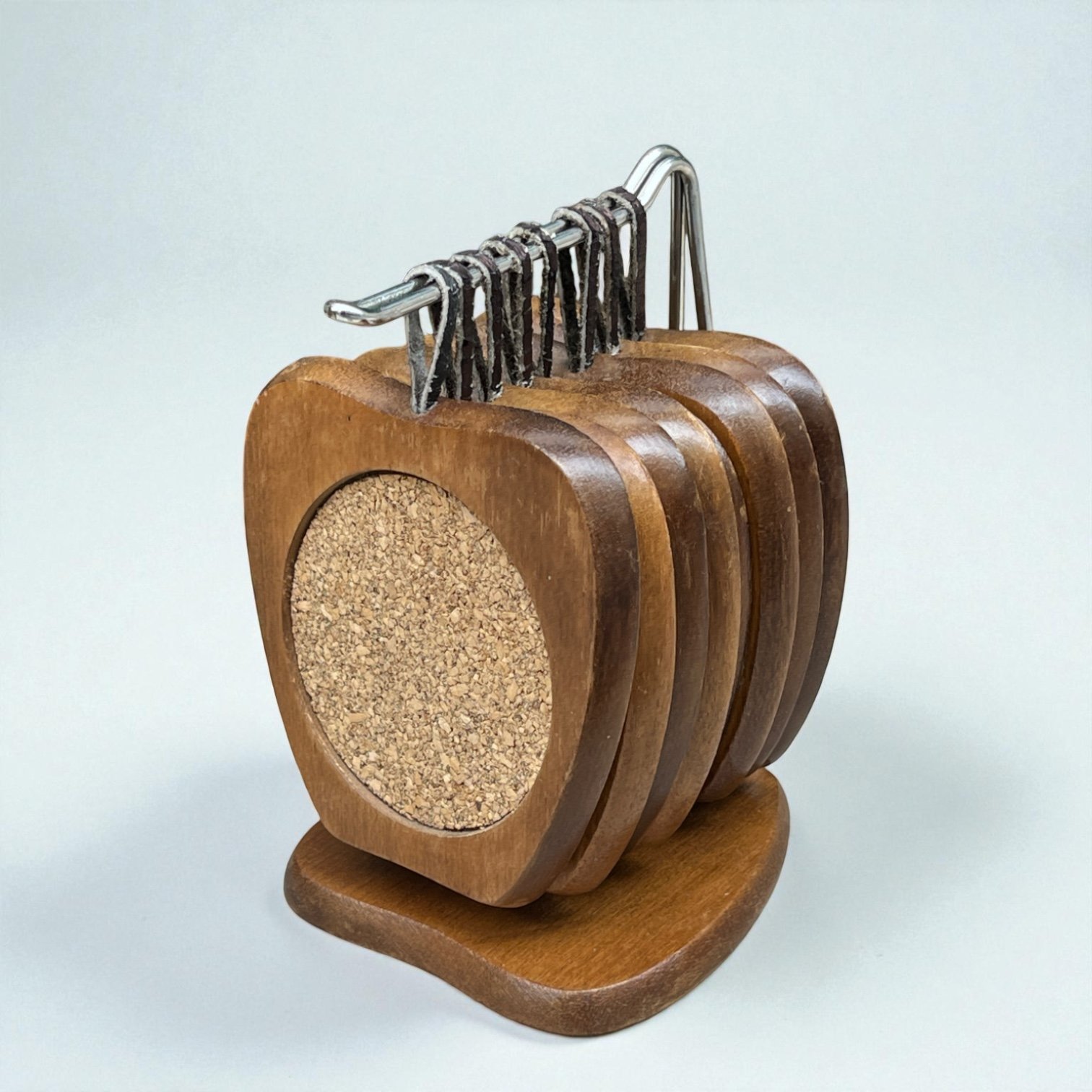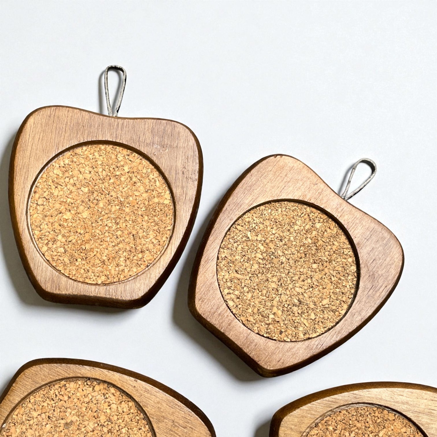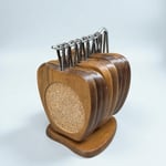 Lot de 8 dessous de verre en bois teck & liège en forme de pomme et support - 60s