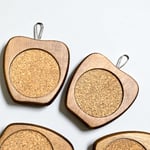 Fabriqués dans les années 70, ces sous-verres allient bois teinté et liège naturel pour une esthétique chaleureuse et une excellente protection de vos surfaces, bin petit lien en cuir pour les suspendre au support.