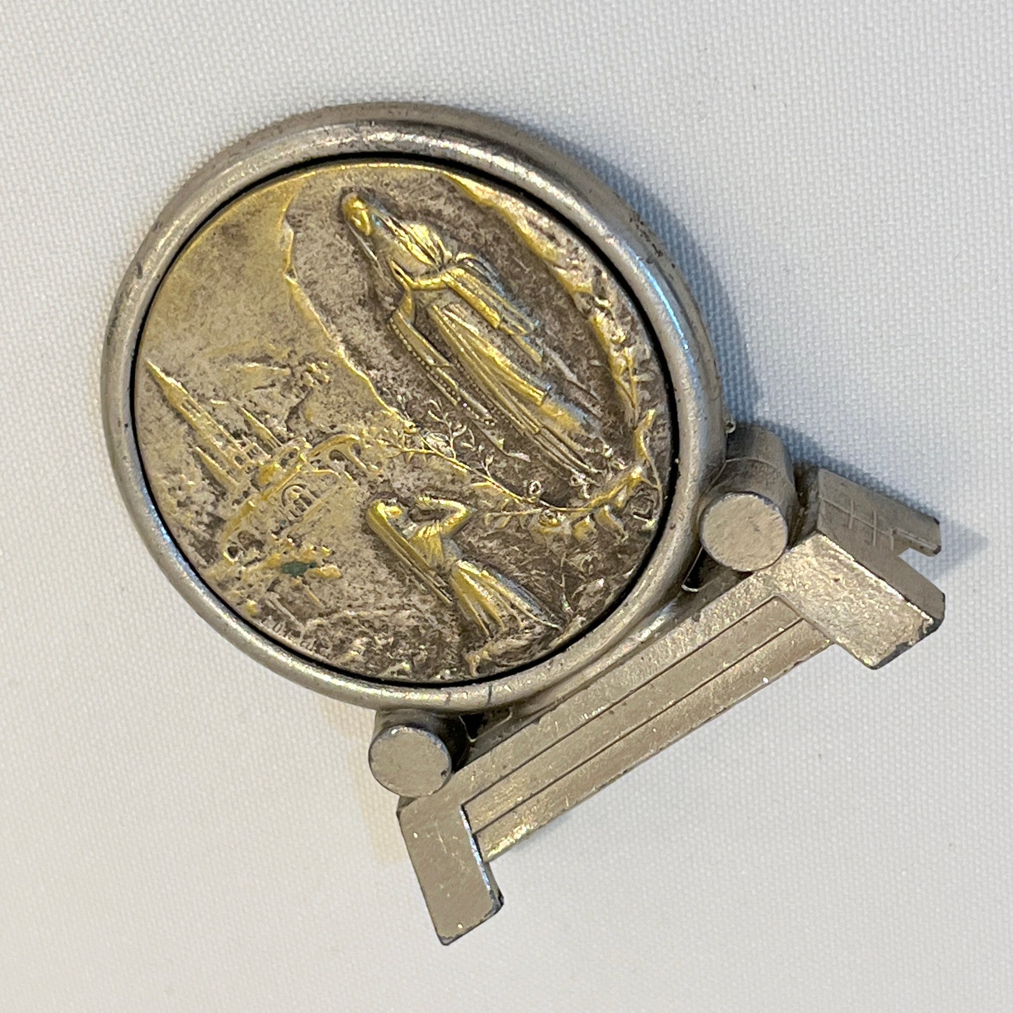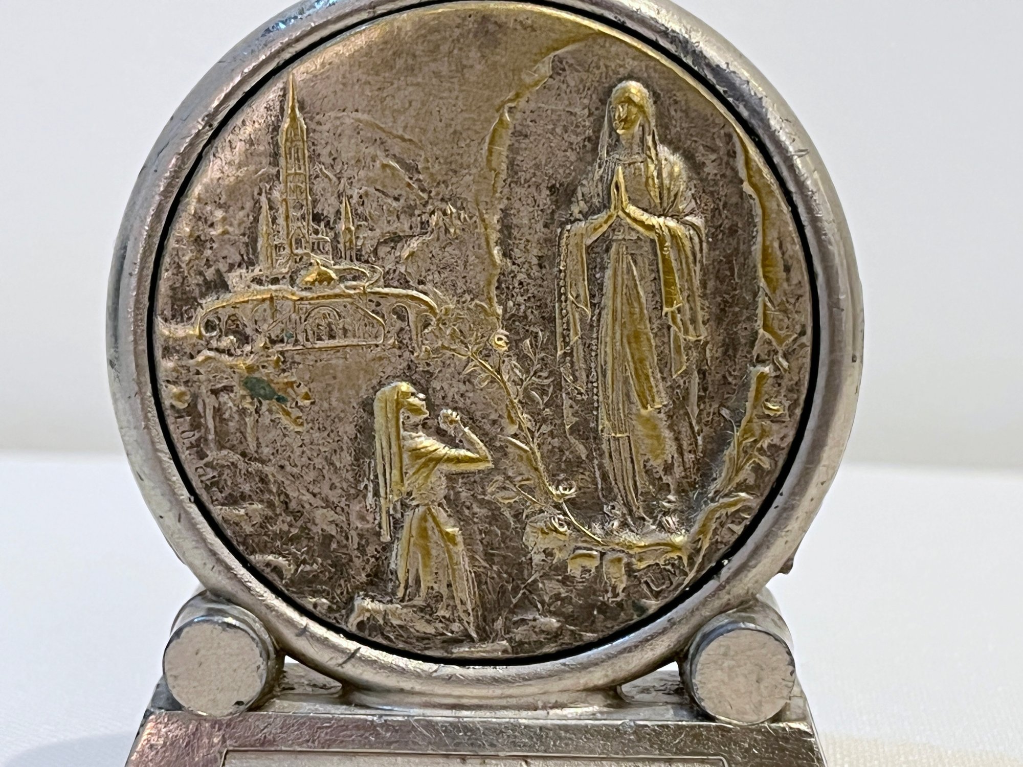 Médaille sur socle en métal argenté de La Vierge Marie - Souvenir de Lourdes 1930