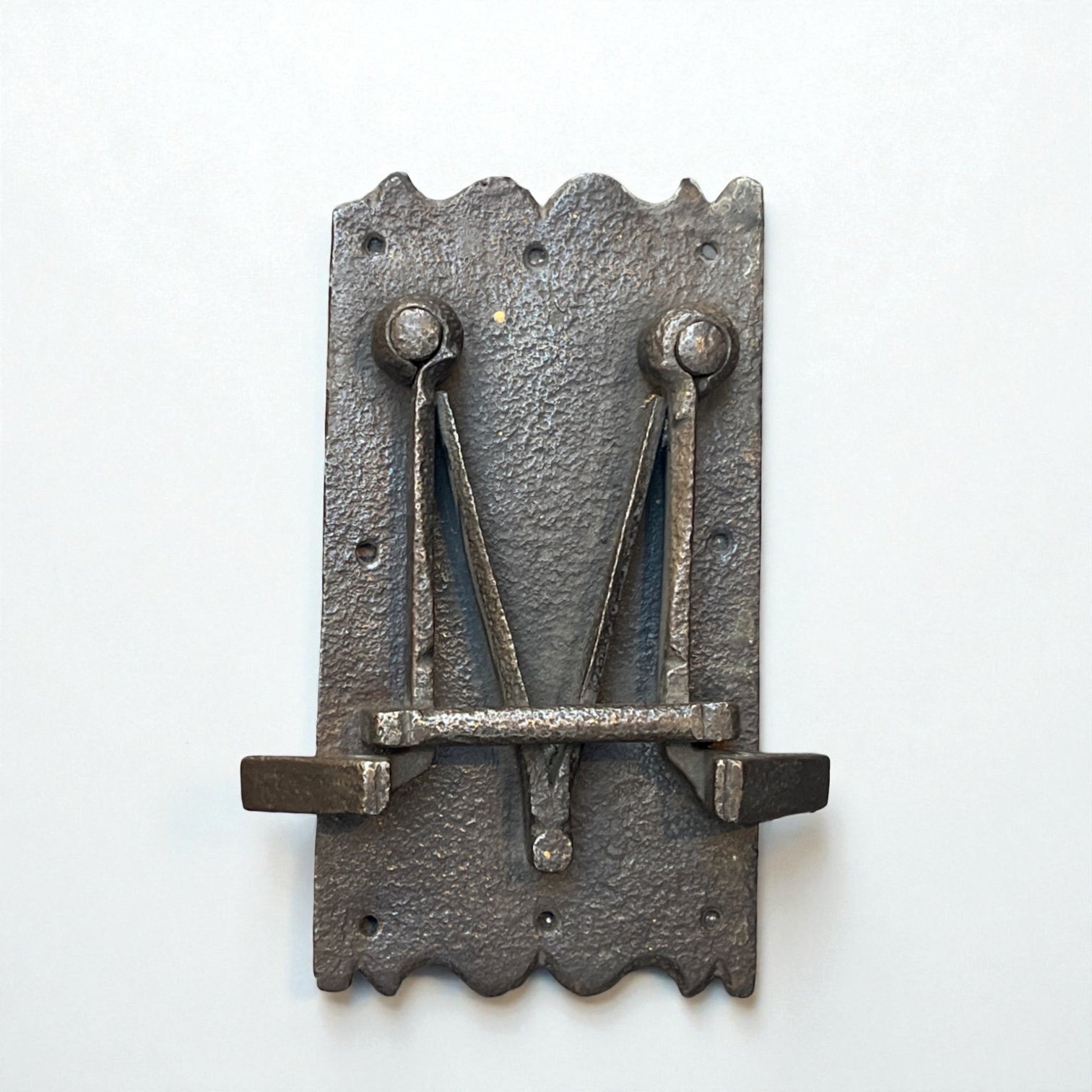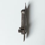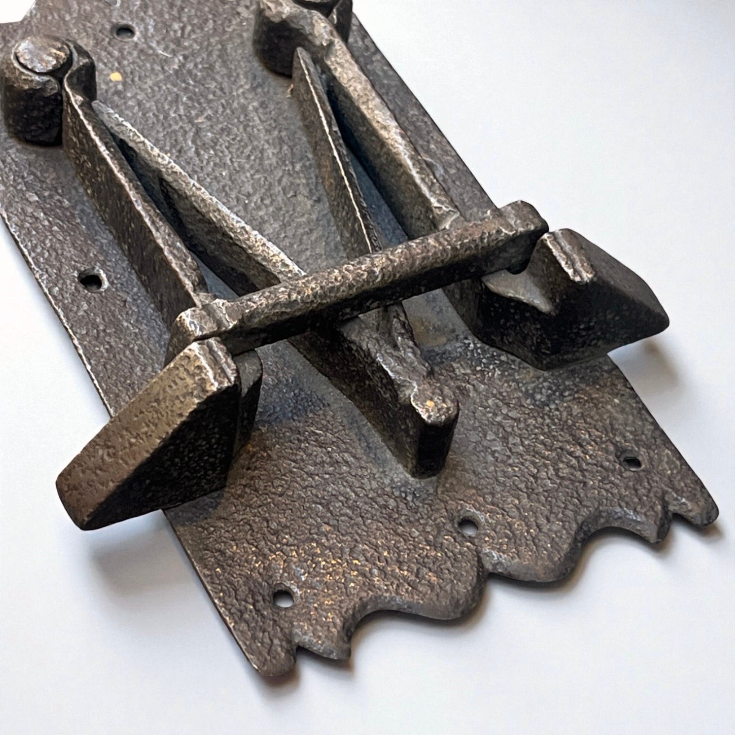 Le mécanisme est de type à double ressort, reconnaissable aux deux bras métalliques décoratifs visibles sur la face avant. Le corps de la serrure présente des bords découpés et festonnés, typiques du travail du fer de cette époque.