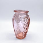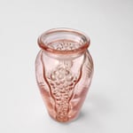 Élégant petit vase ancien de style Art Déco en verre moulé rosaline, présentant un motif plissé et de boules en relief typiques de l’esthétique des années 1930.