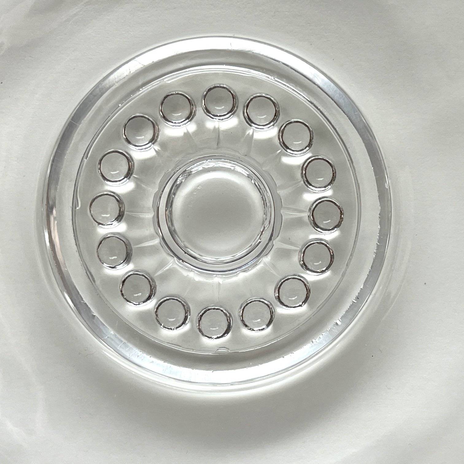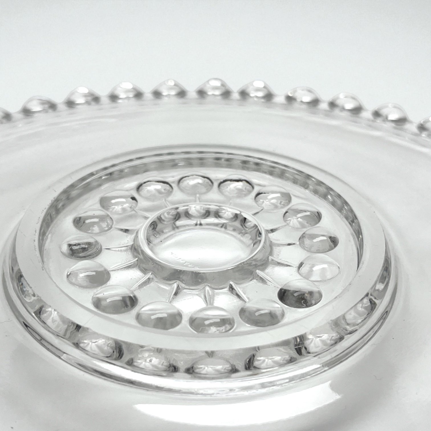 Très beau plat en verre pressé moulé des années 1900, orné d’un décor raffiné de perles en relief tout autour du bord, typique des créations françaises de l’époque Art Déco (début XXᵉ siècle).