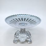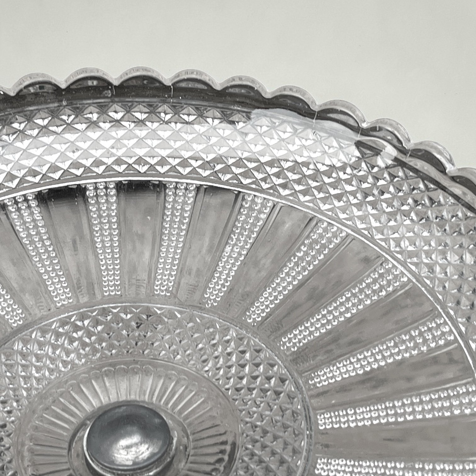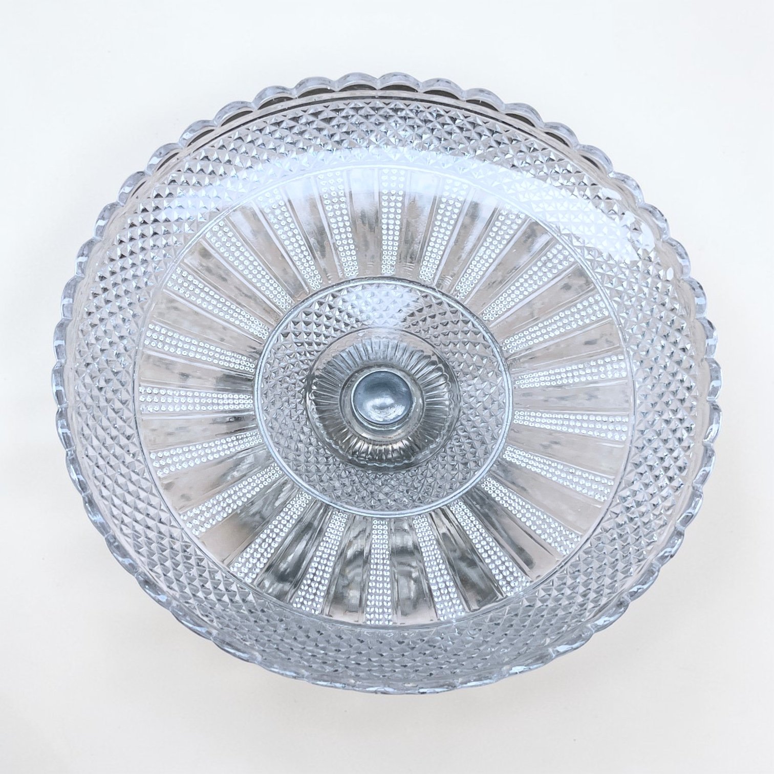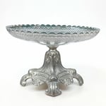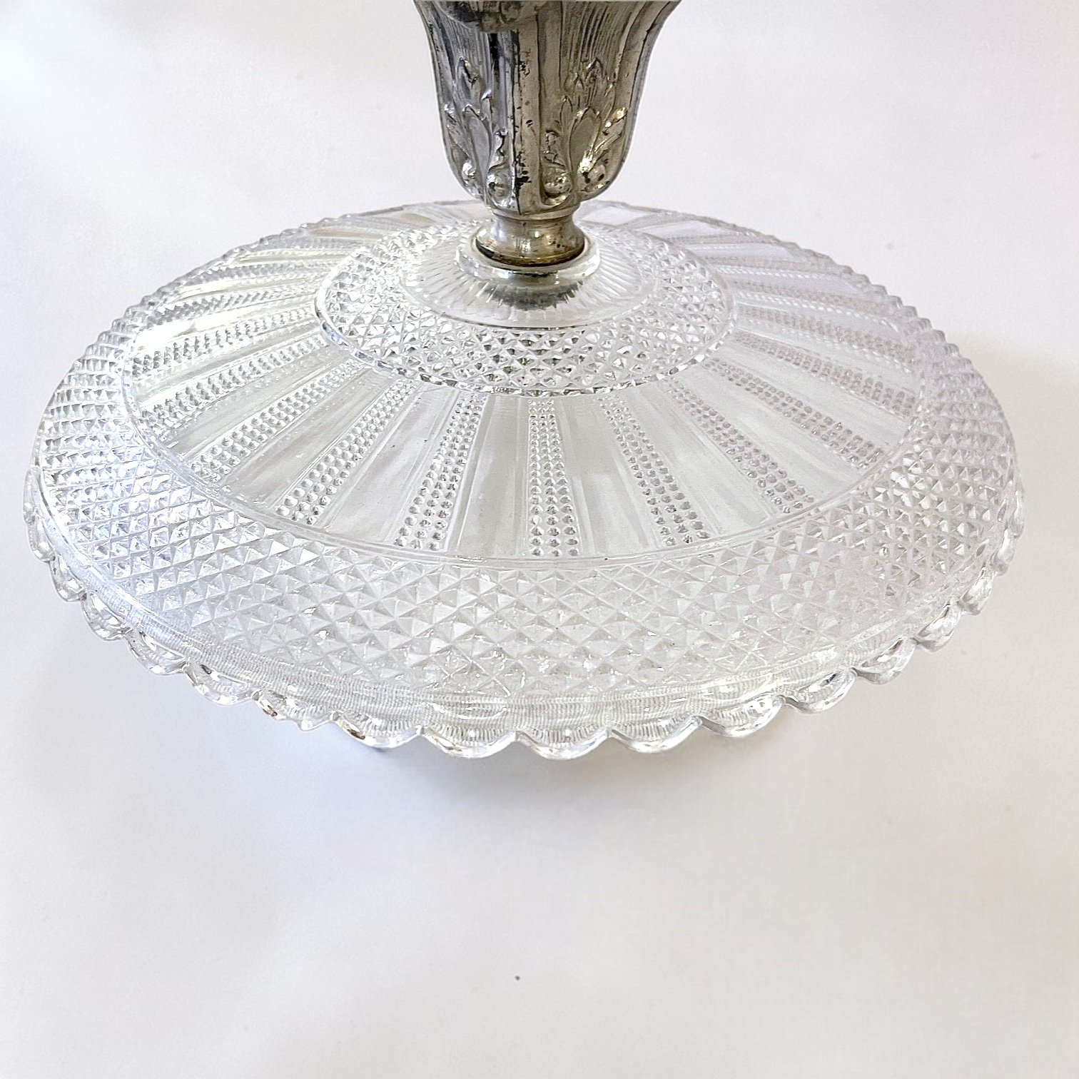 Elégant compotier ou coupe à fruits composés d'une vasque en verre moulé de haute qualité avec des motifs en pointes de diamant et des rayures rayonnantes. Le bord est festonné, apportant une finition raffinée.