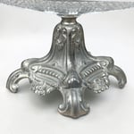 Le socle est en métal argenté richement travaillé. On y observe un décor rocaille typique avec des motifs de fleurs, de feuilles d'acanthe et des pieds cambrés.