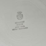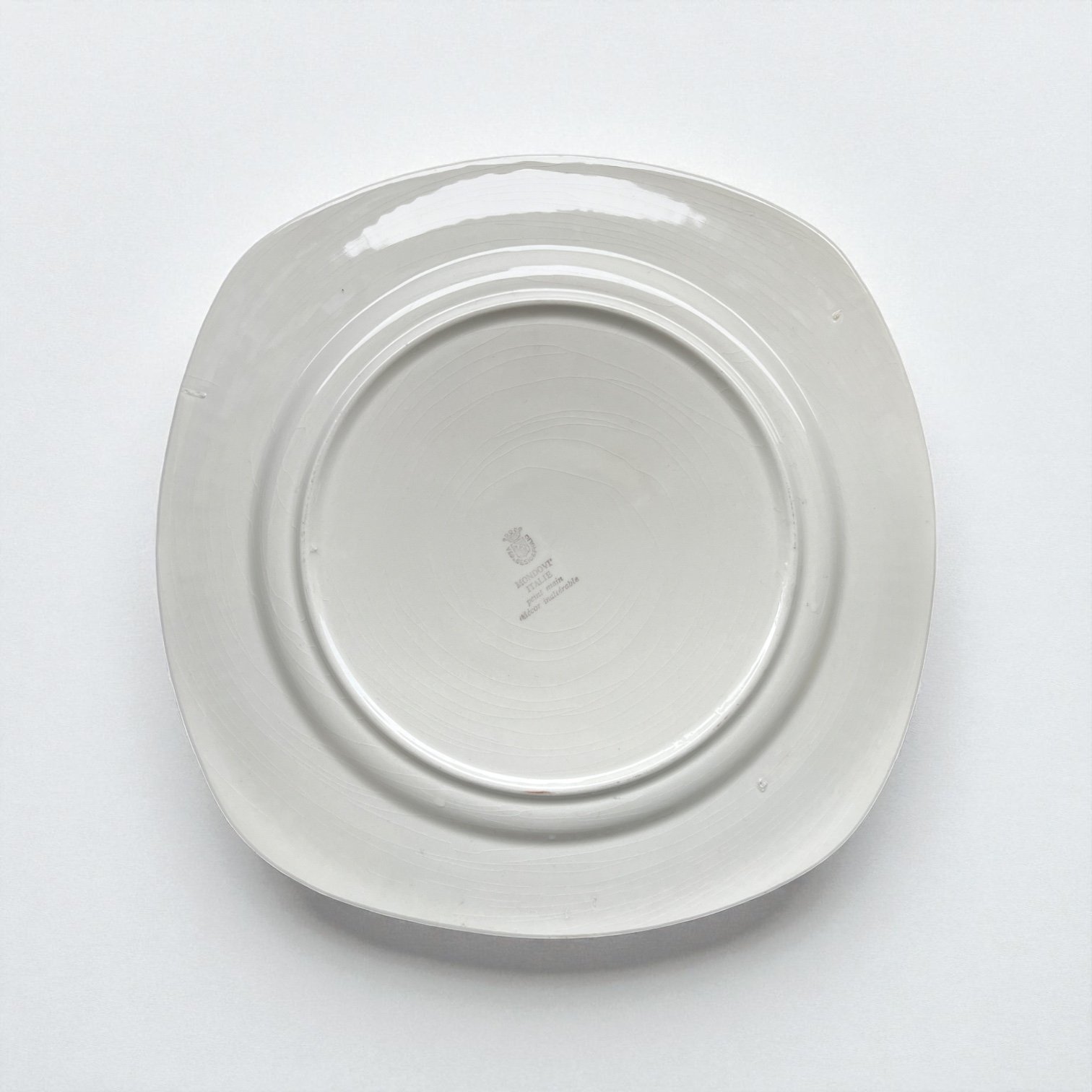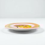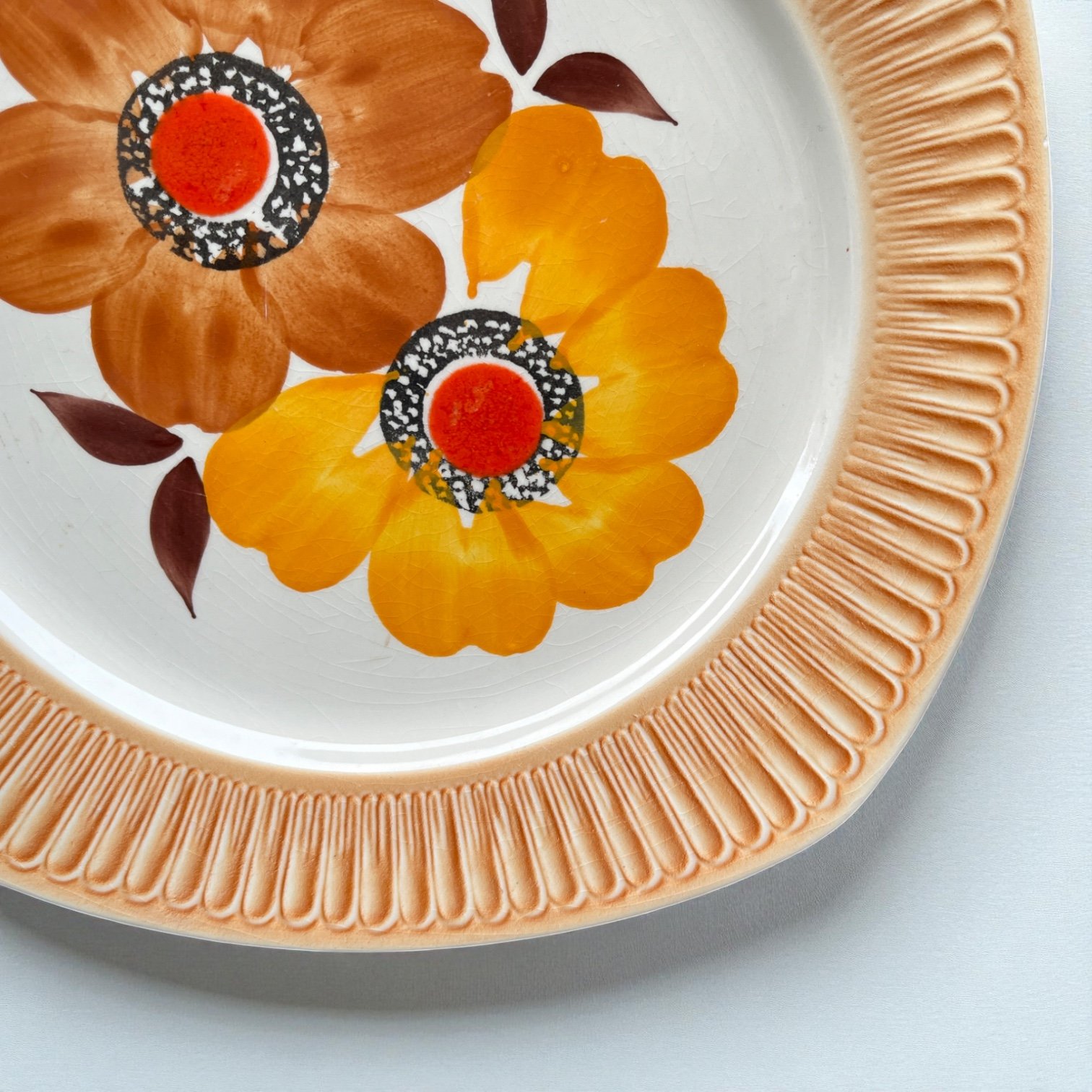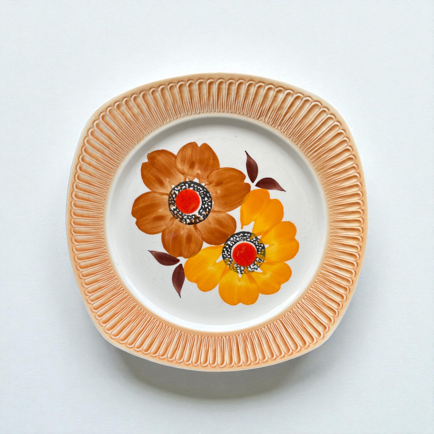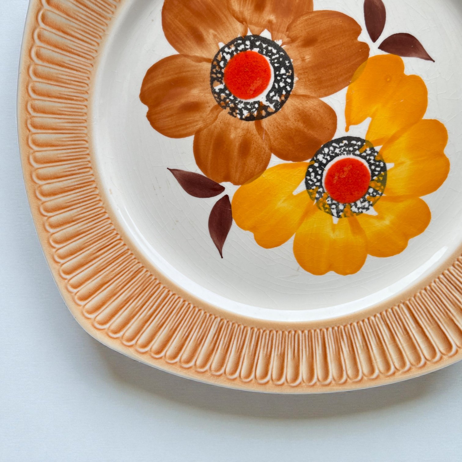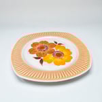 Grand plat vintage 70 aux angles arrondis et larges bords orangés striés, avec décor peint main inaltérable par la manufacture de Mondovi en Italie dans les années 70.