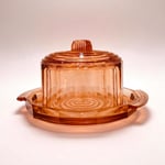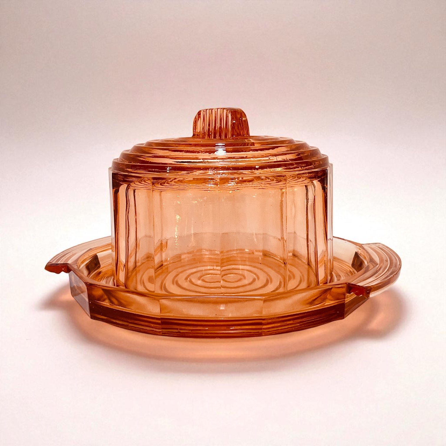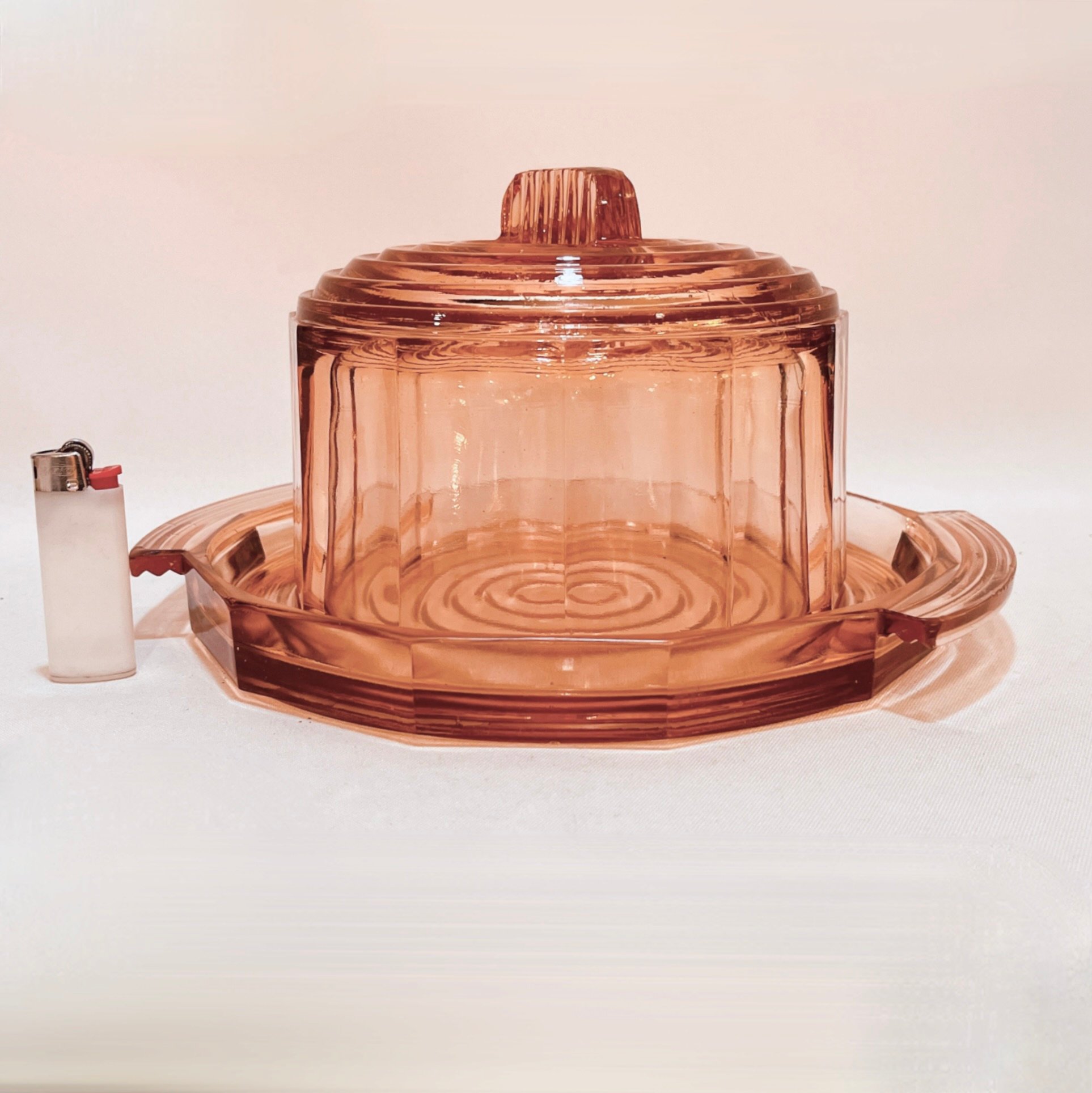 Plateau et cloche vintage Art Déco en verre rose rosaline - Gâteau ou fromage