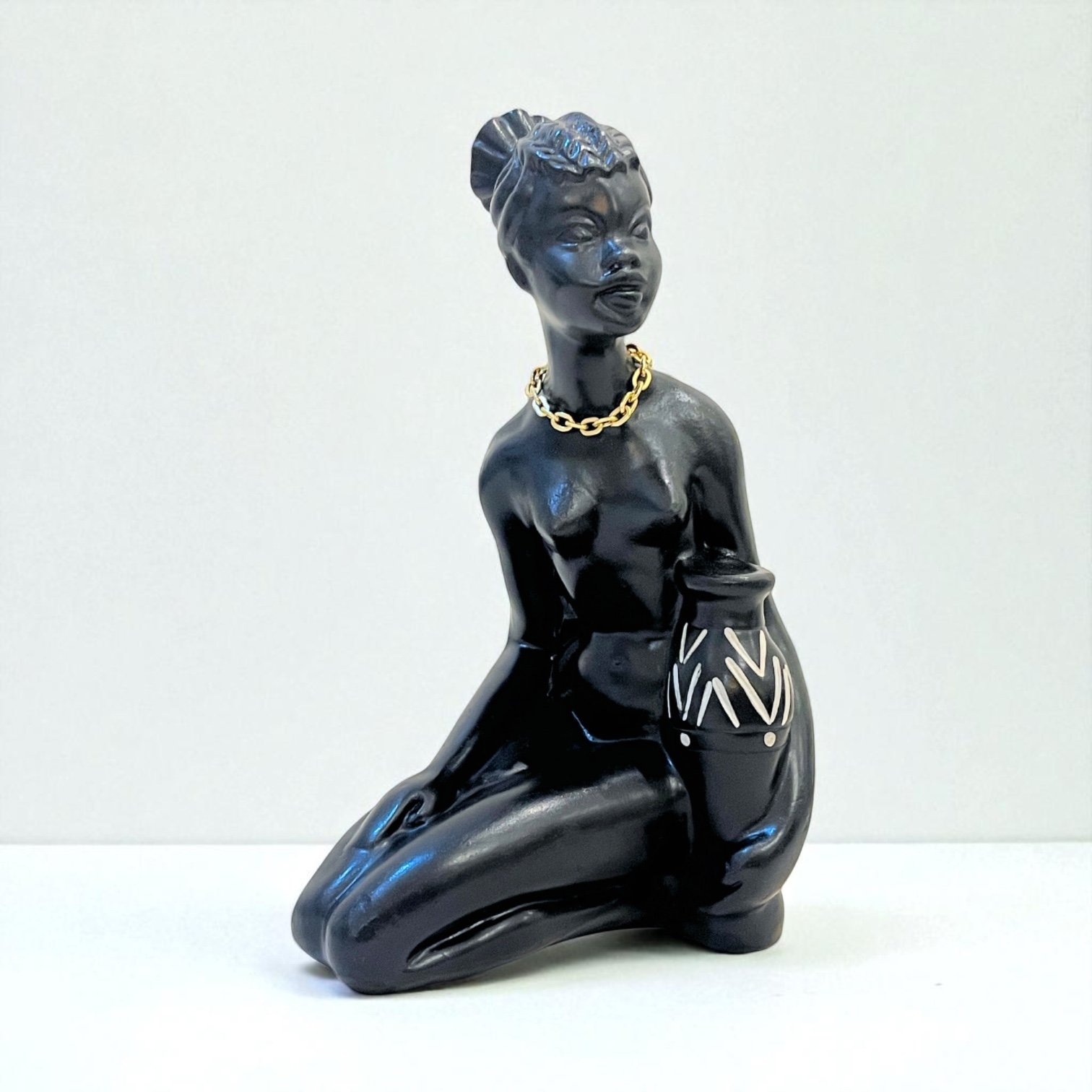 Belle statue des années 30 en plâtre peint en noir et doré représentant une jeune femme africaine stylisée, nue agenouillée, tenant un pot, avec un collier doré et des motifs géométriques blancs sur la jarre